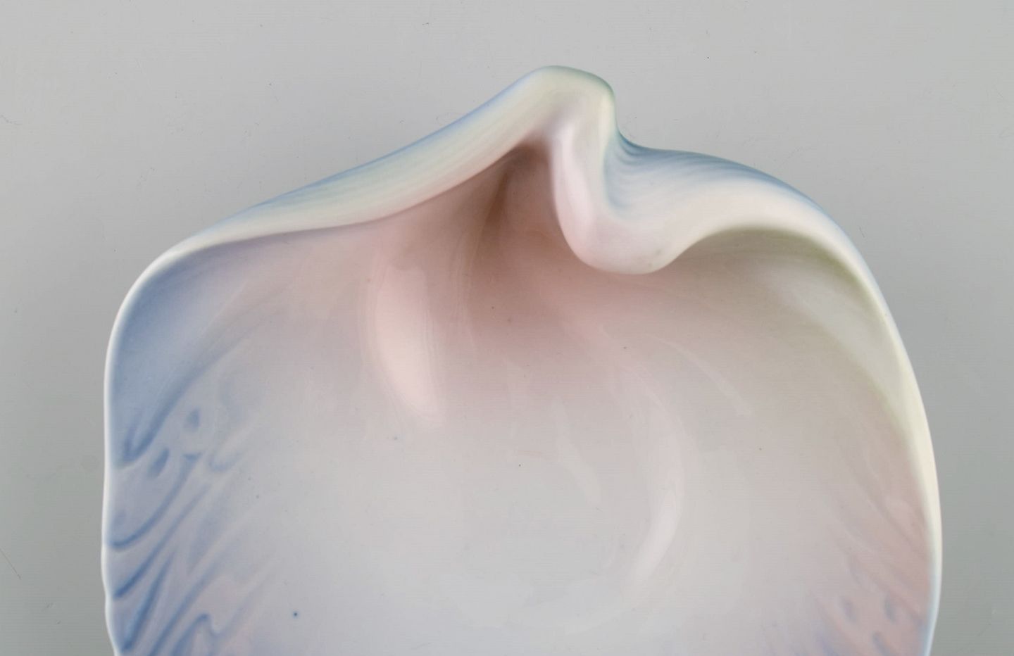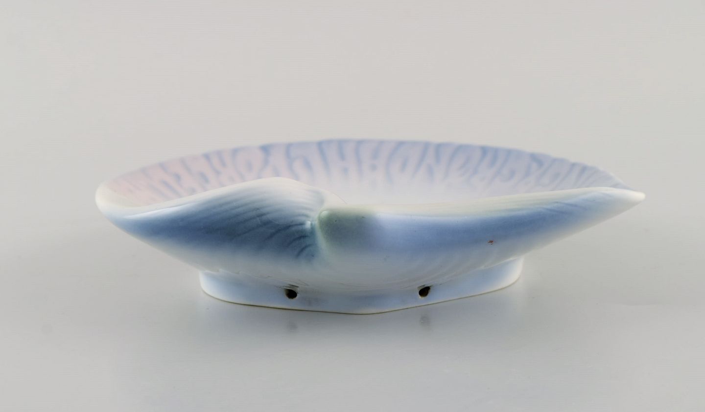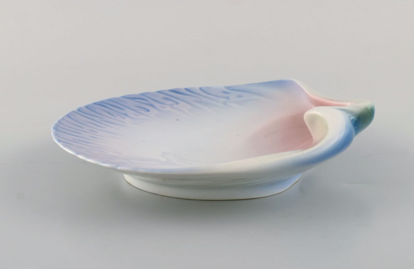 Bing & Grøndahl art nouveau asiet formet som muslingeskal. Tekst modelleret i relief "Bing & Grøndal's porcelæn". Dateret 1914-1915. Måler: 16,5 x 16 cm. I flot stand. Stemplet.