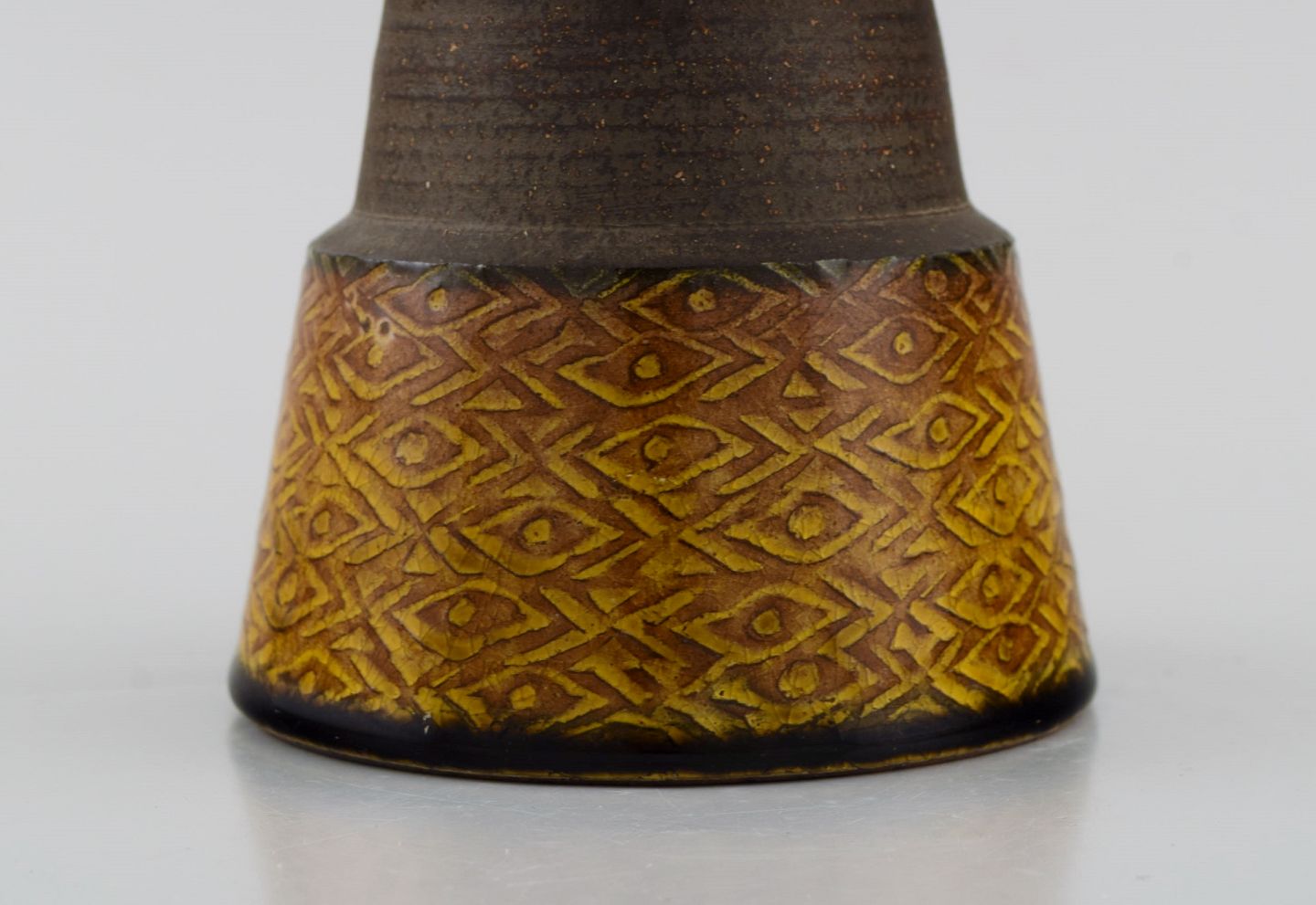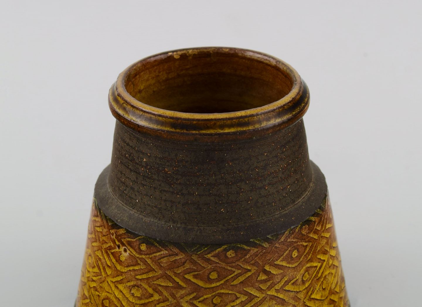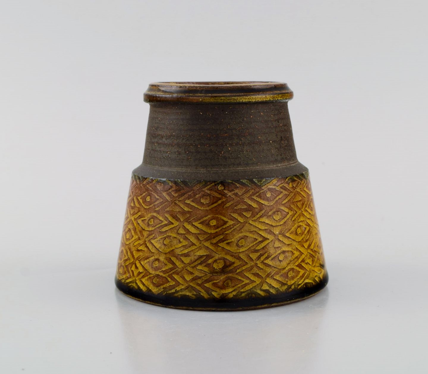 Nils Kähler (1906-1979) for Kähler. Vase in glazed stoneware. Beautiful glaze in mustard yellow shades. 1960s. Measures: 10.5 x 10 cm. In excellent condition. Signed.
