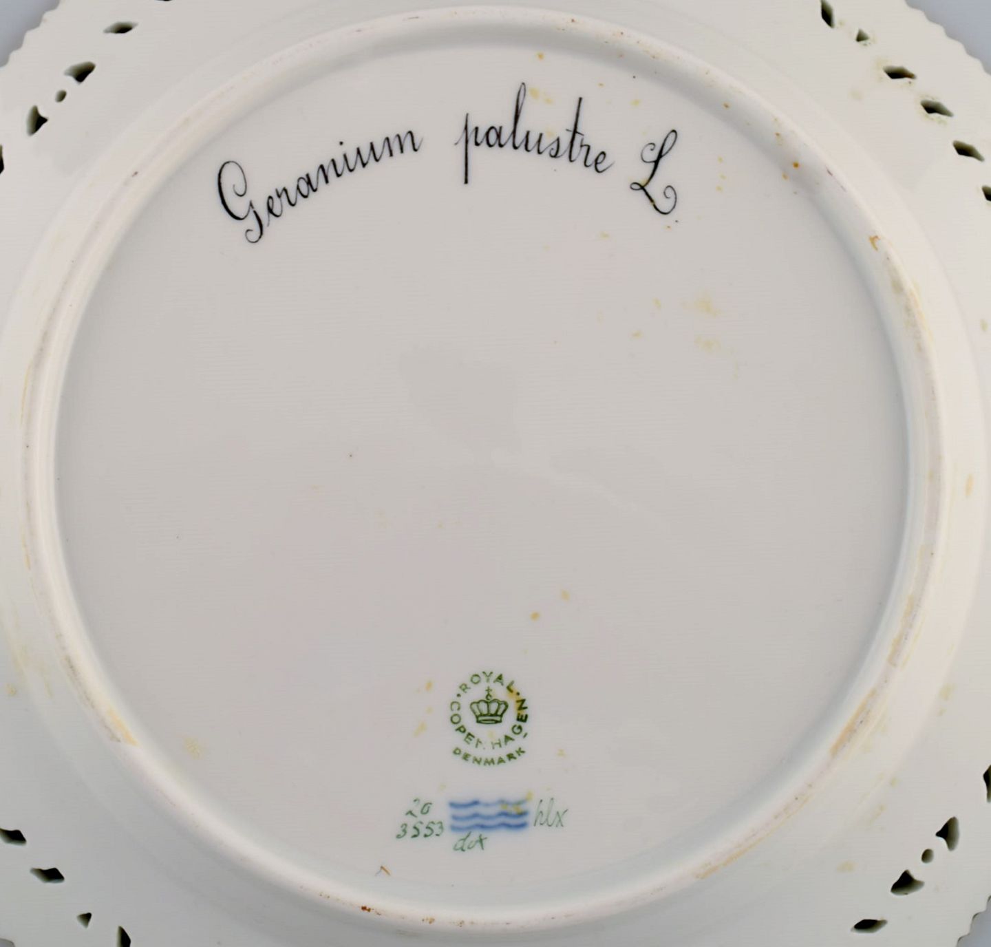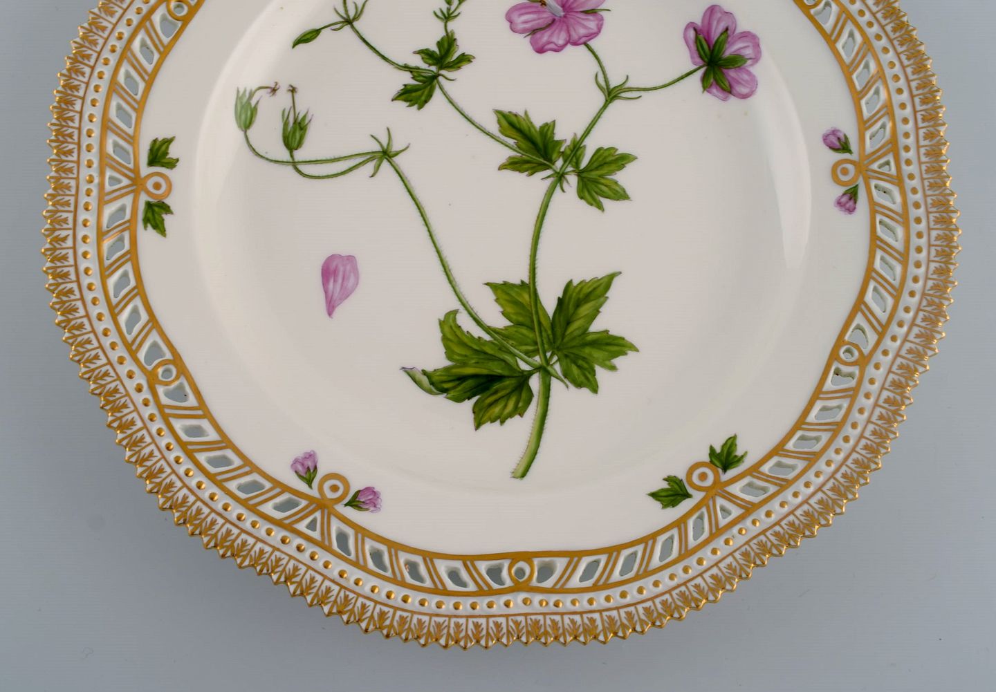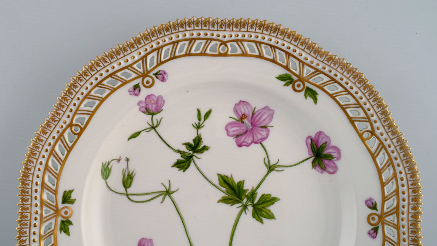 Royal Copenhagen Flora Danica middagstallerken i gennembrudt porcelæn med håndmalede blomster og gulddekoration. Modelnummer 20/3553. Diameter: 25,5 cm. I perfekt stand. 1. Sortering. Stemplet.