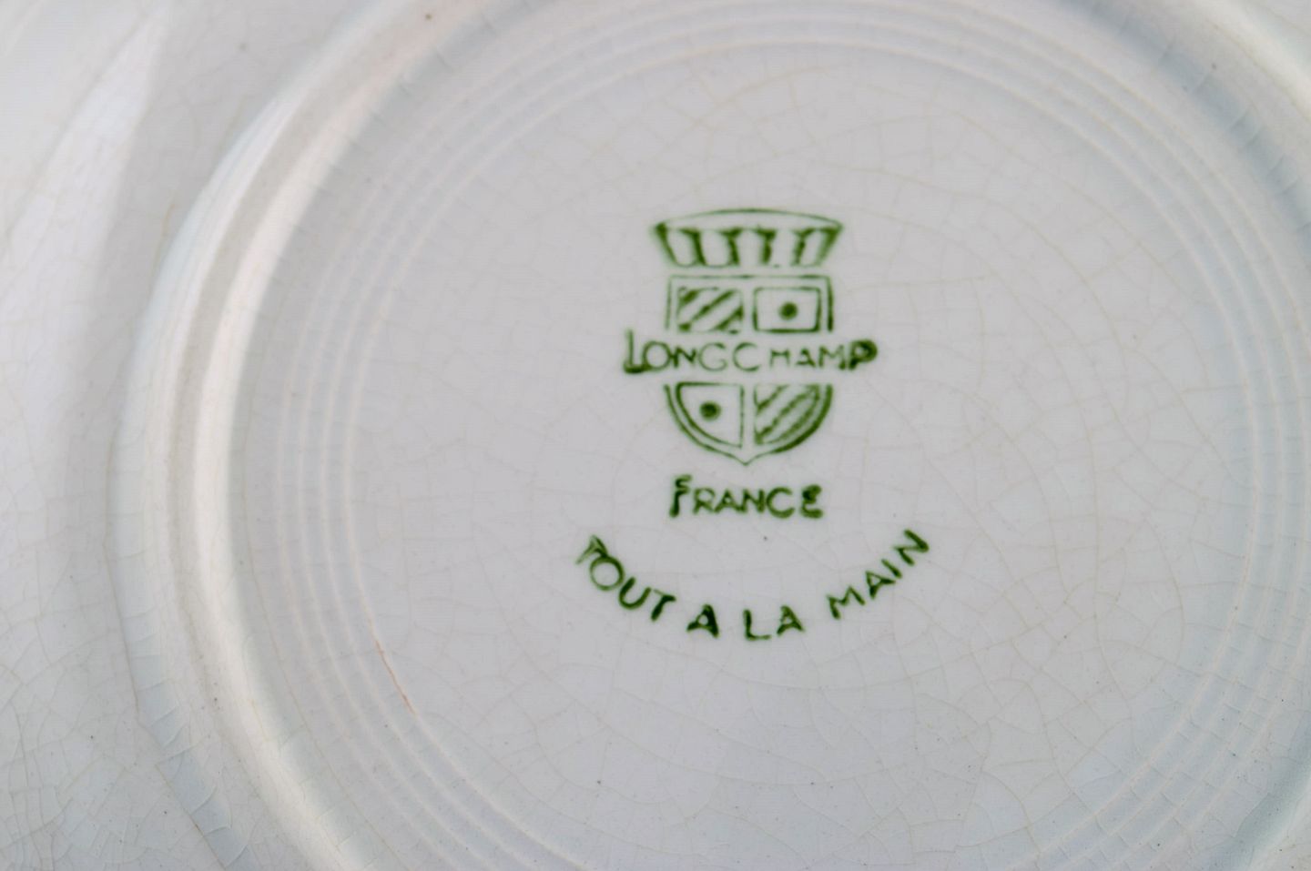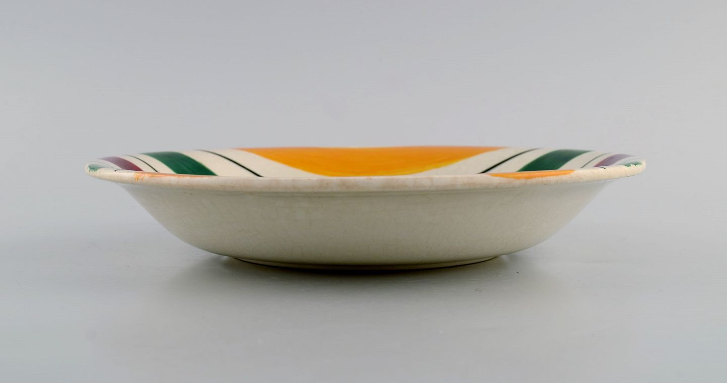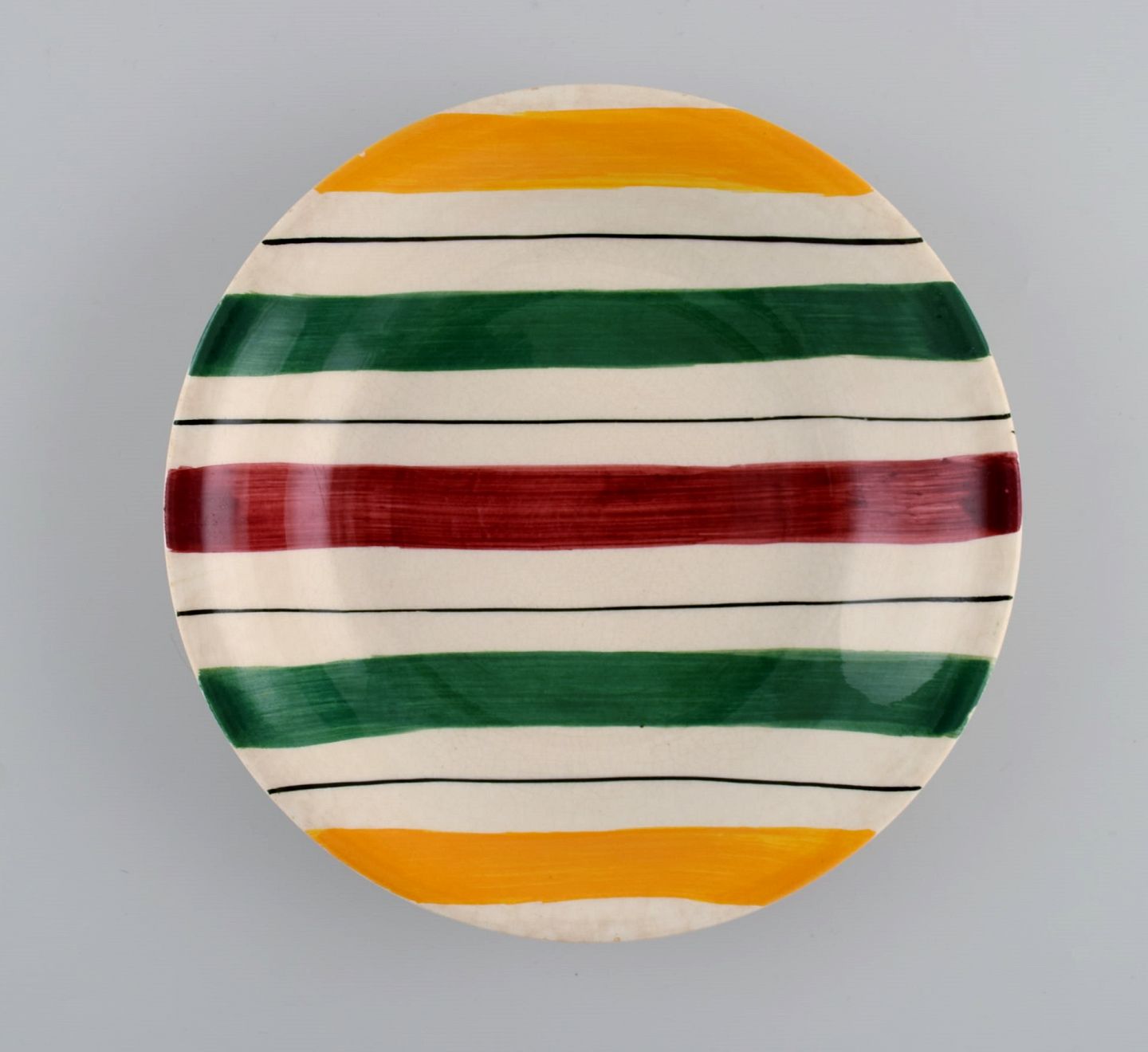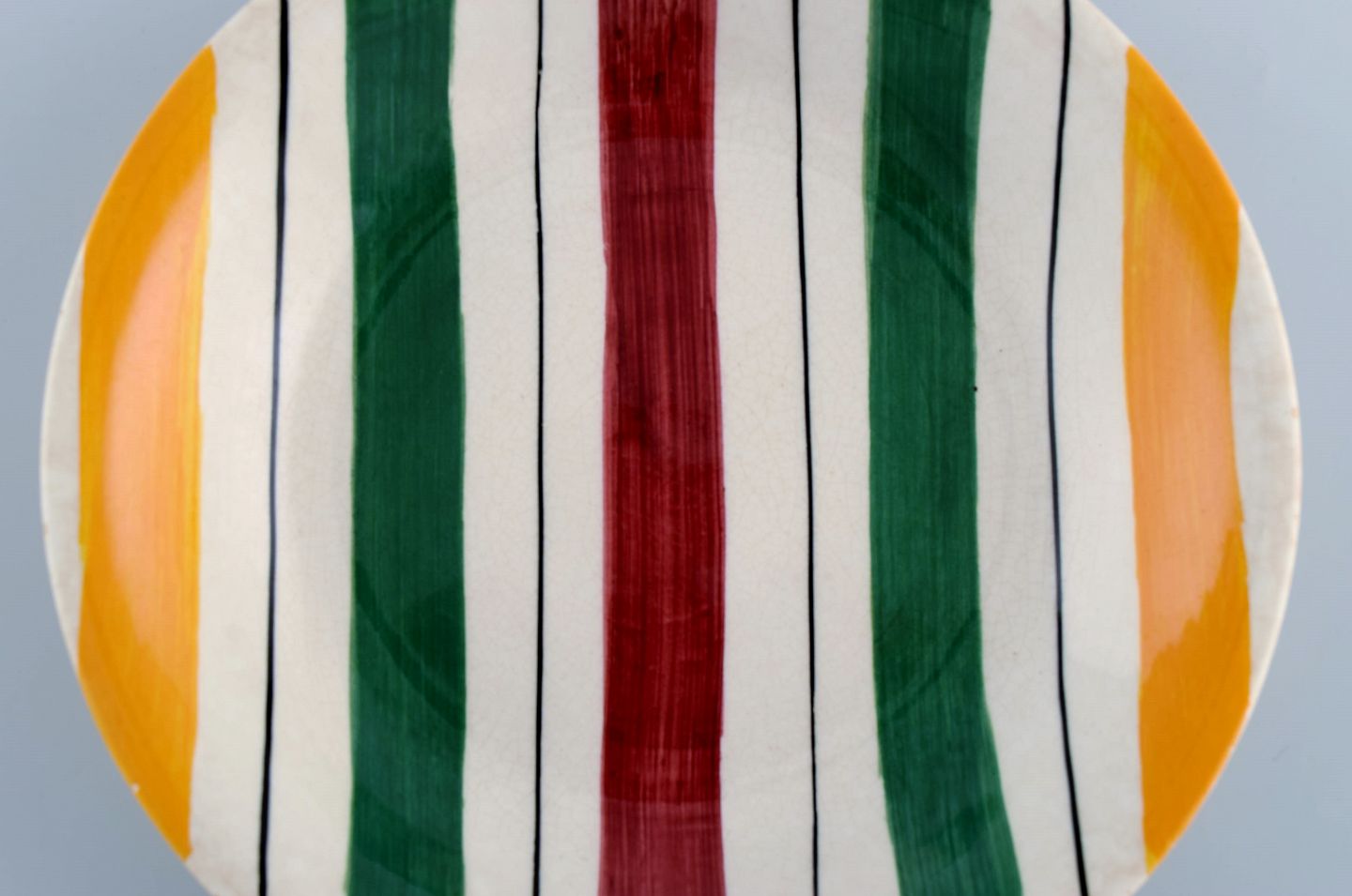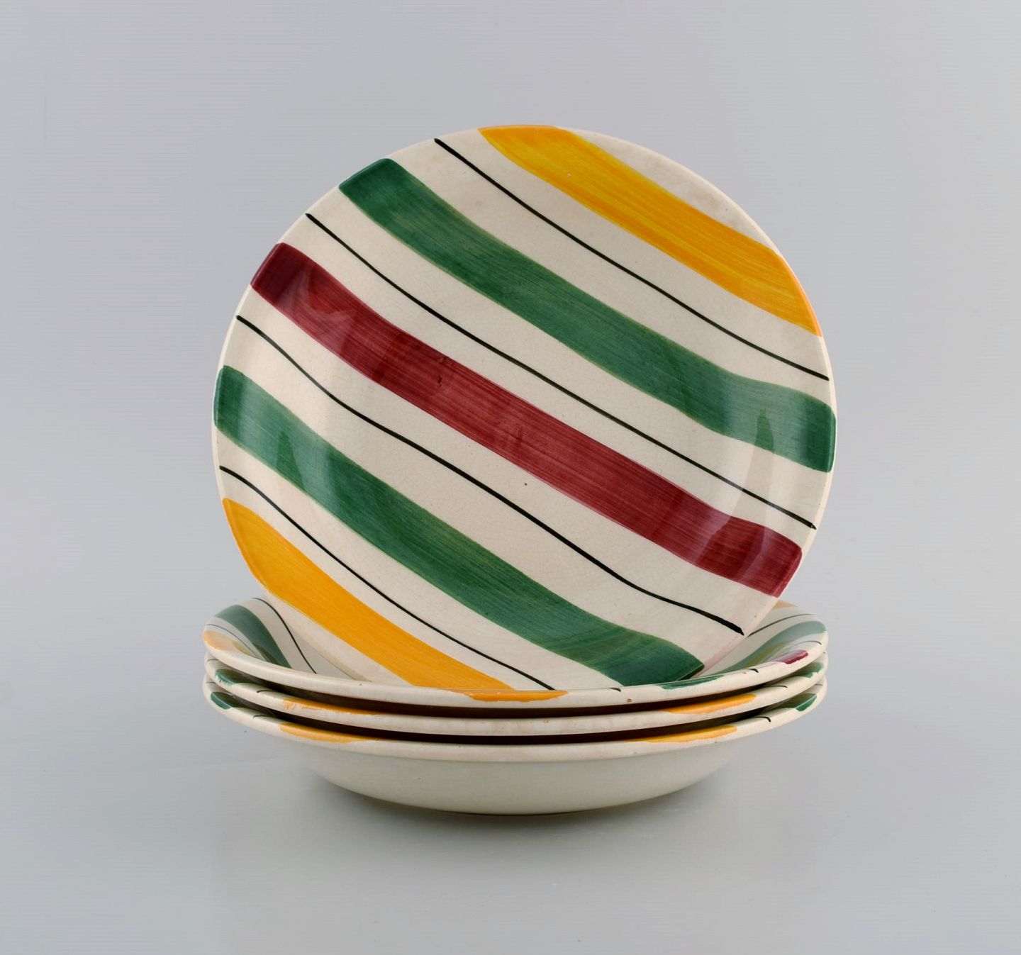 Longchamp, France. Four deep plates in glazed faience with hand-painted striped decoration. Mid-20th century. Measures: 20 x 3.5 cm. In excellent condition. Stamped.