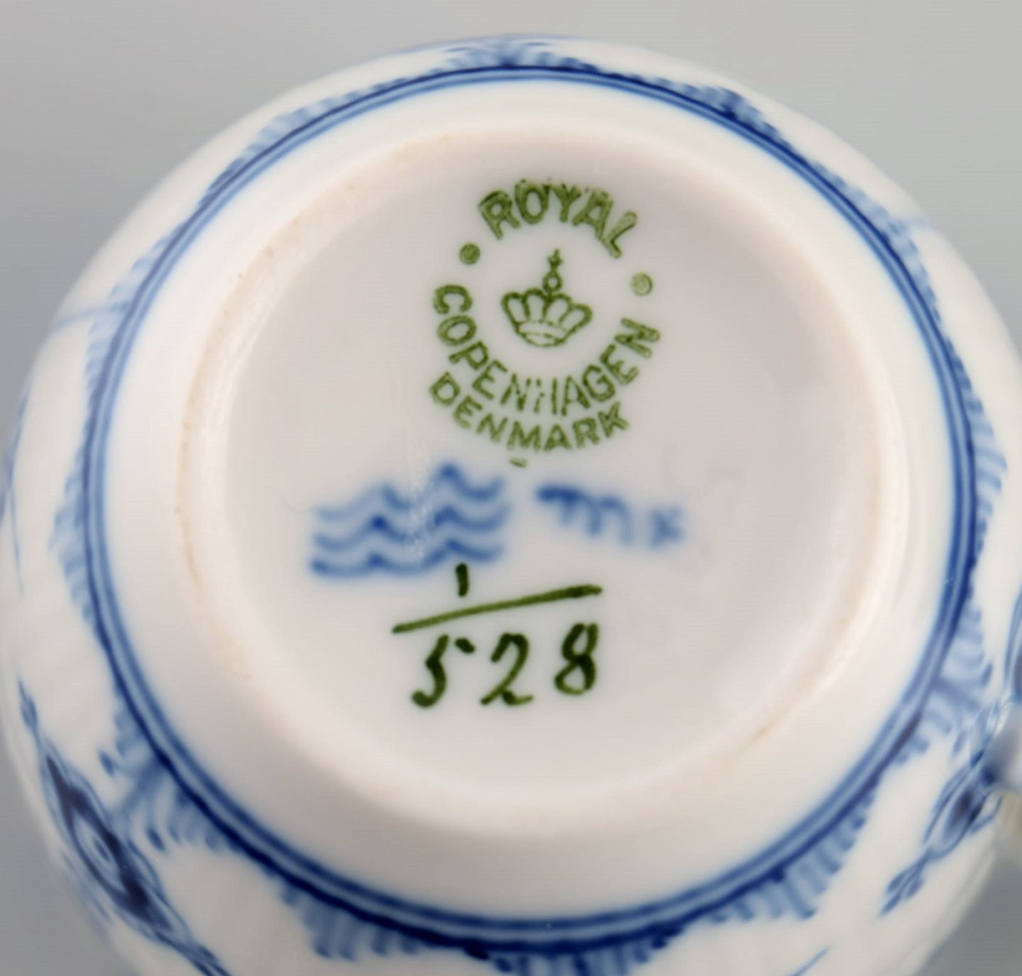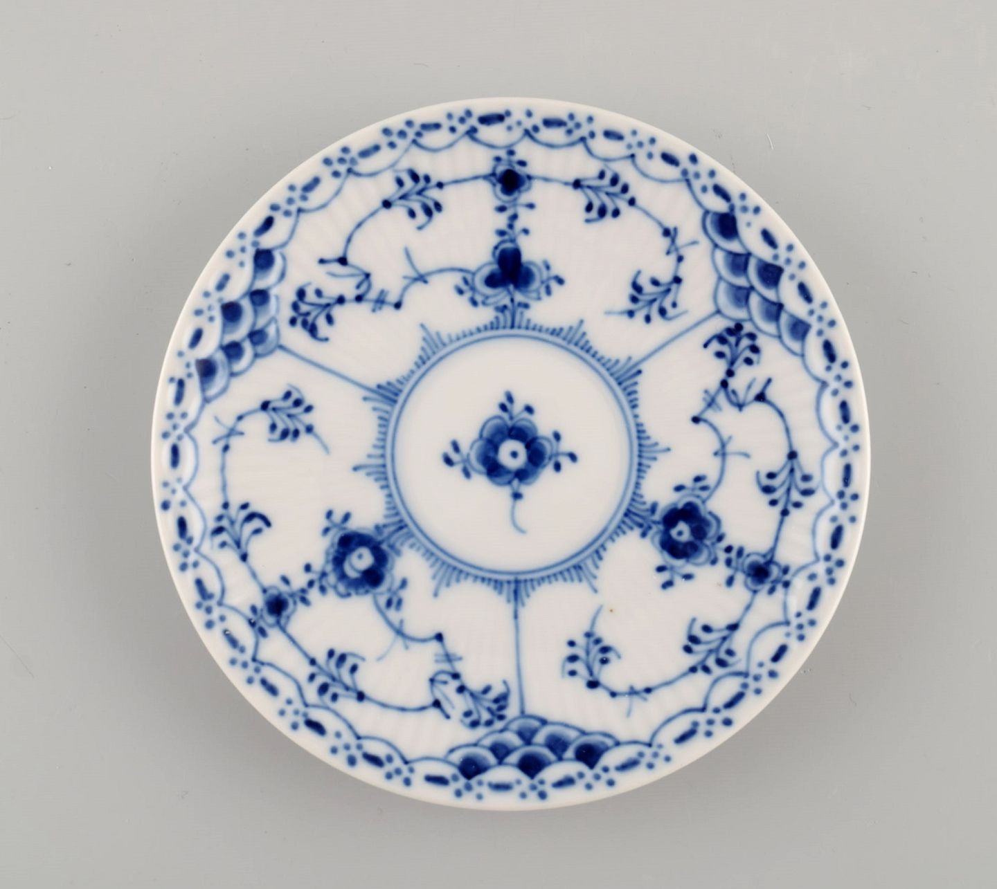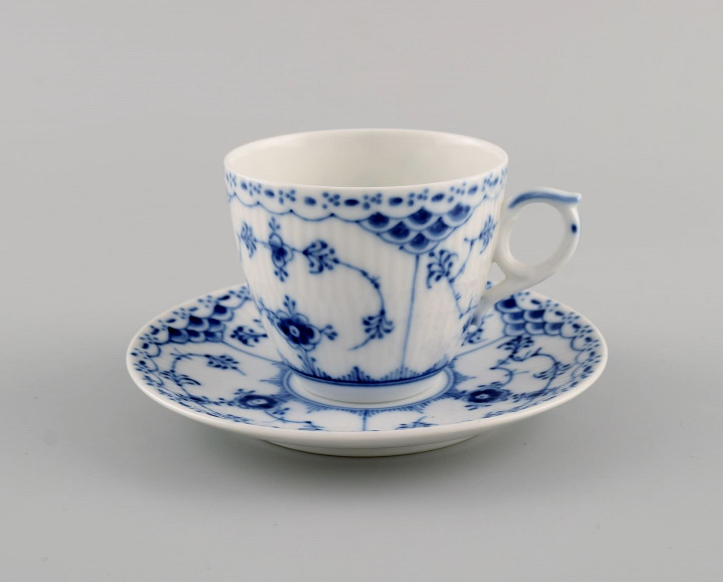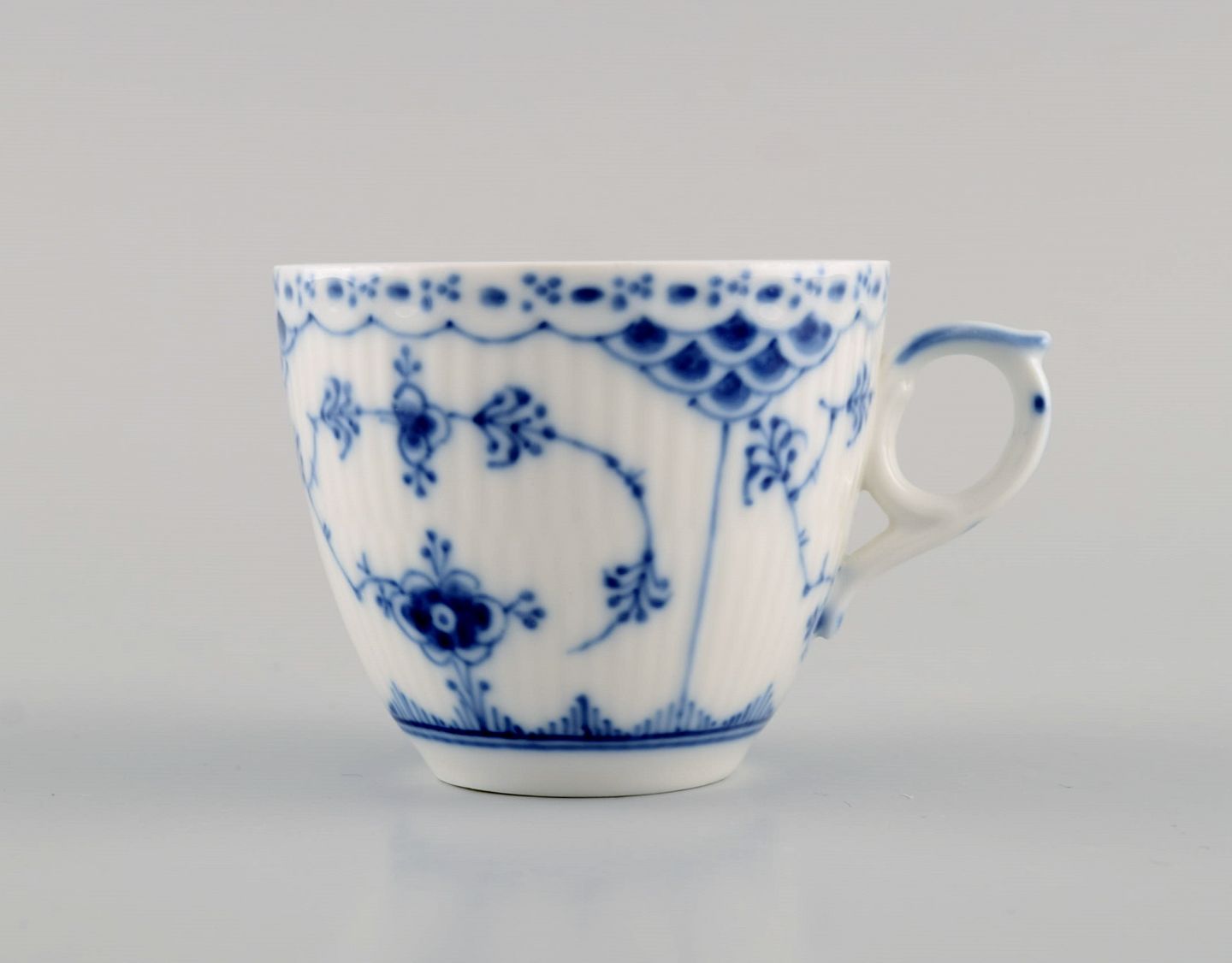 Four Royal Copenhagen Blue Fluted Half Lace coffee cups with saucers. Model number 1/528. Cup Measures: 6.5 x 5.5 cm. Saucer diameter: 11.5 cm. In excellent condition. Stamped. 2nd factory quality.