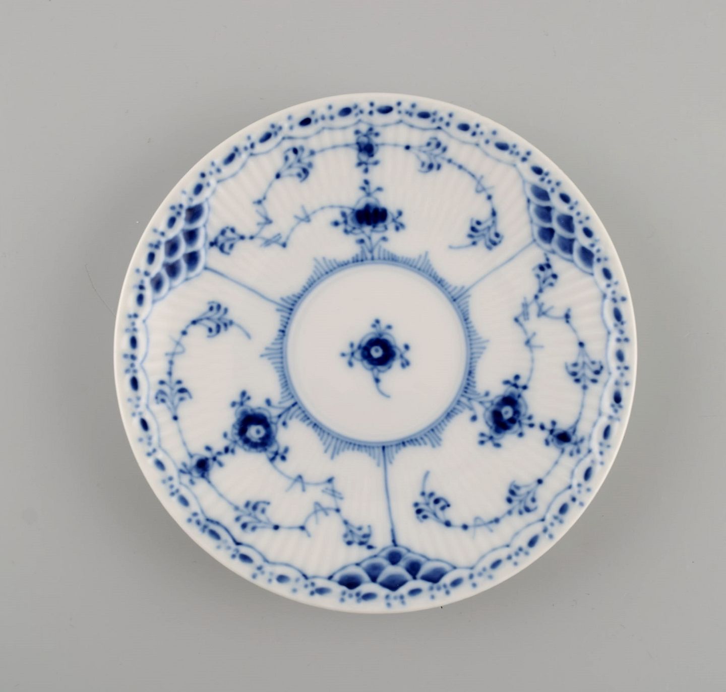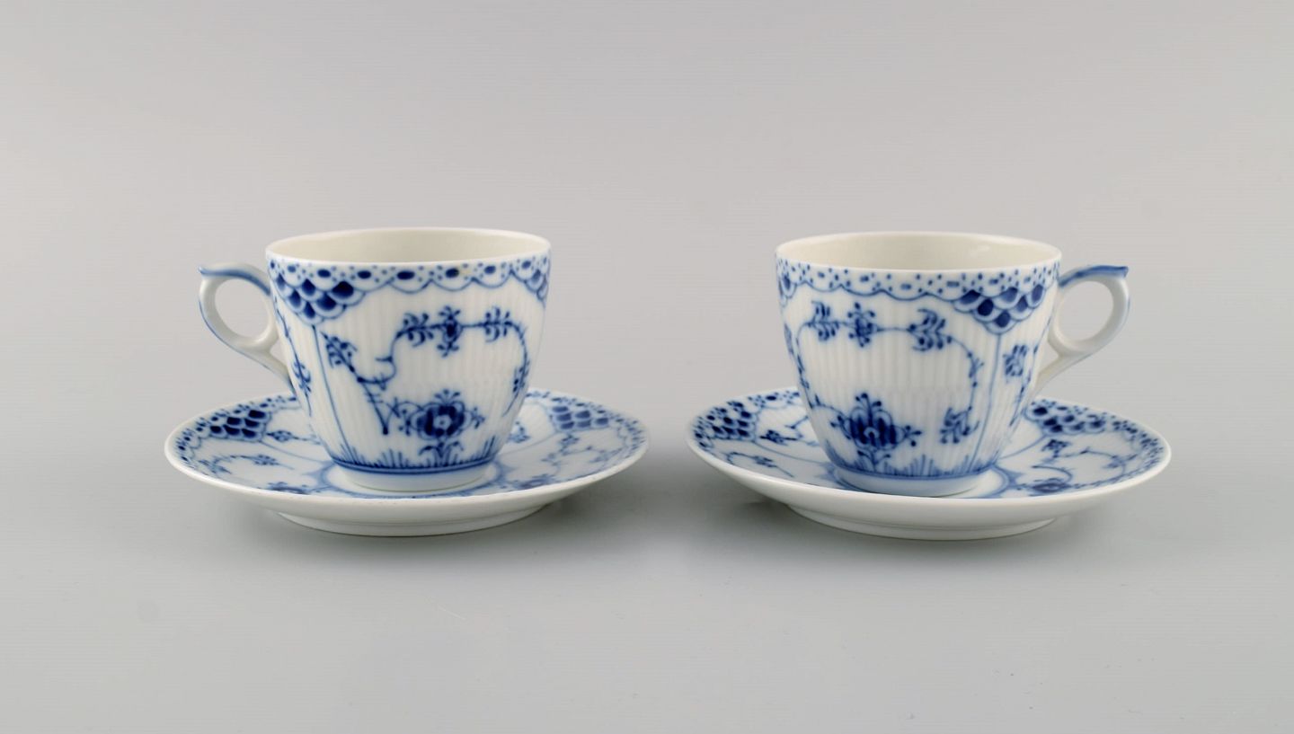 Two Royal Copenhagen Blue Fluted Half Lace coffee cups with saucers. Model number 1/756. The cup measures: 7.7 x 6.5 cm. Saucer diameter: 13.3 cm. In excellent condition. Stamped. 2nd factory quality.