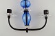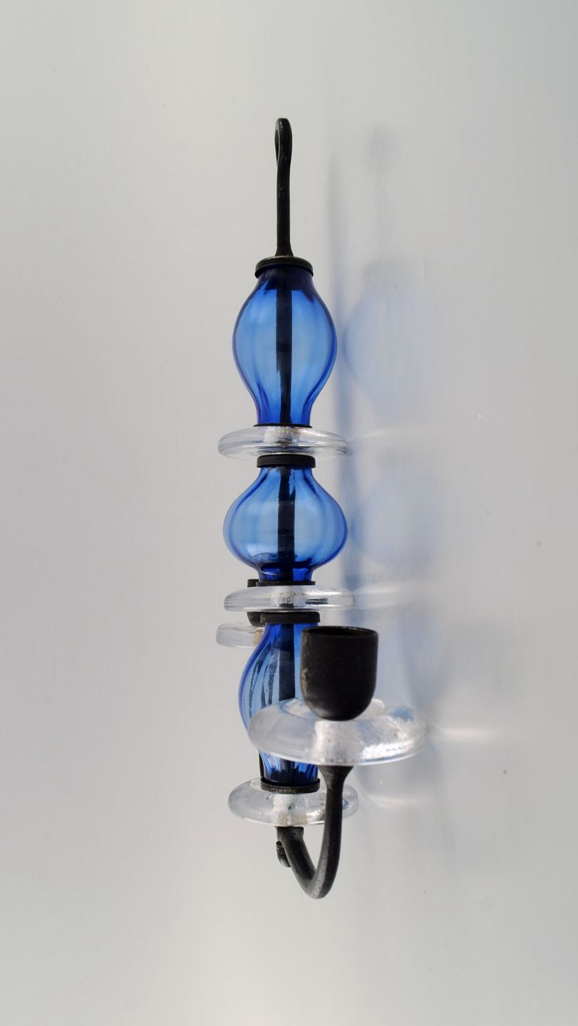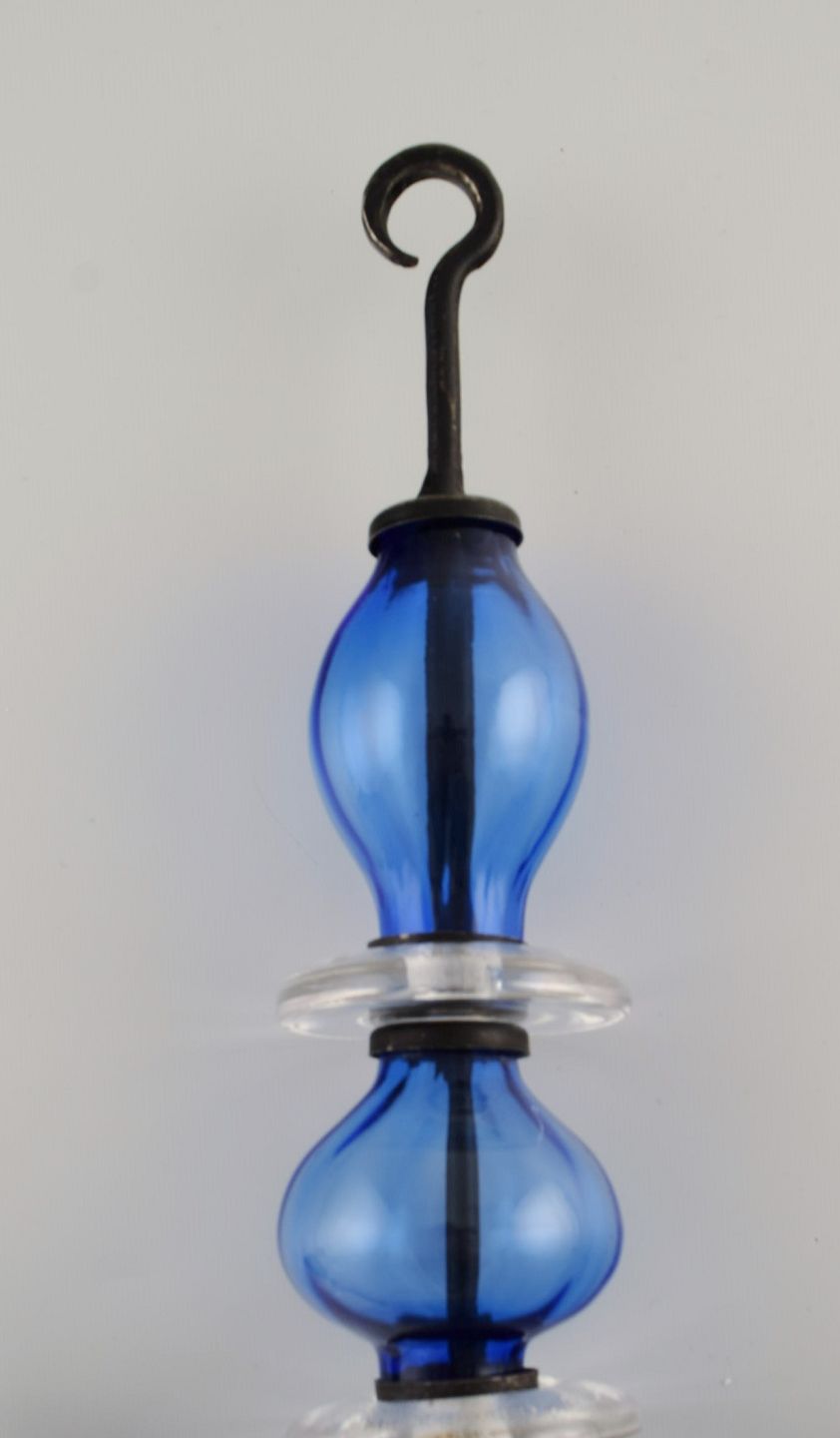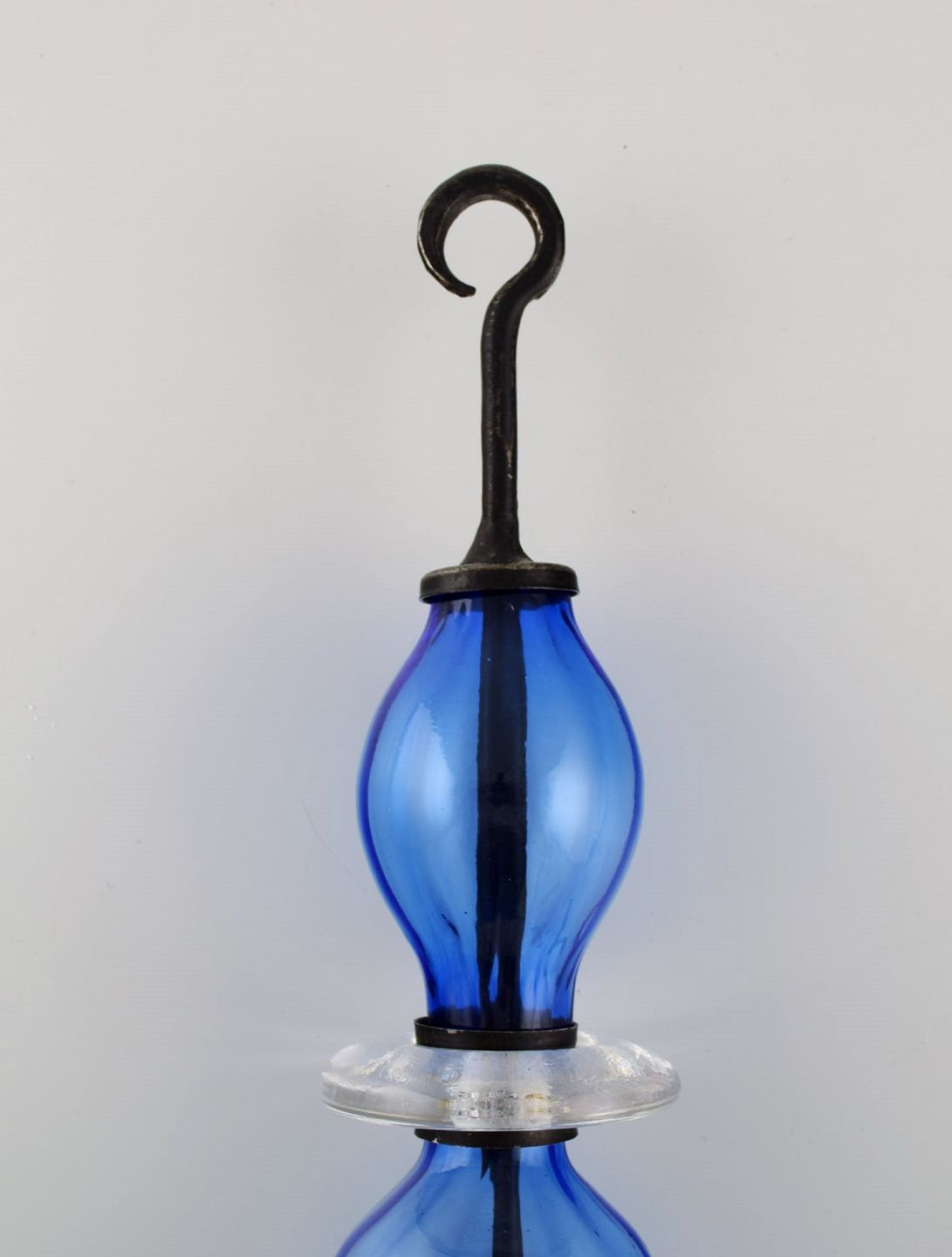 Erik Höglund (1932-1998) for Kosta Boda. Rare two-armed candlestick for hanging in cast iron and mouth-blown art glass. Mid-20th century.