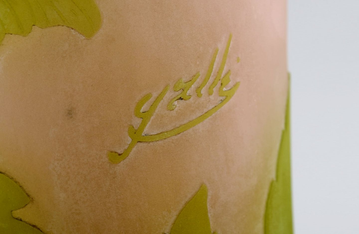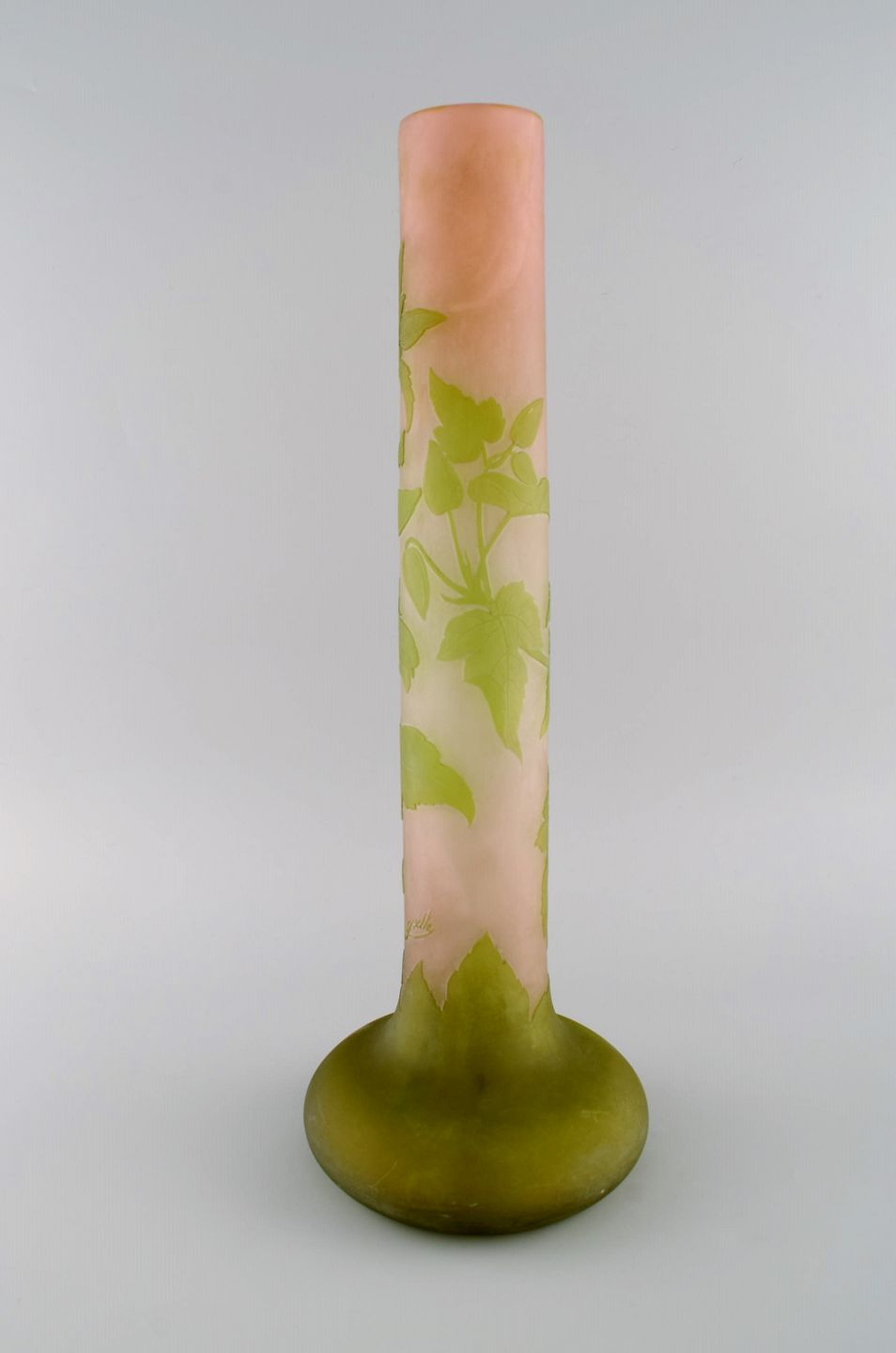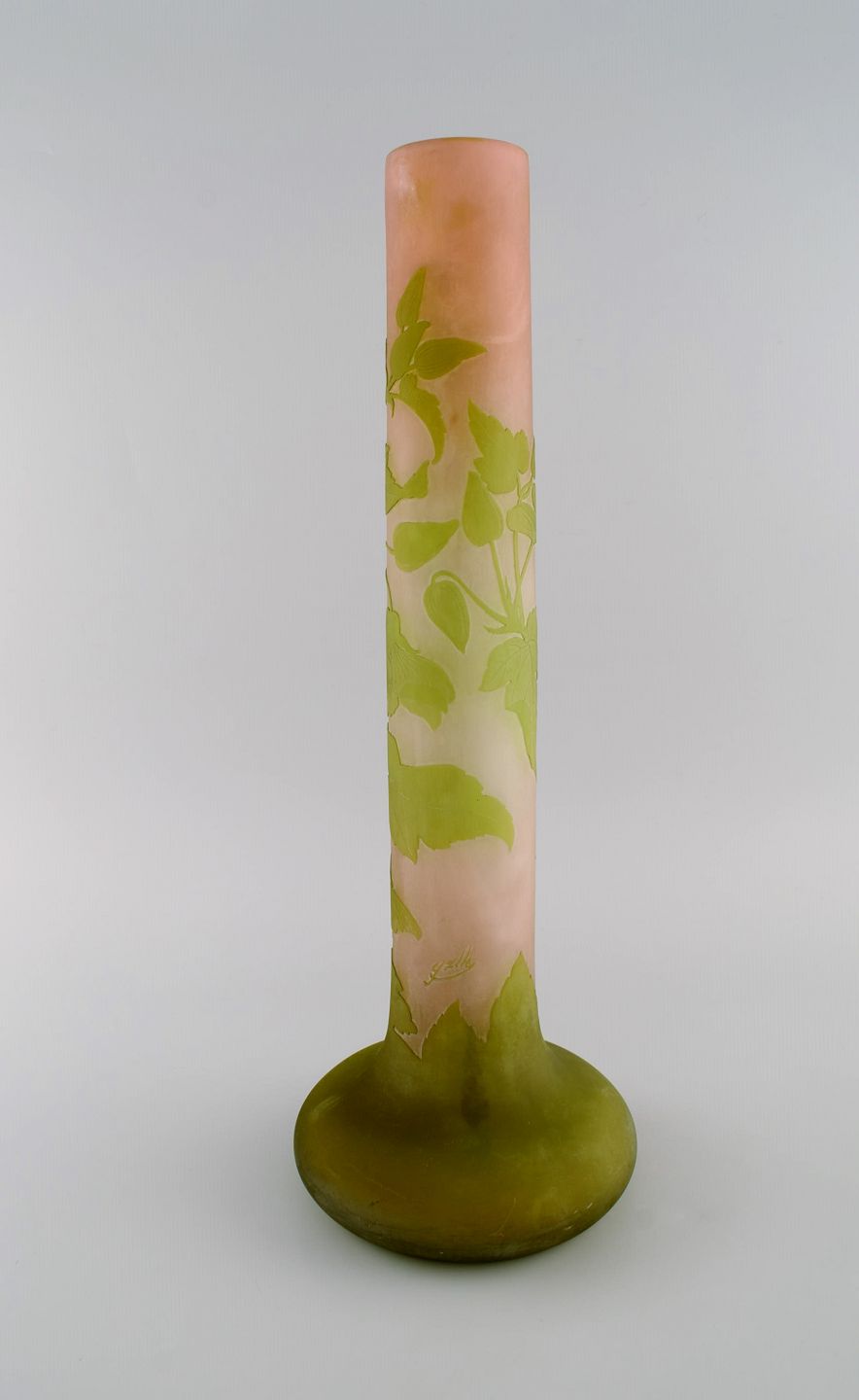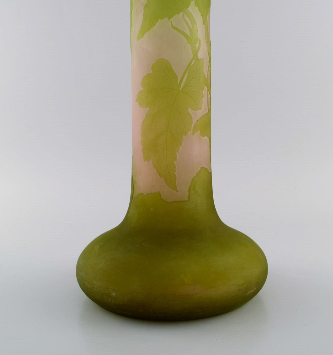 Stor Emile Gallé vase i matteret kunstglas med grønt overfang udskåret med motiver i form af bladværk. Tidligt 1900-tallet. Måler: 59 x 19,5 cm. I flot stand. Signeret.