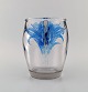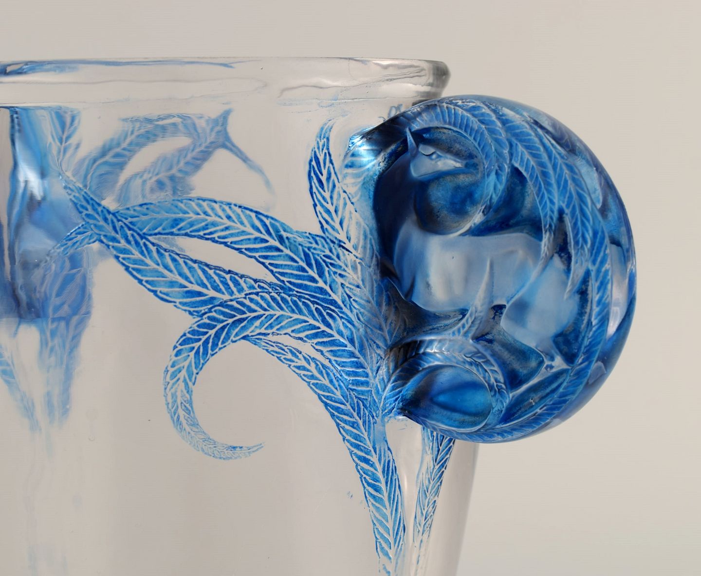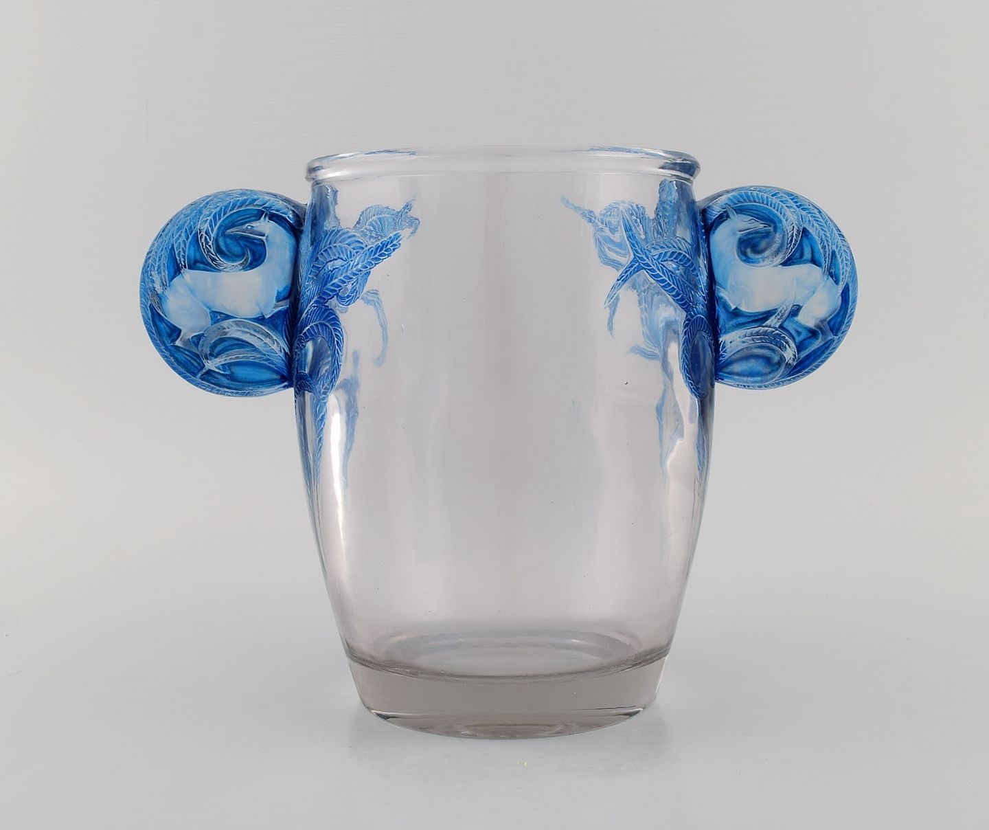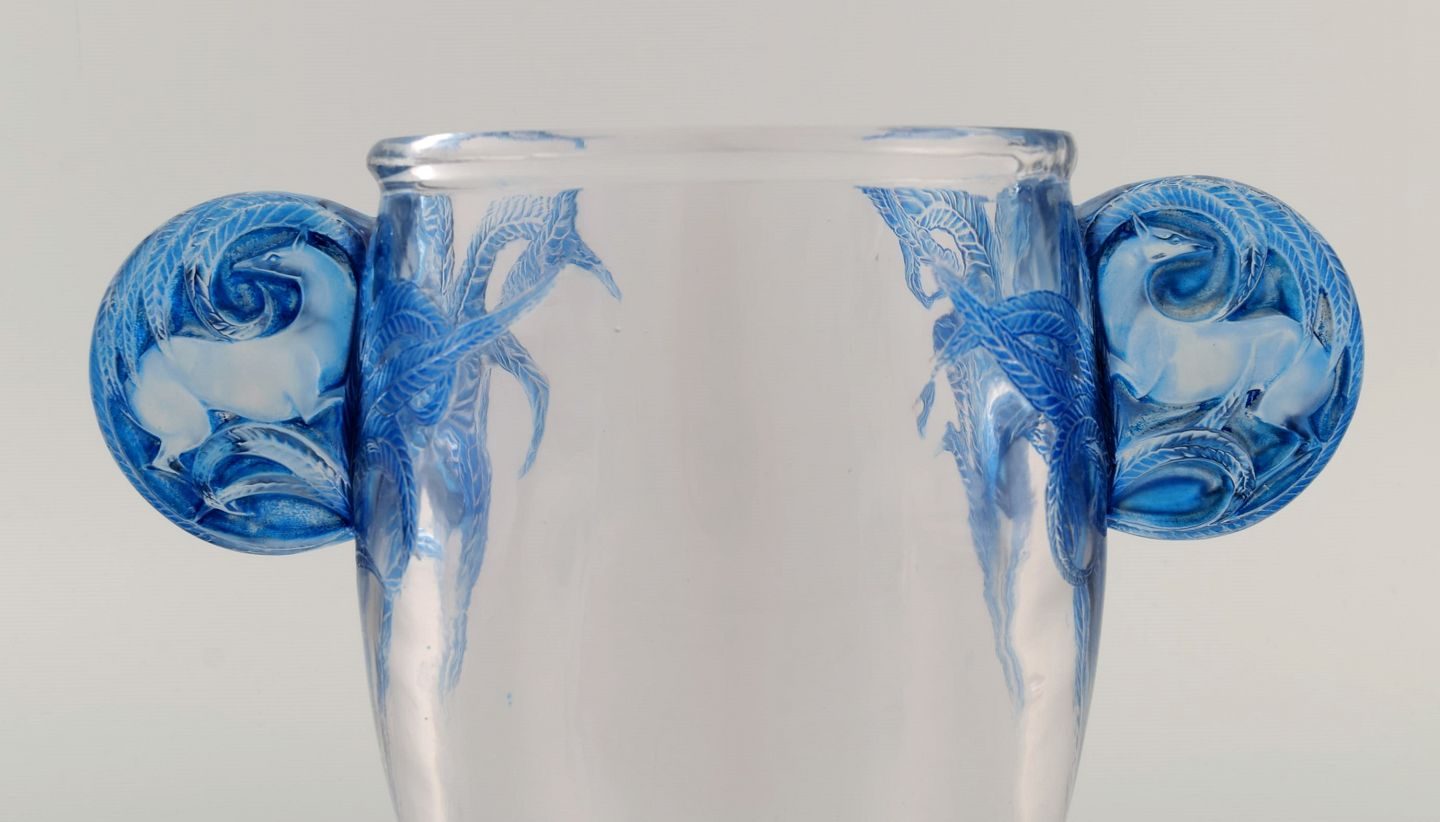 René Lalique (1860-1945), France. Rare "Yvelines" vase in clear and blue mouth blown art glass. Handles modeled with deer and foliage. Museum quality, 1920s / 30s.