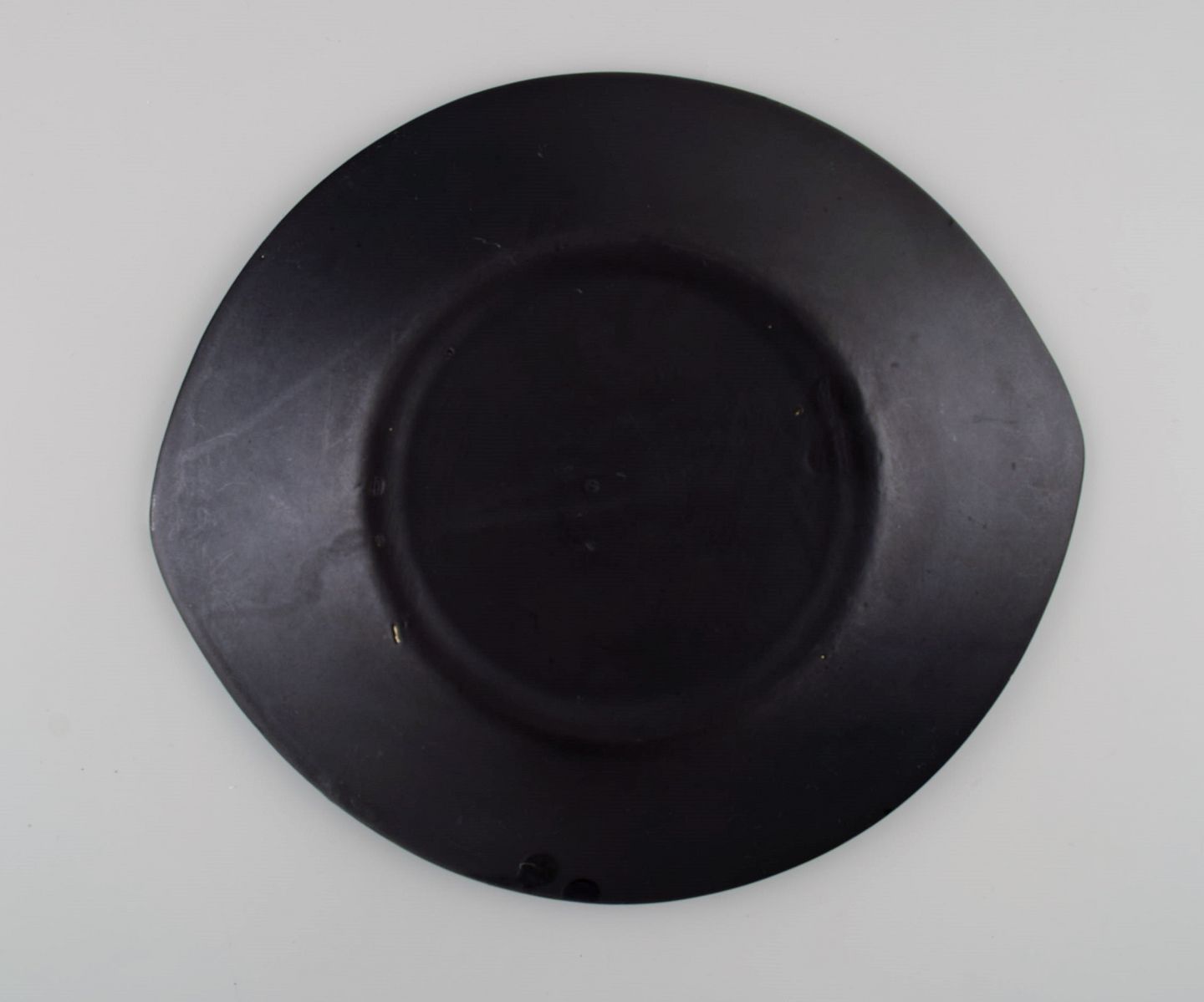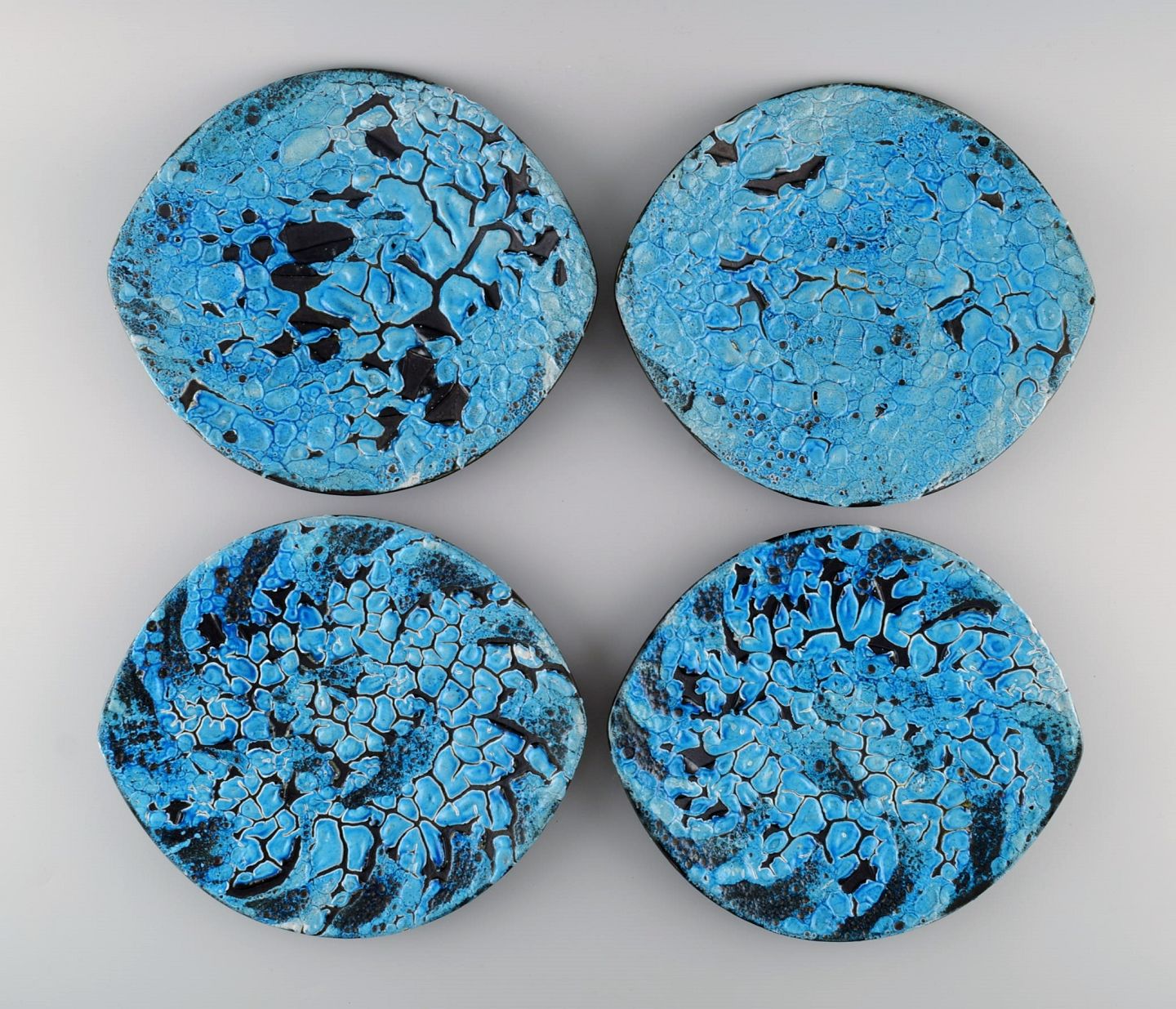 French ceramist. Eight dinner plates in glazed stoneware. Beautiful glaze in azure shades. Unique, high-quality ceramics. Mid-20th century. Measures: 26 x 23 cm. In excellent condition.