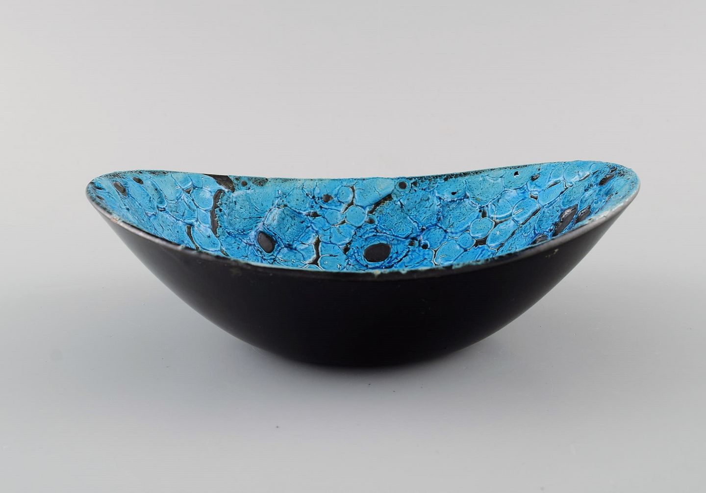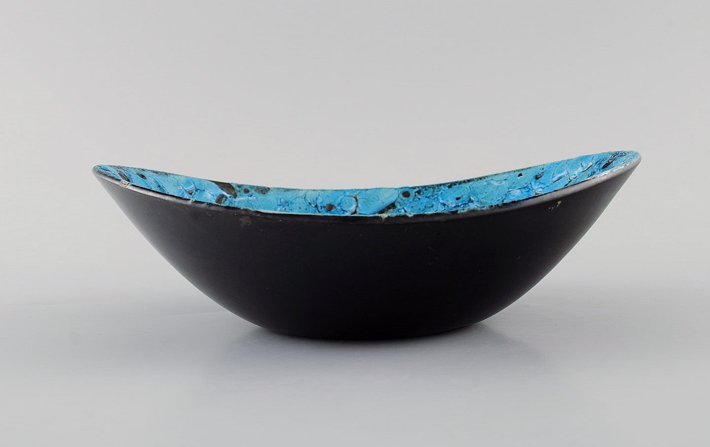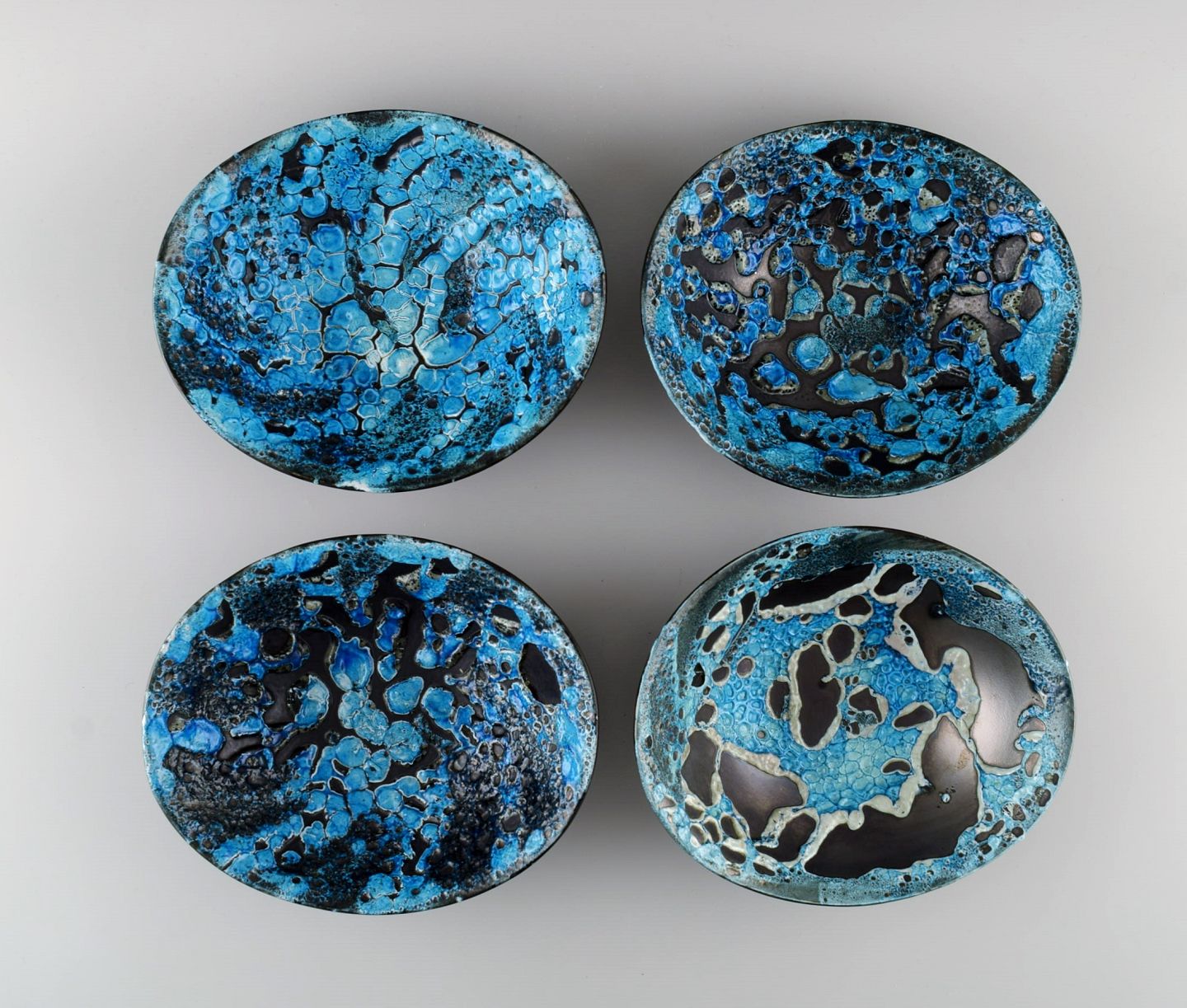 French ceramist. Eight bowls in glazed stoneware. Beautiful glaze in azure shades. Unique, high-quality ceramics. Mid-20th century. Measures: 20 x 17 x 6 cm. In excellent condition.
