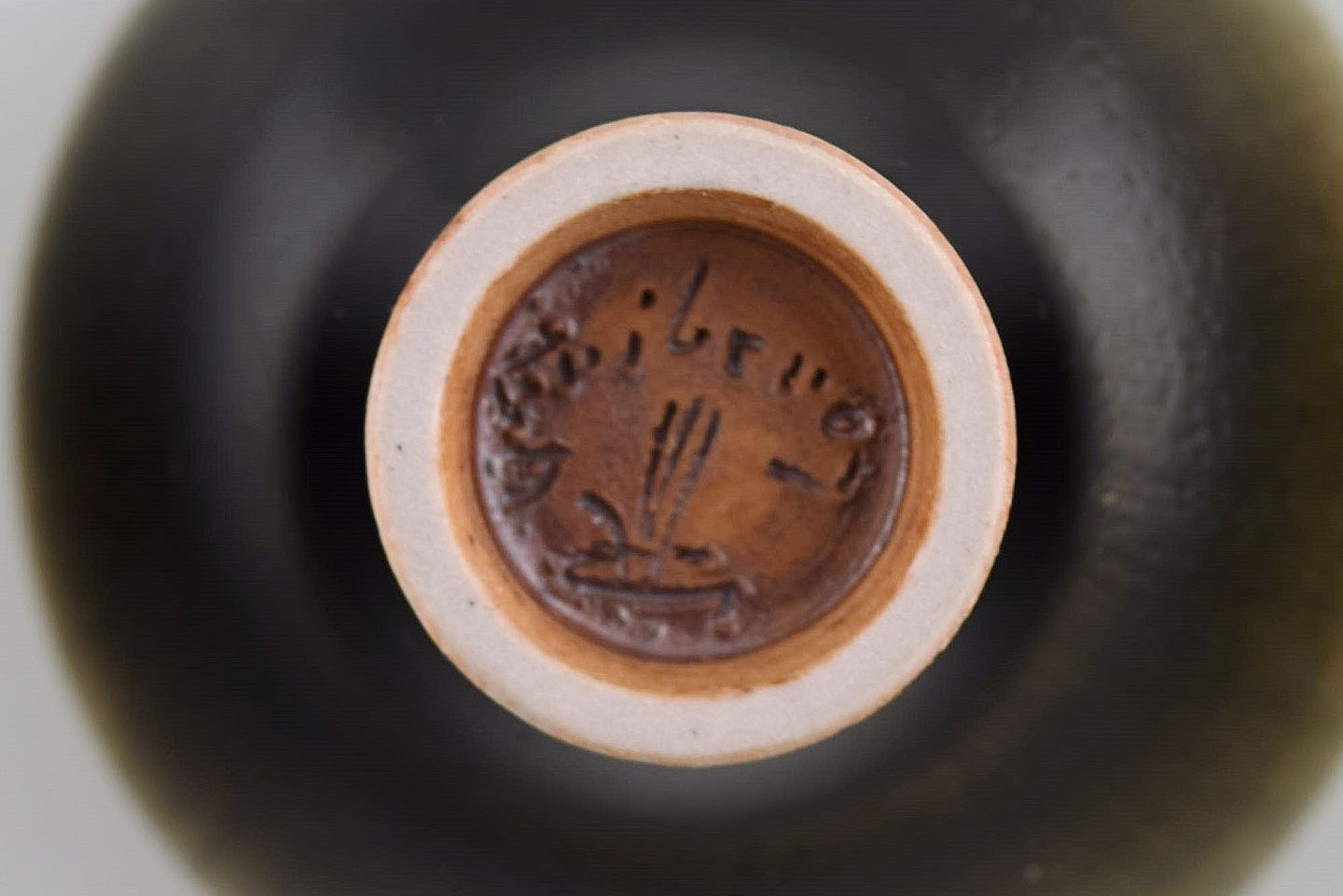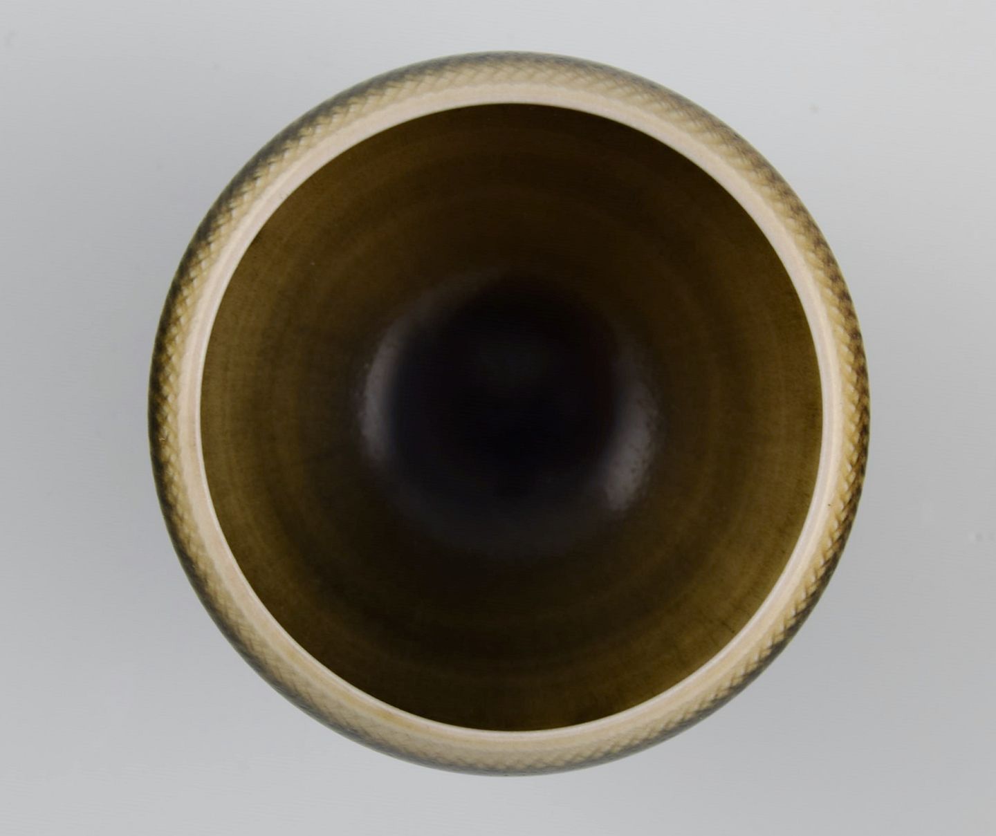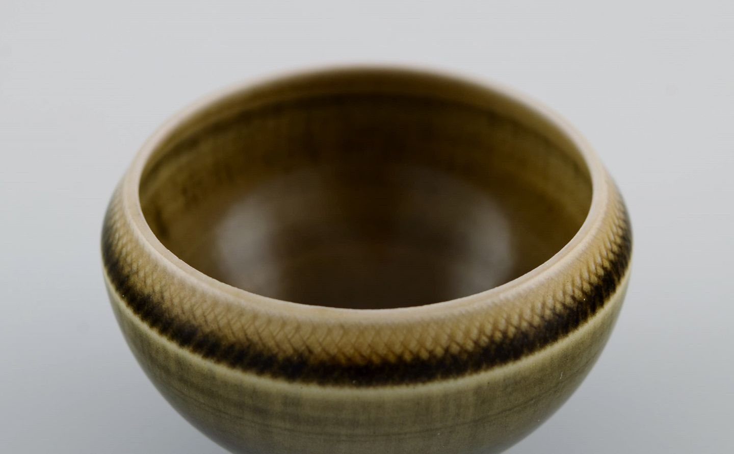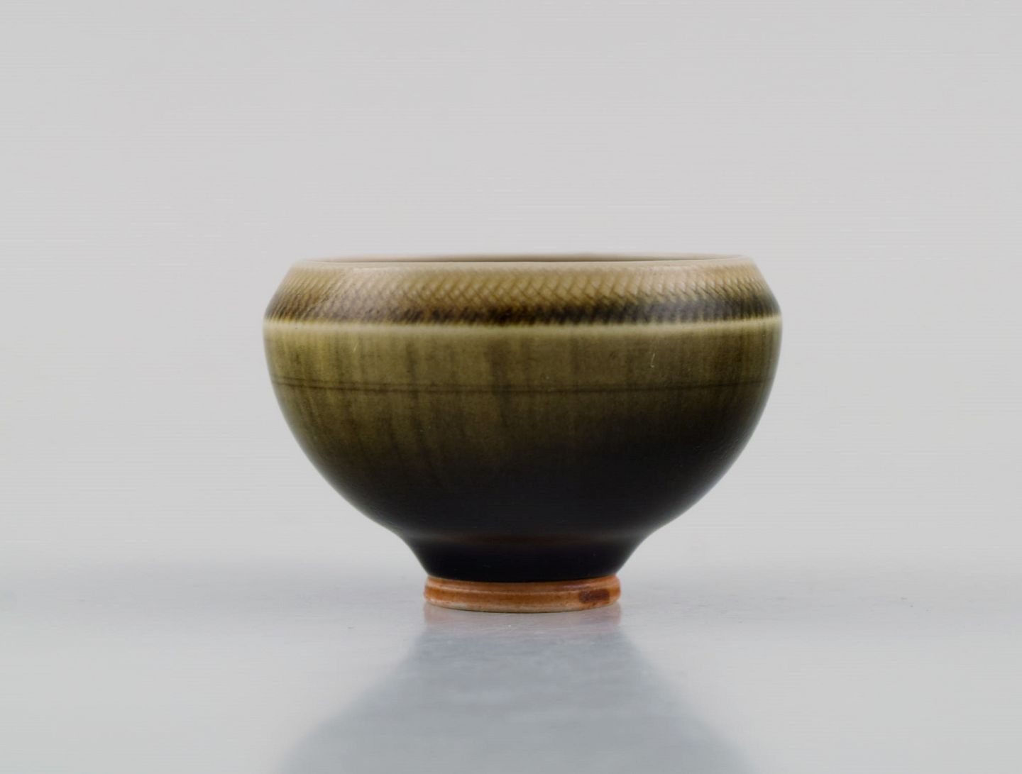Berndt Friberg (1899-1981) for Gustavsberg Studiohand. Miniature skål i glaseret keramik. Smuk glasur i grønne og brune nuancer. 1960/70'erne. Måler: 55 x 35 mm. I flot stand. Signeret.