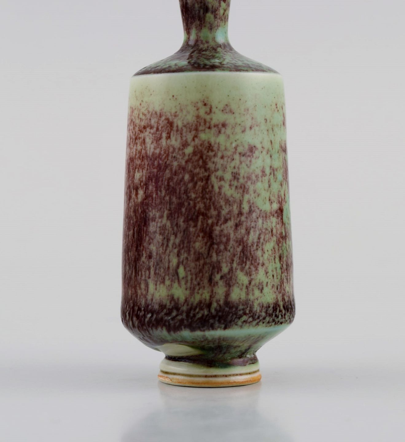 Berndt Friberg (1899-1981) for Gustavsberg Studiohand. Miniature vase i glaseret keramik. Smuk glasur i lilla og turkis nuancer. 1970'erne. Måler: 8,8 x 3,5 cm. I flot stand. Signeret.
