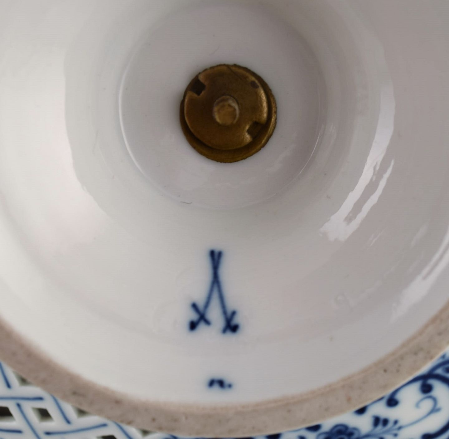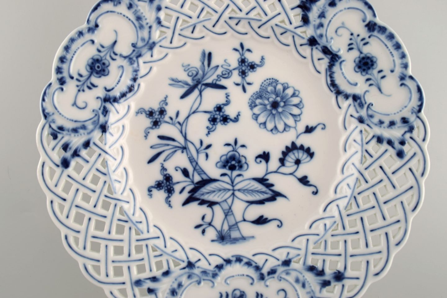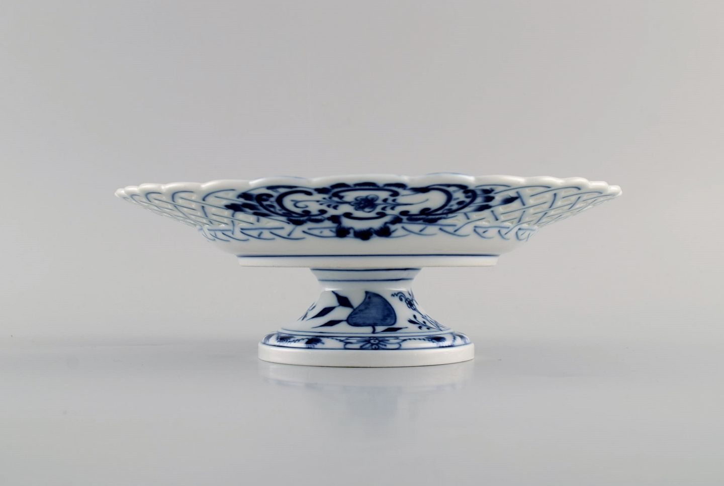 Meissen Blue Onion compote in openwork porcelain. Early 20th century. Measures: 20.5 x 6.8 cm. In excellent condition. Stamped. 1st factory quality.