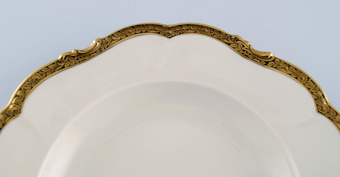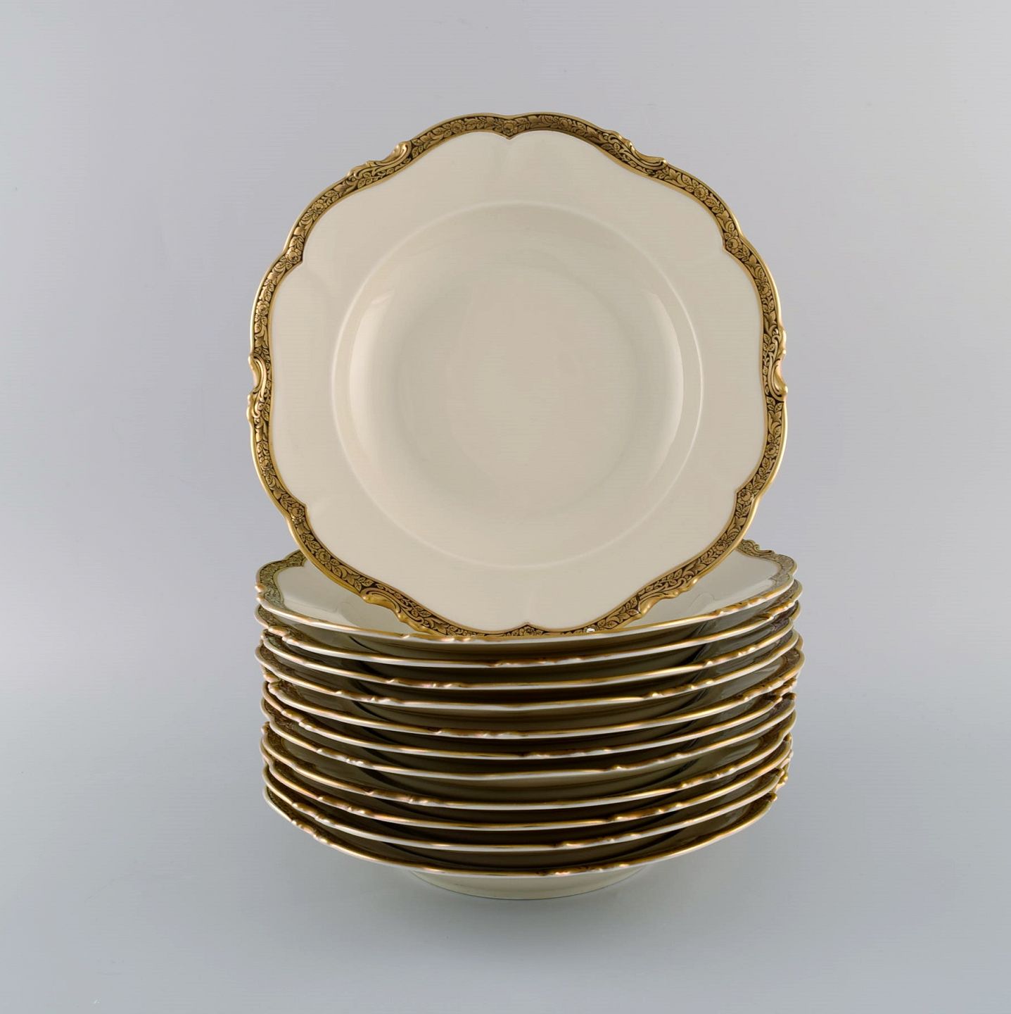 KPM, Berlin. Tolv Royal Ivory dybe tallerkener i cremefarvet porcelæn med gulddekoration. 1920'erne. Måler: 24,5 x 4 cm. I flot stand. Stemplet.
