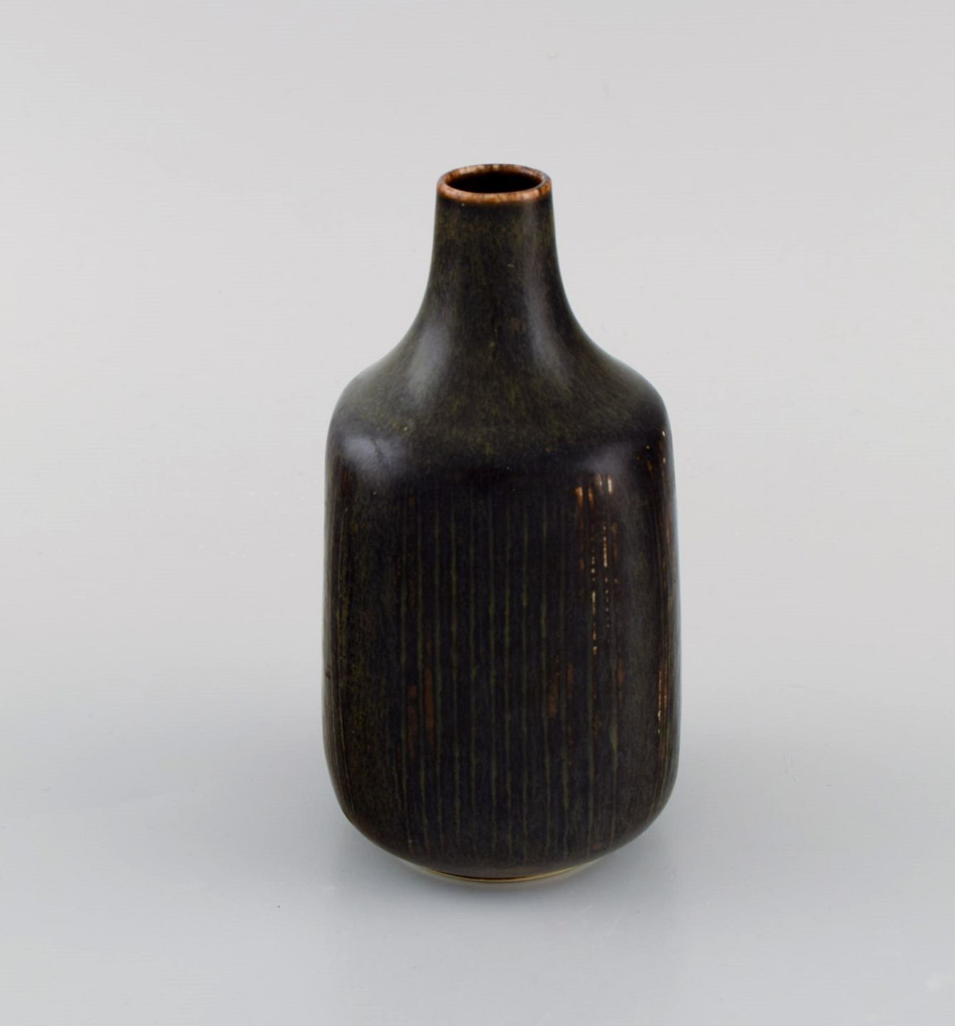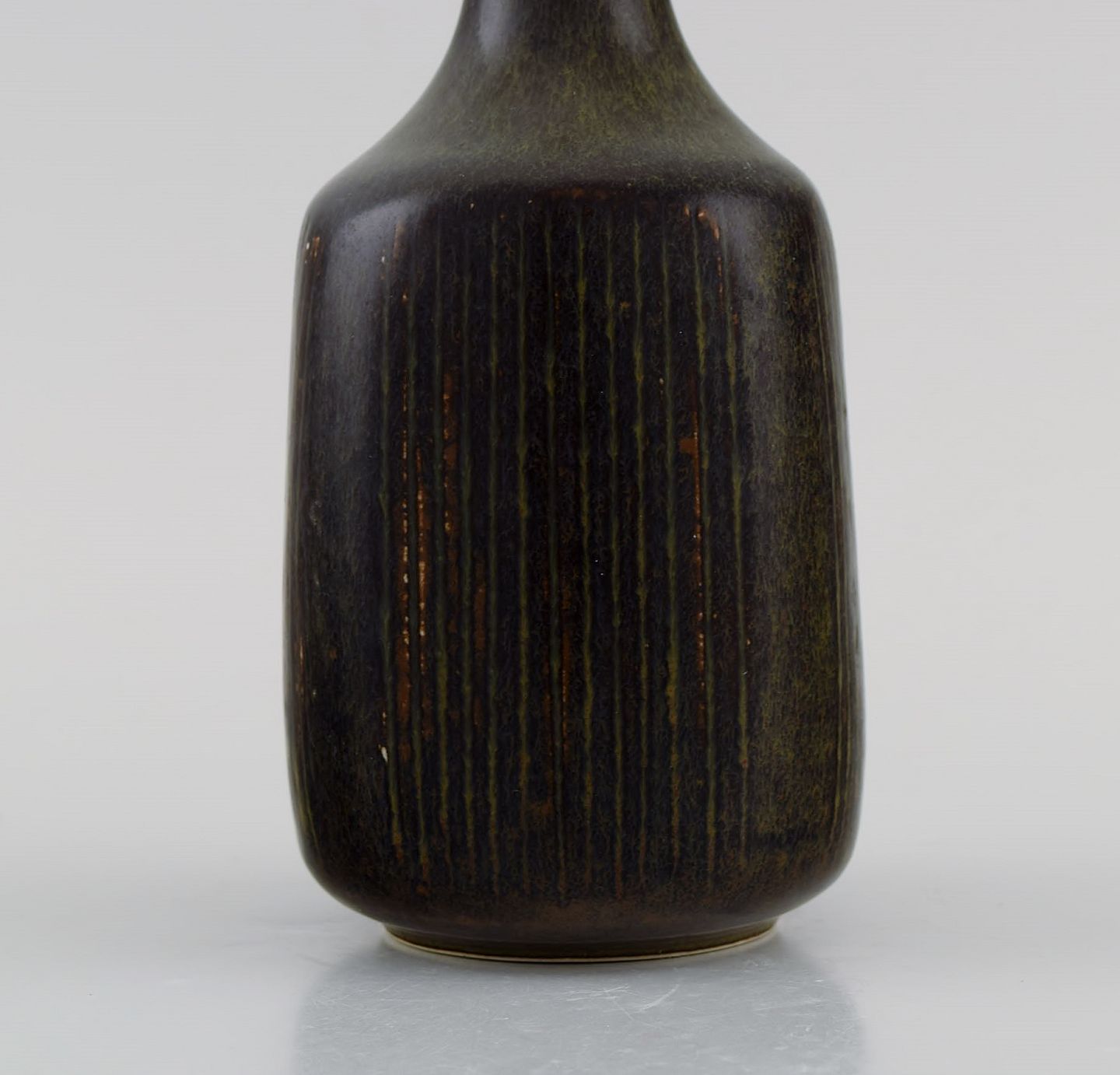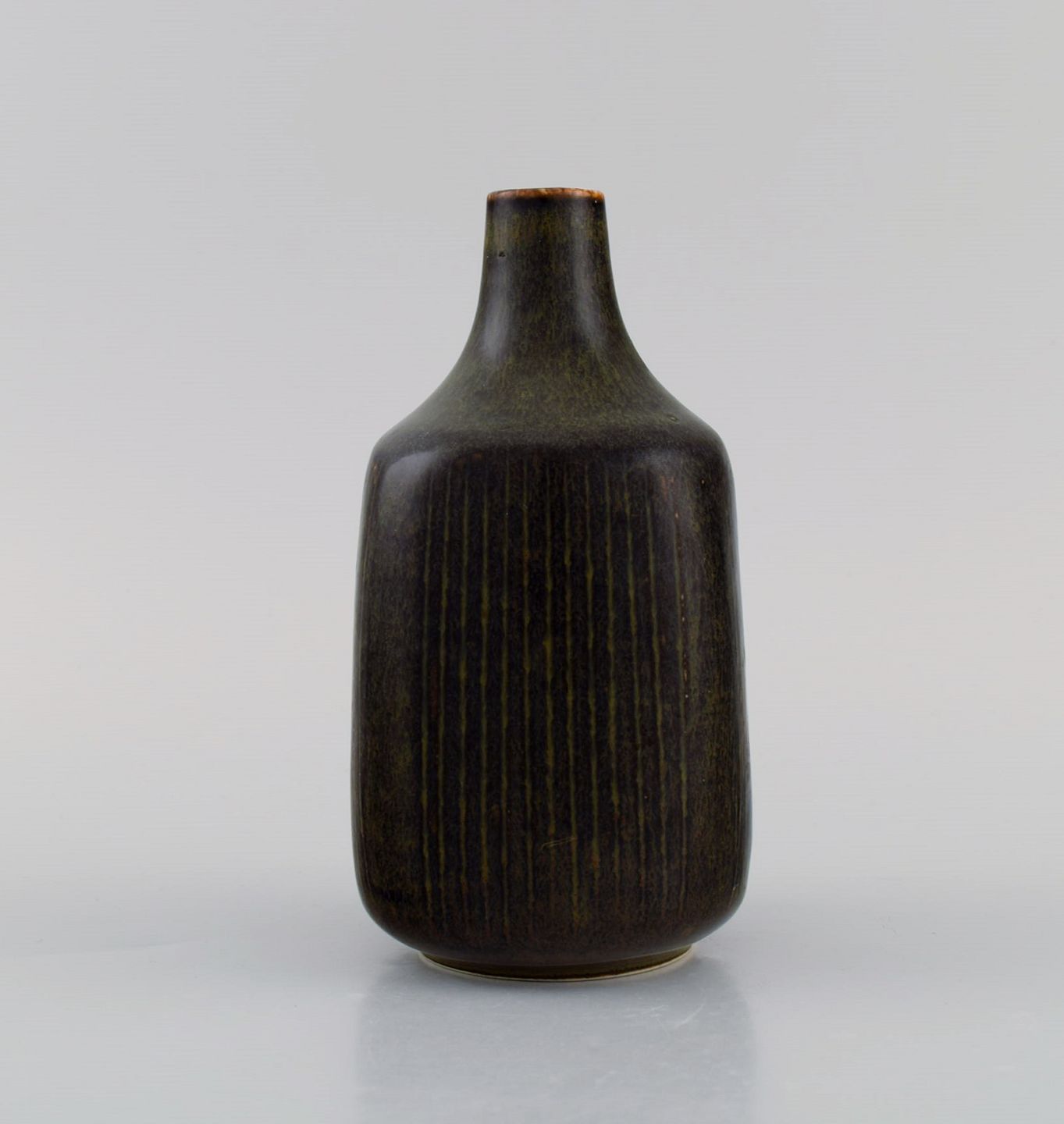Eva Stæhr-Nielsen for Saxbo. Vase i glaseret stentøj med vertikalt indridsede streger. Smuk glasur i brune nuancer. Midt 1900-tallet.