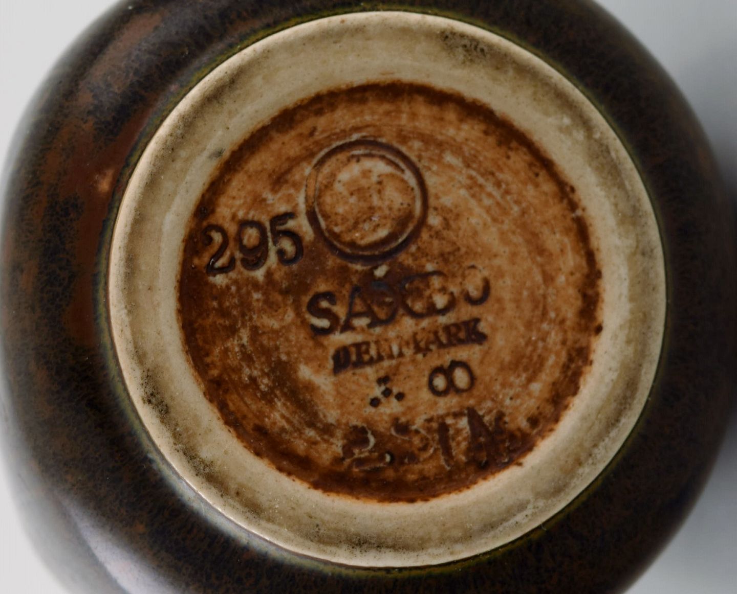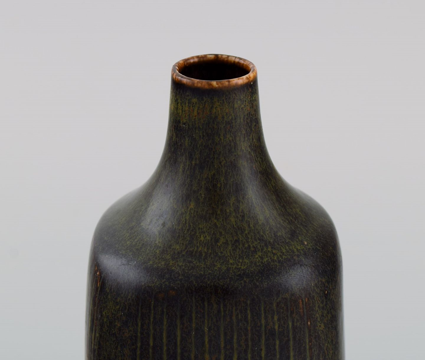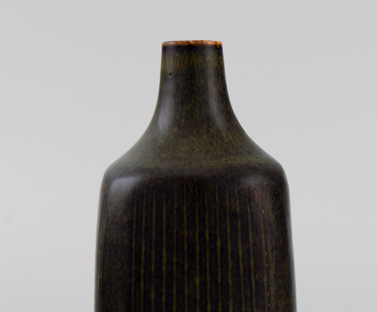 Eva Stæhr-Nielsen for Saxbo. Vase i glaseret stentøj med vertikalt indridsede streger. Smuk glasur i brune nuancer. Midt 1900-tallet.