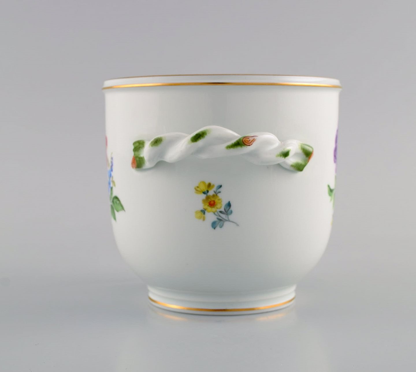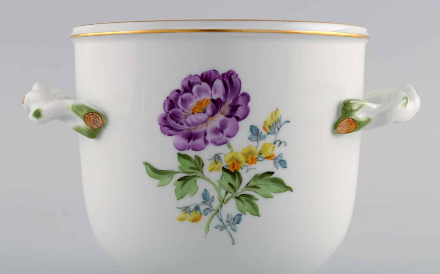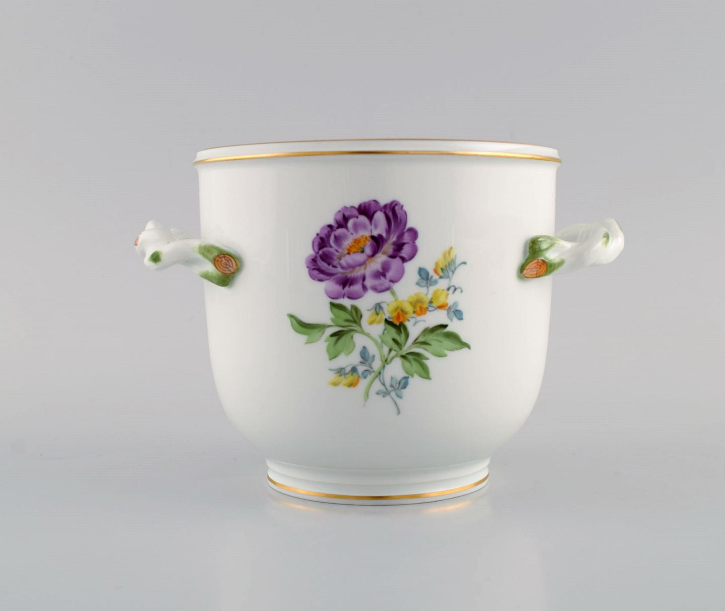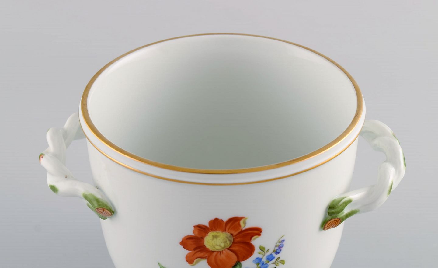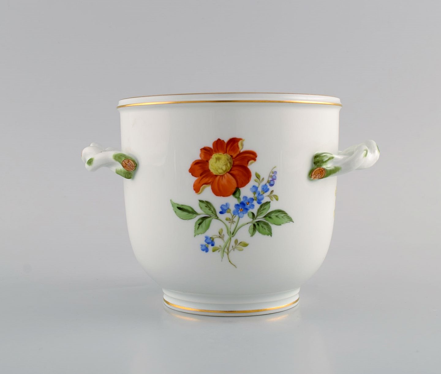 Meissen vase / urtepotte i håndmalet porcelæn med blomster og guldkant. Hanke modeleret som grene. Tidligt 1900-tallet. Måler: 16 x 11 cm. I flot stand. Stemplet. 1. Sortering.