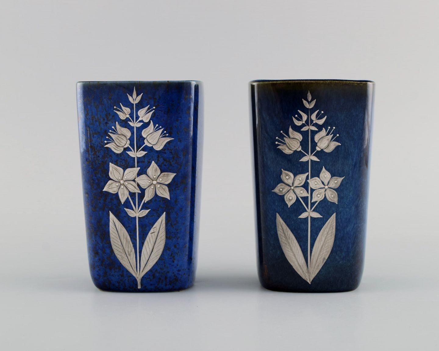 Sven Jonson (1919-1989) Gustavsberg. Two Lagun vases in glazed stoneware with silver inlays in the form of flowers. Beautiful glaze in shades of blue. 1970s.