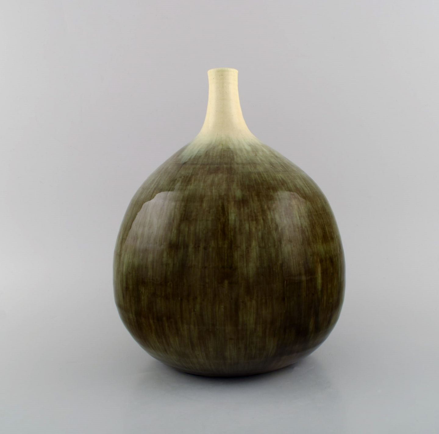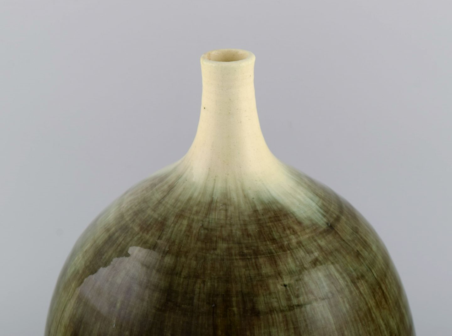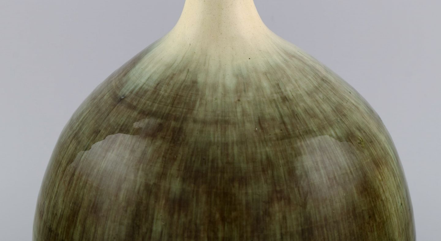 Large narrow neck Accolay vase in glazed stoneware. Beautiful glaze in sand and light earth shades. 1960s. Measures: 25.5 x 21 cm. In excellent condition. Signed.