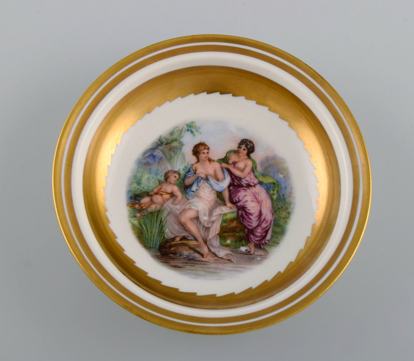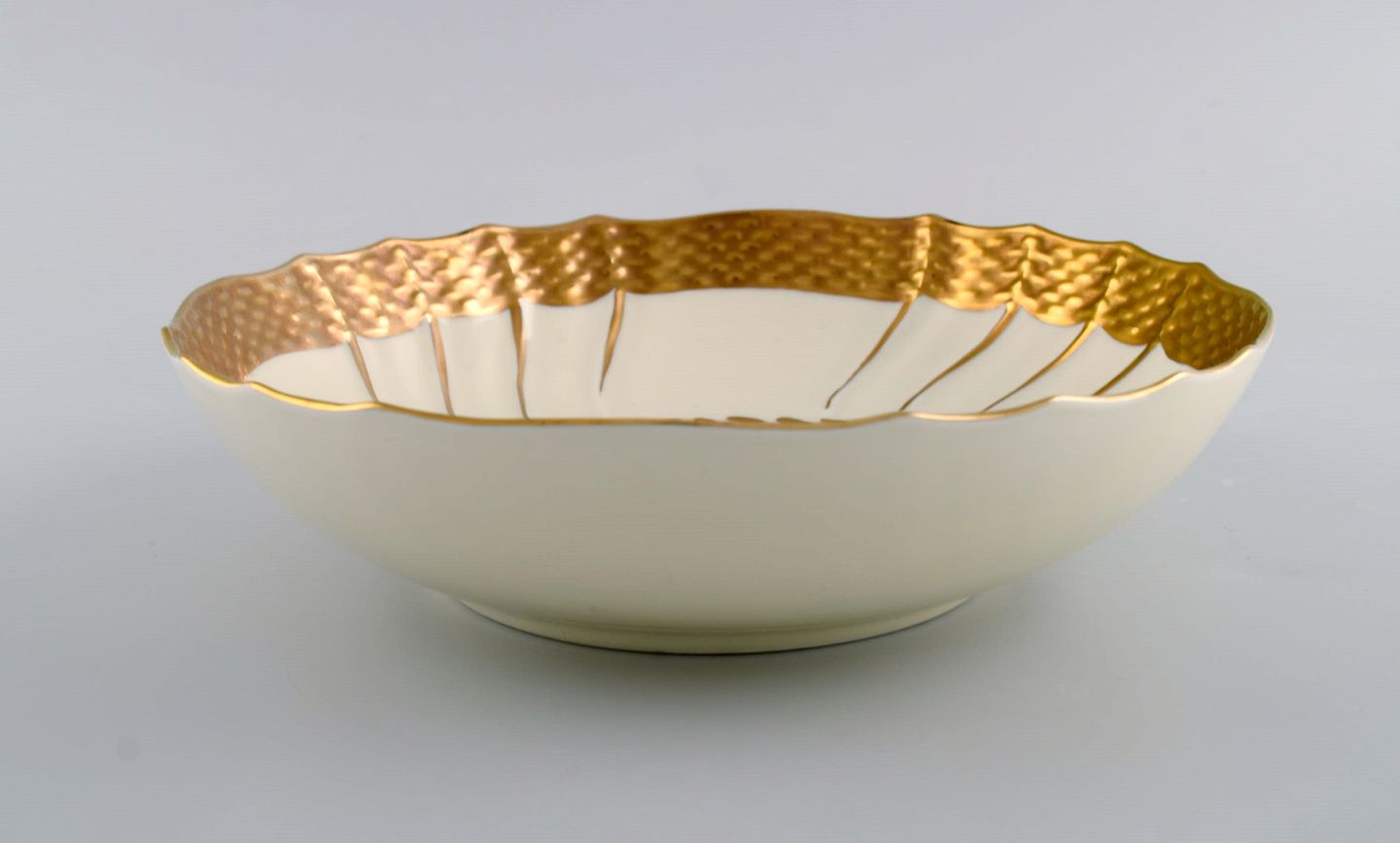 Three Royal Copenhagen bowls decorated with flowers and romantic scenery. Gold decoration. Mid-20th century. Largest measures: 21 x 5.5 cm. In excellent condition. Stamped. 2nd factory quality.