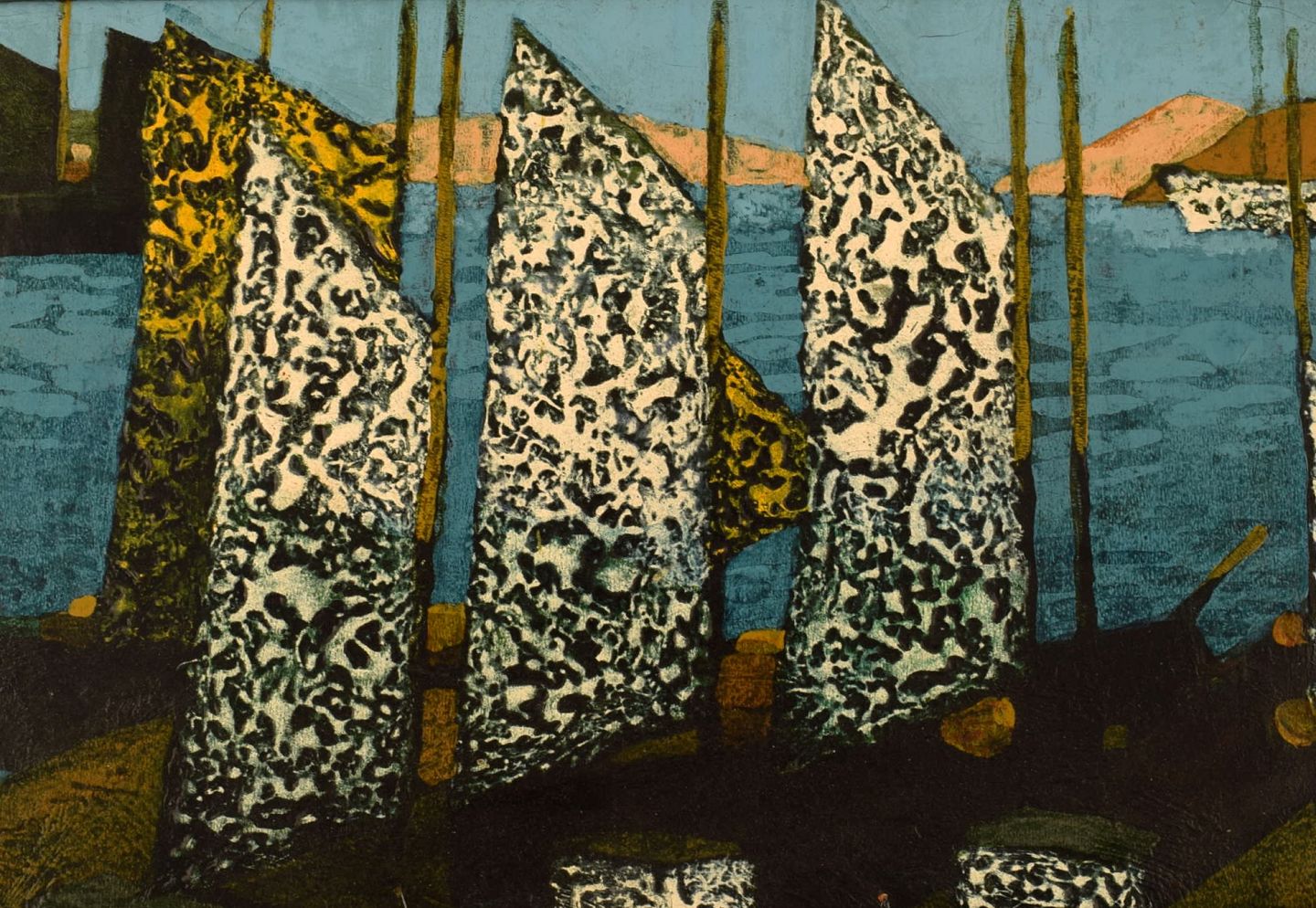 Sven Ahlgren (1922-1997), Sverige. Olie på plade. Modernistisk landskab med fiskerbåde. Dateret 1965. Pladen måler: 79 x 24 cm. Rammen måler: 4 cm. I flot stand. Signeret.