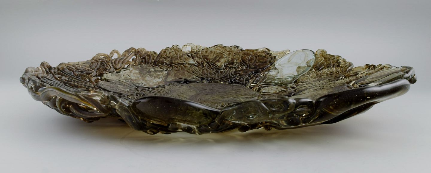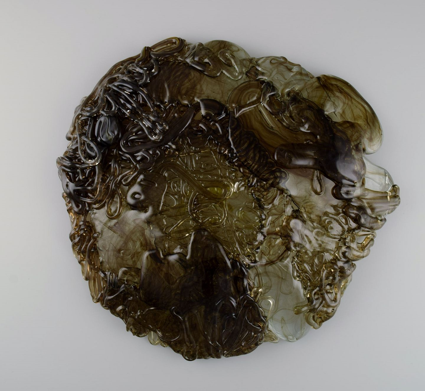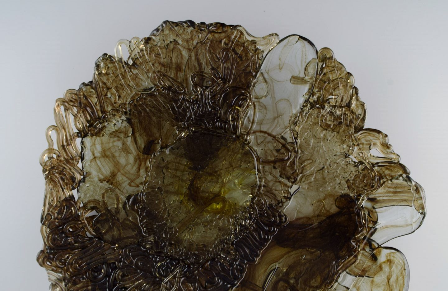 Per Lütken for Holmegaard. Kolossalt unika fad / skål i røgfarvet mundblæst kunstglas. Dansk design, 1970'erne. Måler: 47 x 7,5 cm. I flot stand.