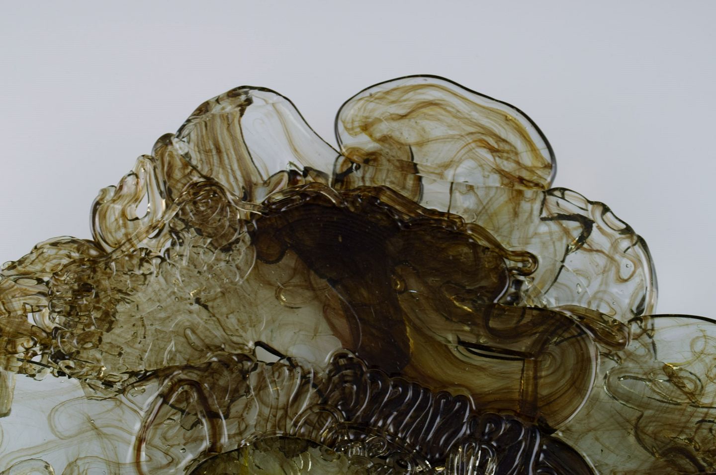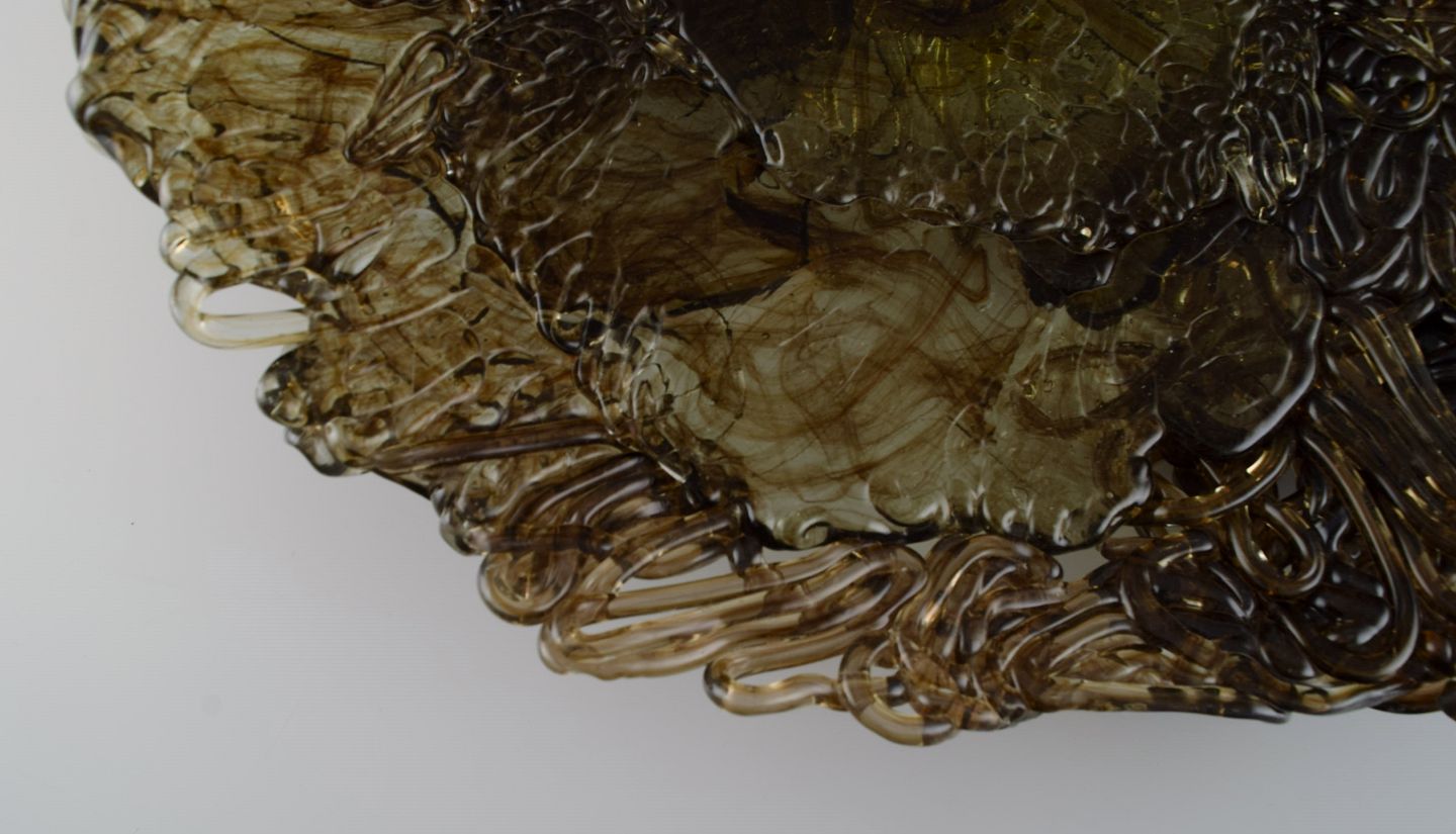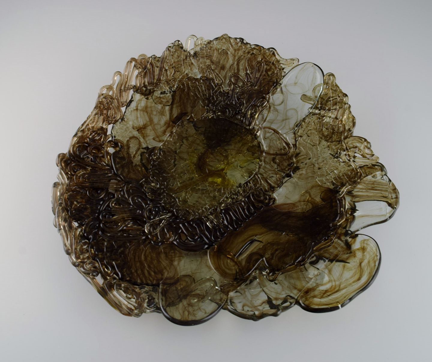 Per Lütken for Holmegaard. Kolossalt unika fad / skål i røgfarvet mundblæst kunstglas. Dansk design, 1970'erne. Måler: 47 x 7,5 cm. I flot stand.