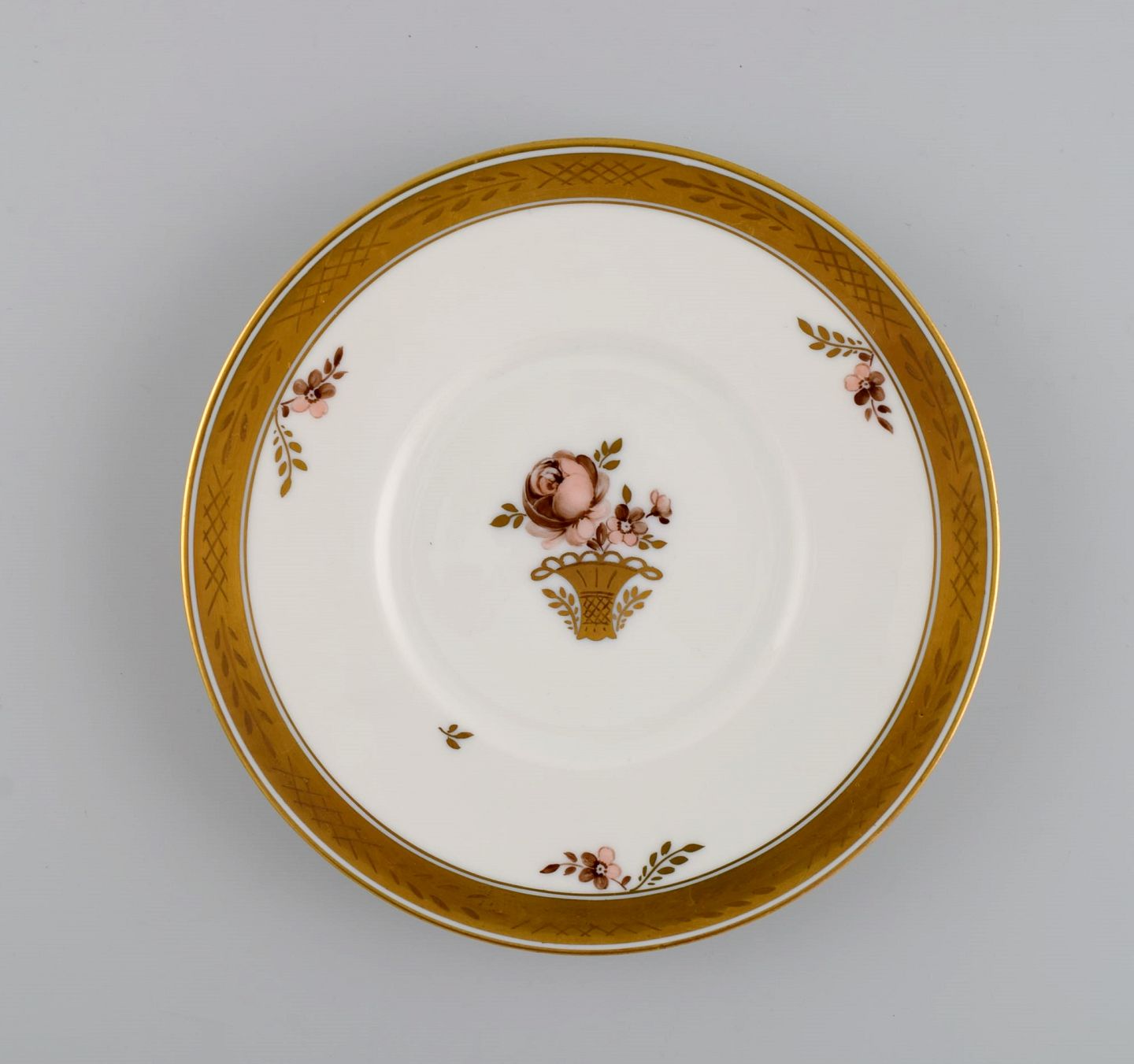 Tolv Royal Copenhagen Guldkurv kagetallerkener i håndmalet porcelæn med blomster og gulddekoration. 1930érne. Modelnummer 595/10522. Diameter: 15,6 cm. I flot stand. Stemplet. 1. Sortering.