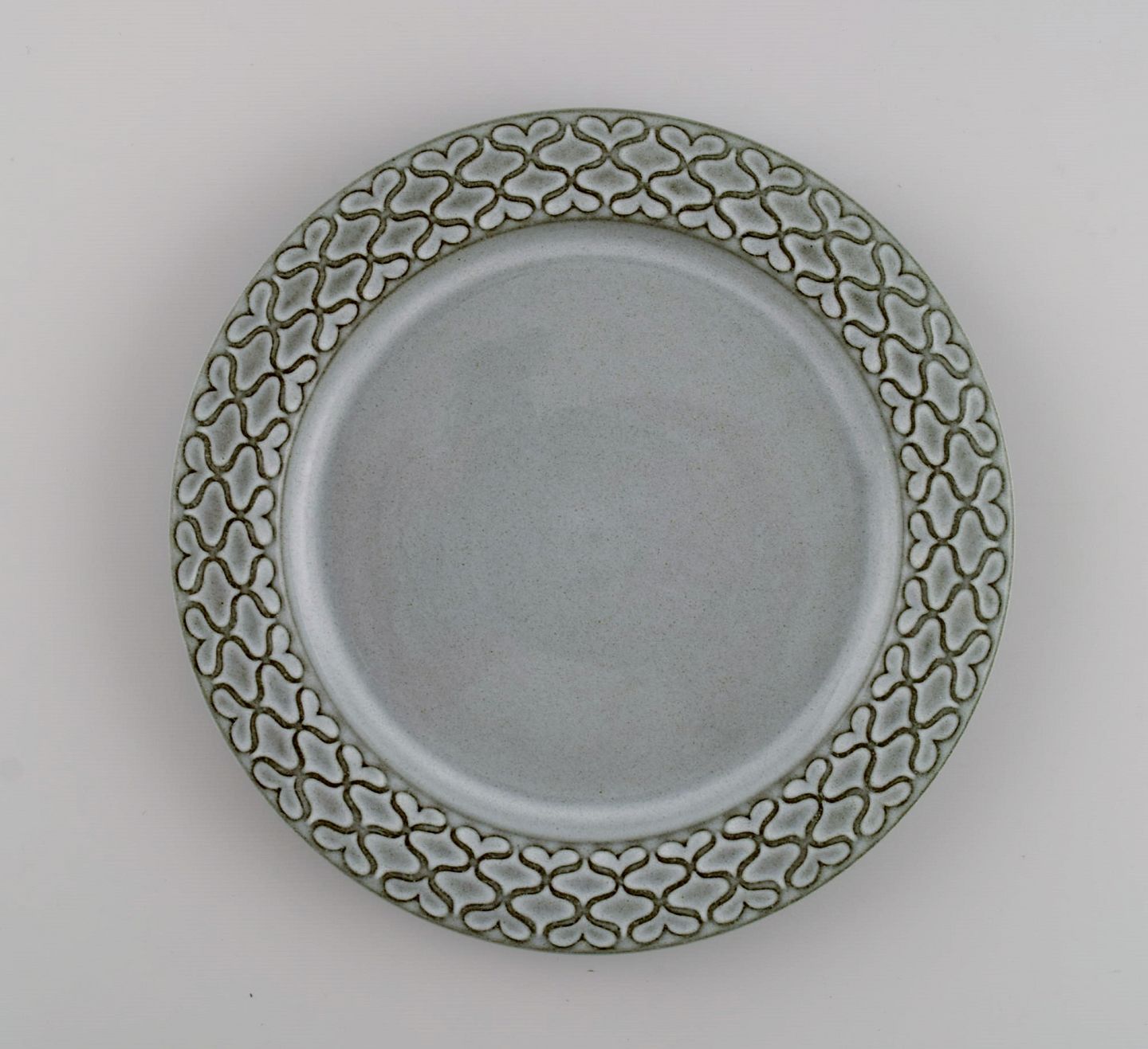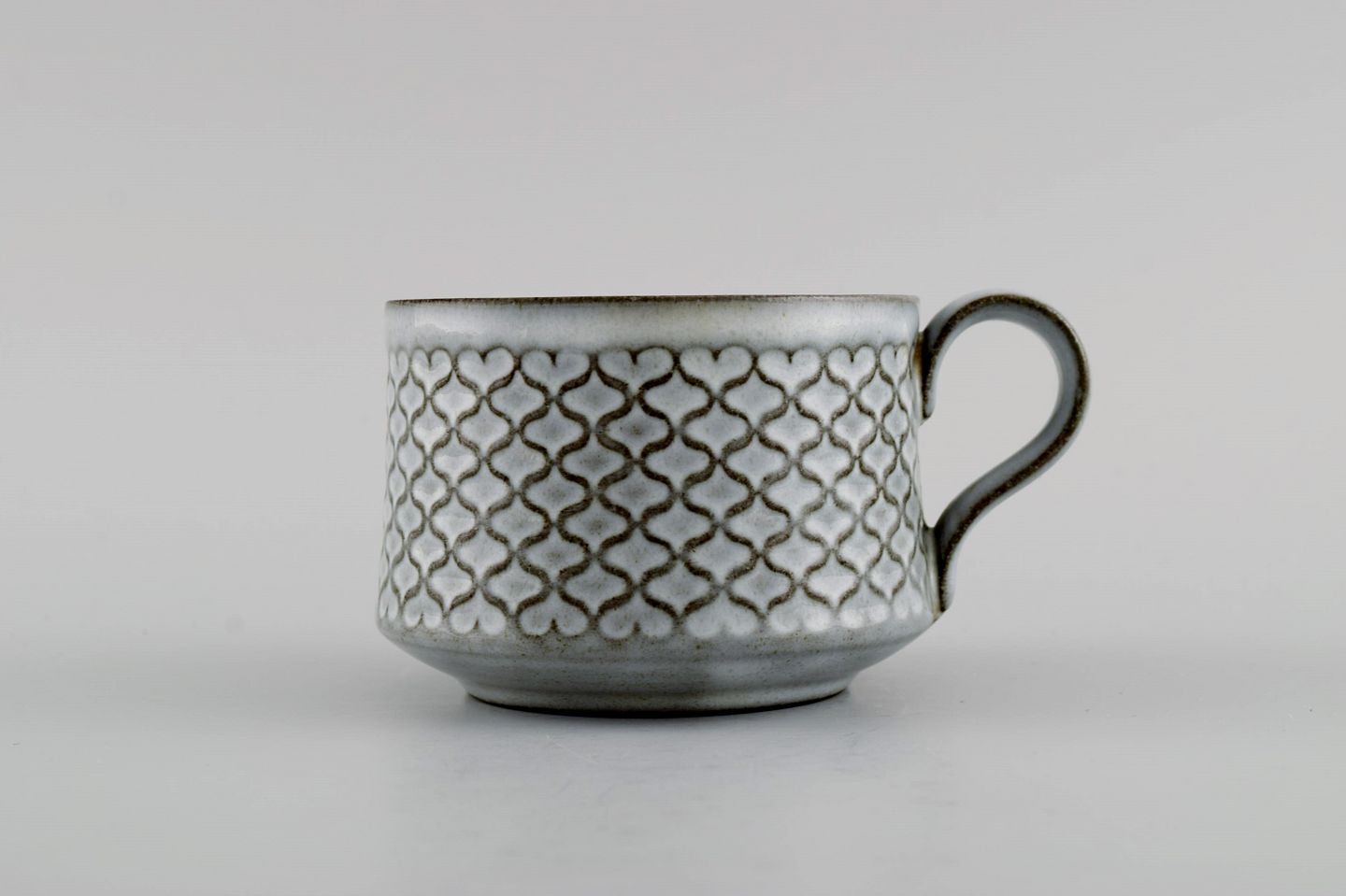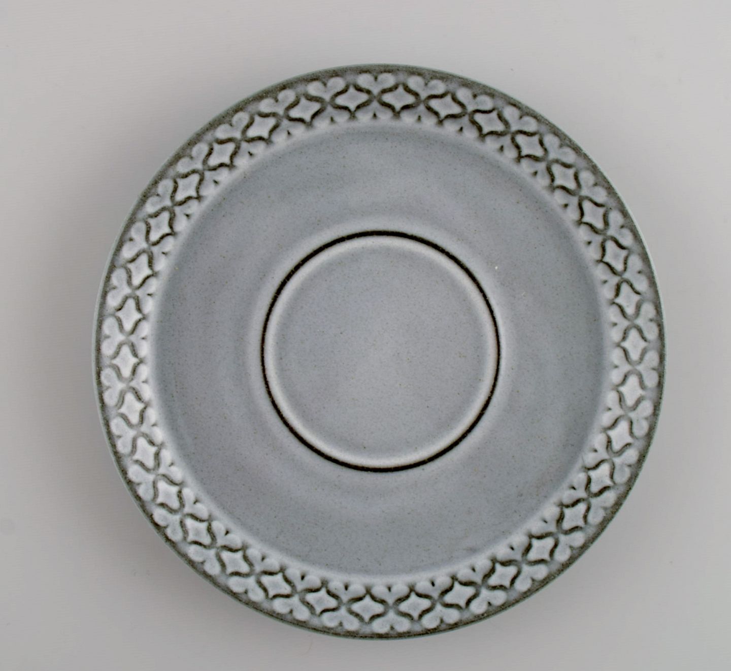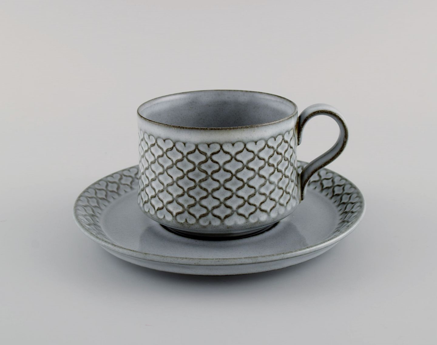 Jens H. Quistgaard (1919-2008) for Bing & Grøndahl / Nissen Kronjyden. Two Gray Cordial teacups with saucers and two plates in glazed stoneware. 1960s.