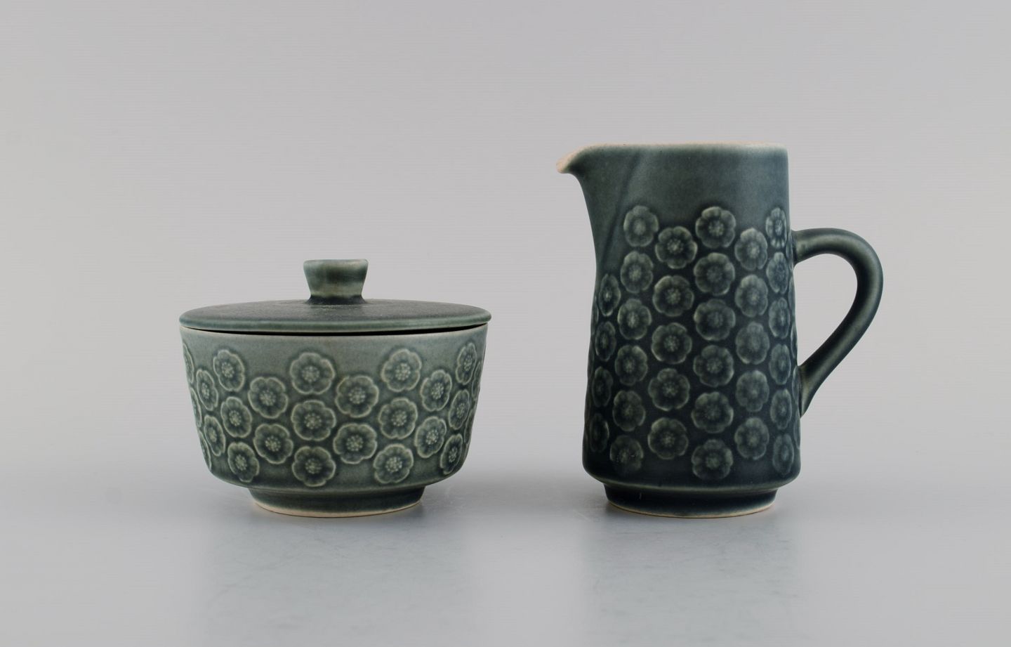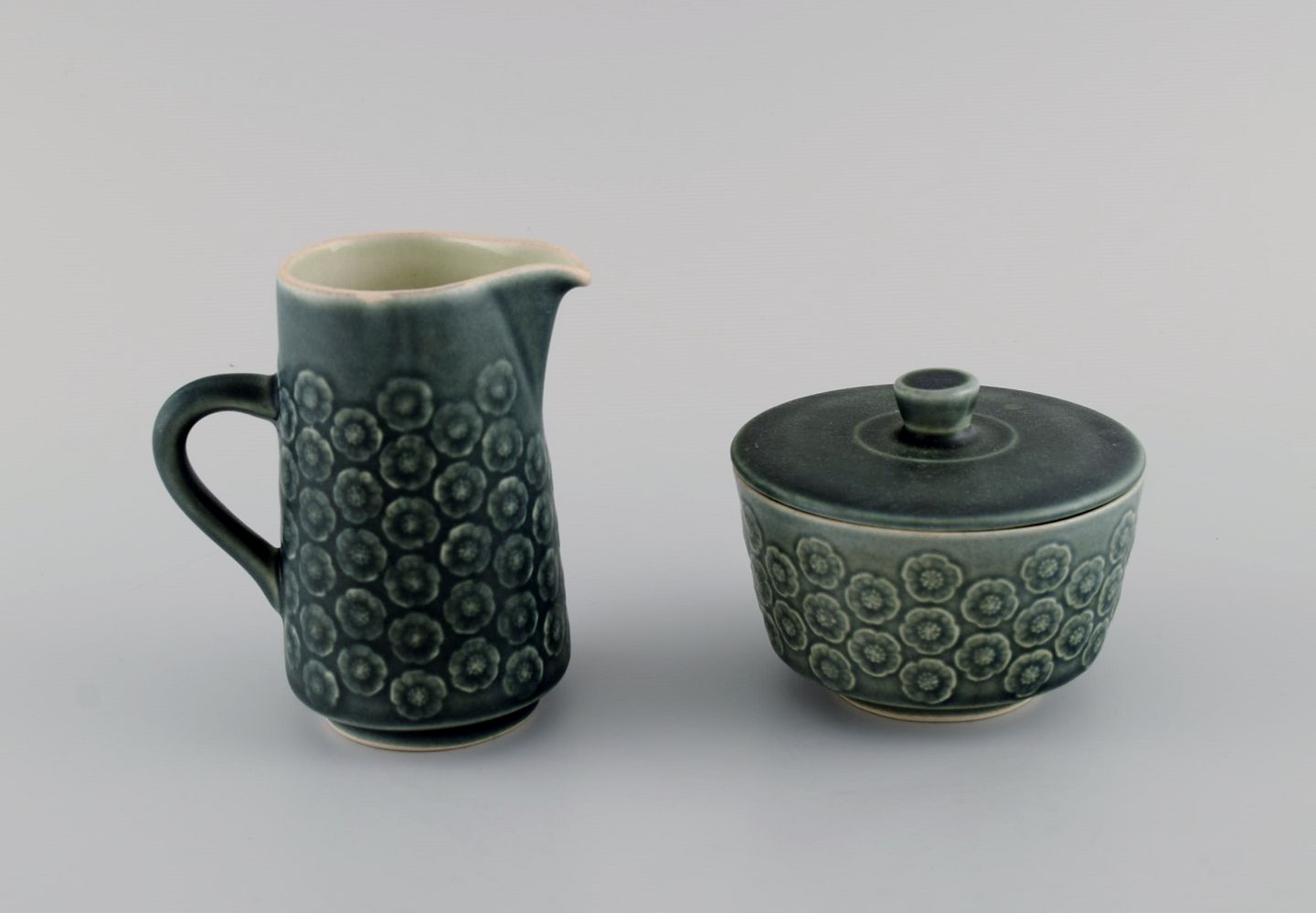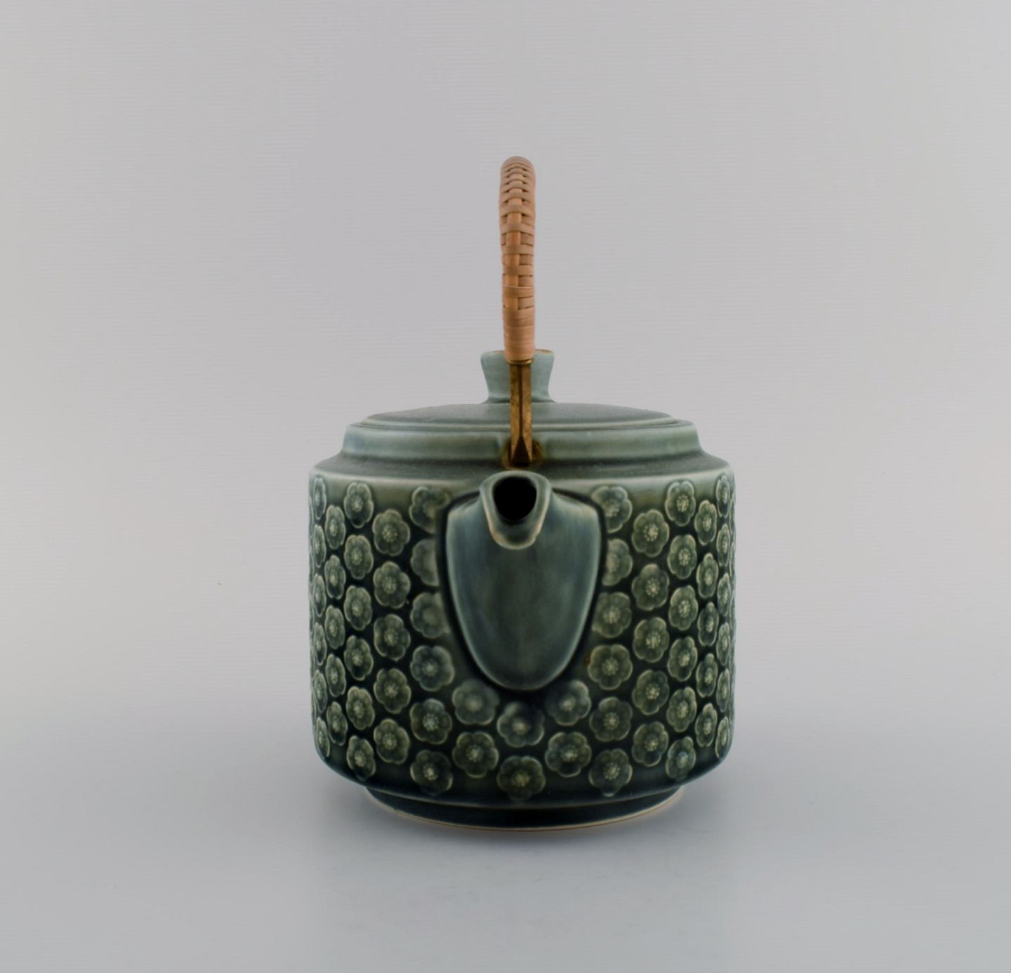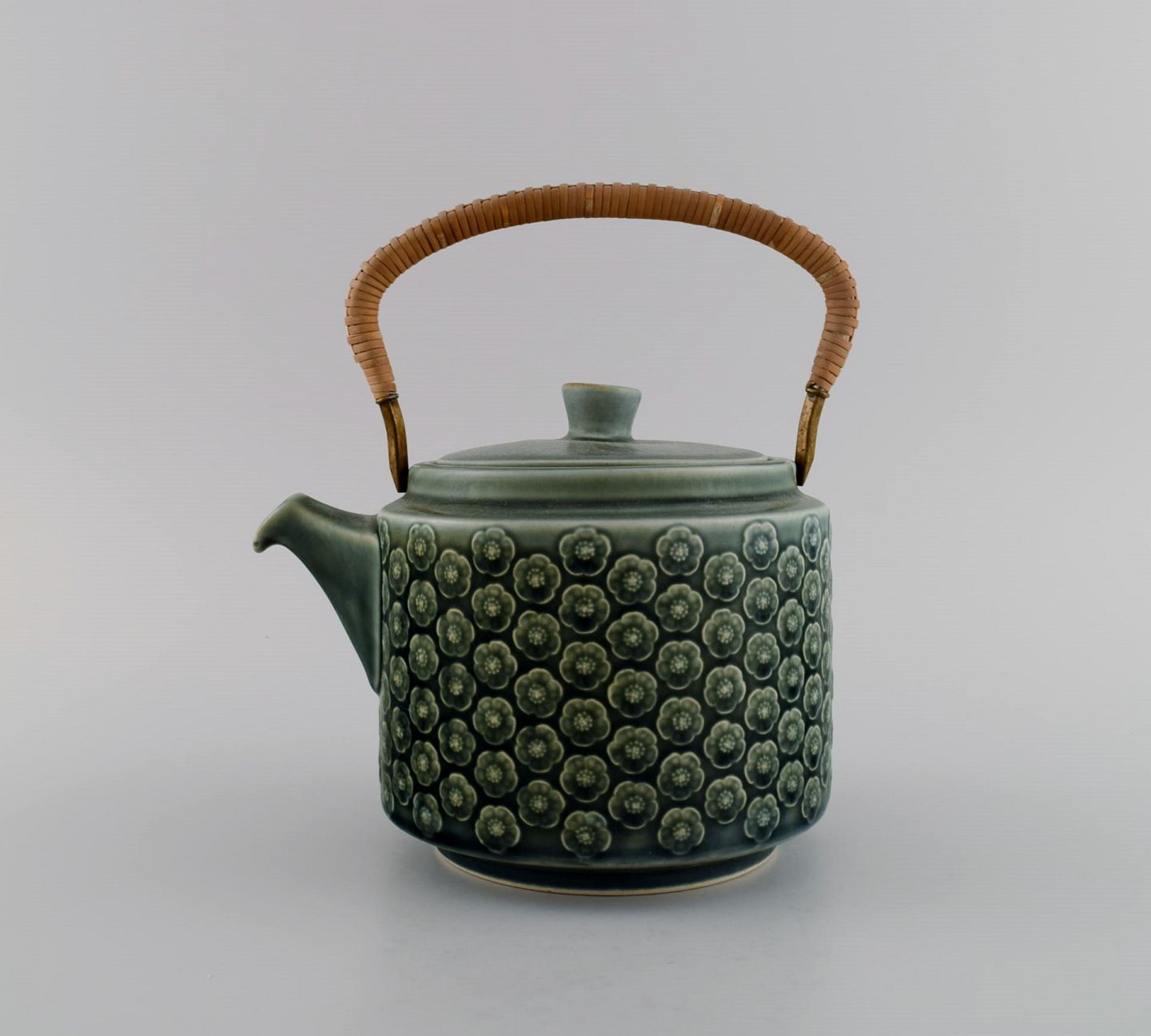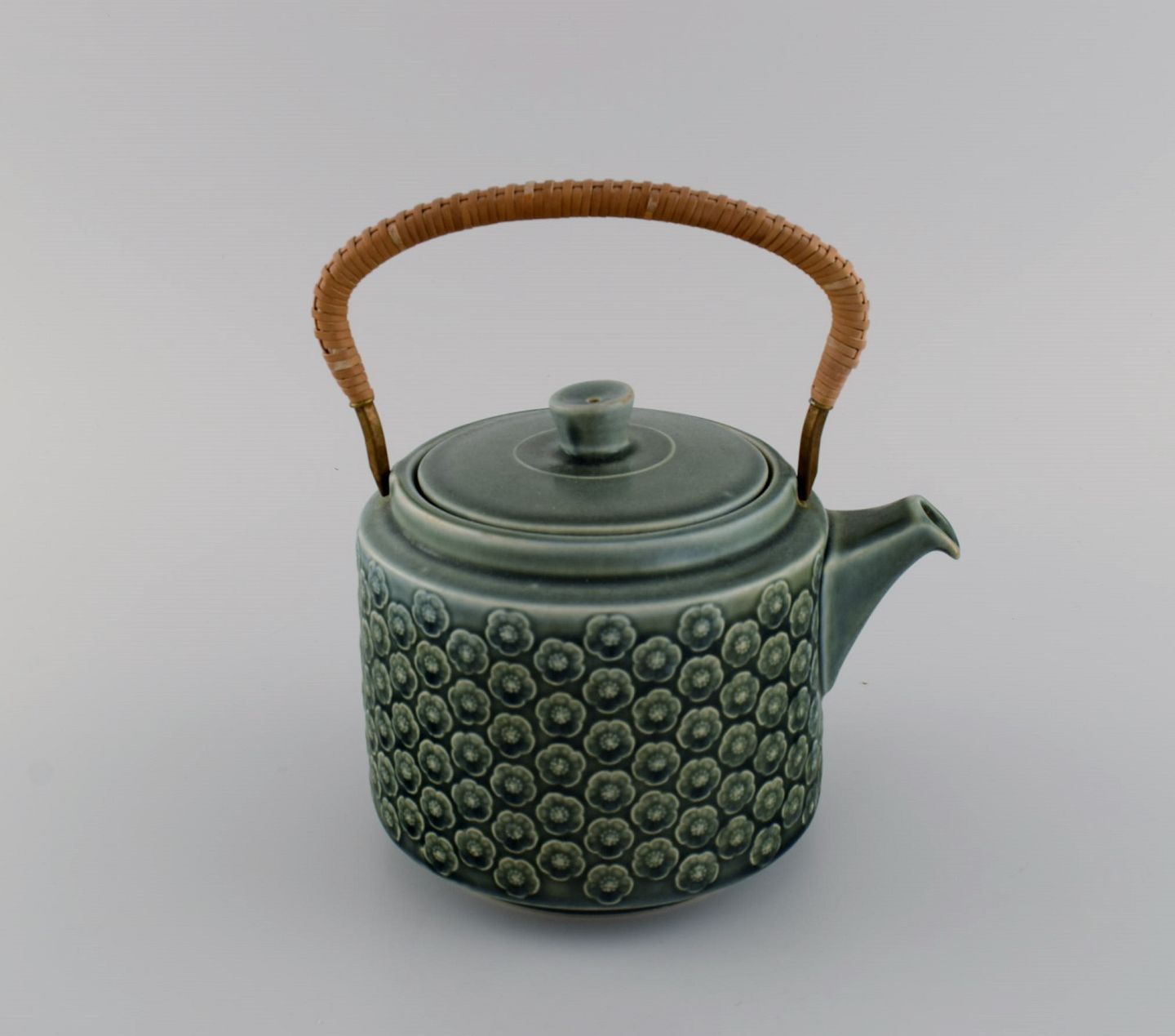 Jens H. Quistgaard (1919-2008) for Nissen Kronjyden. Azur teapot with wicker handle, sugar bowl and cream jug in glazed stoneware. 1960s.