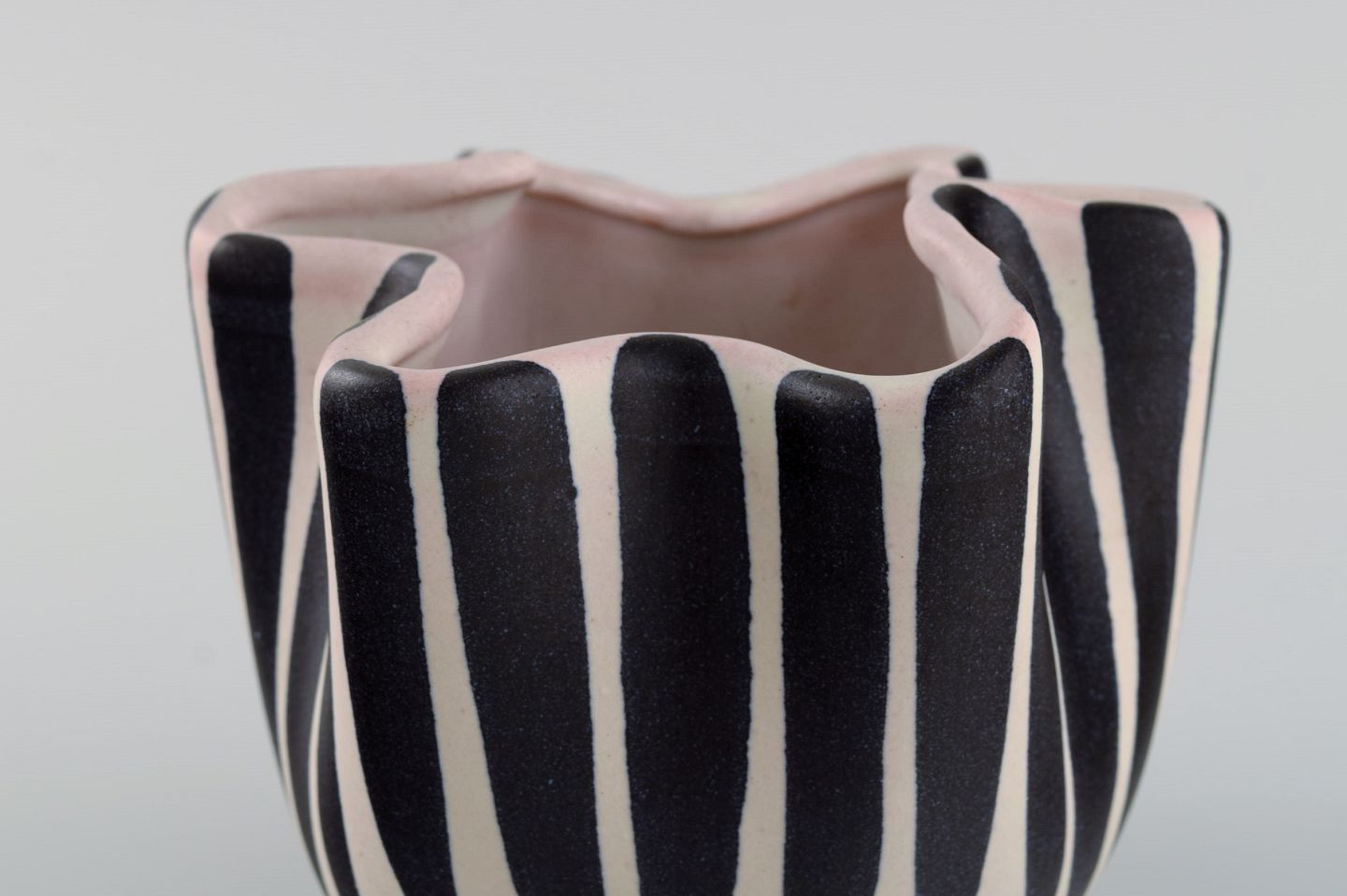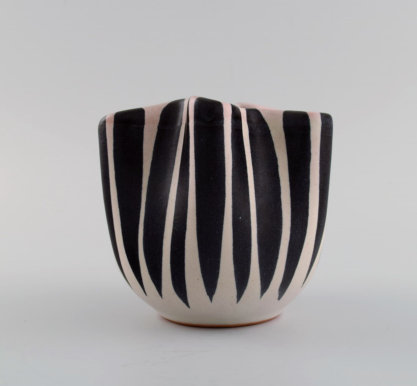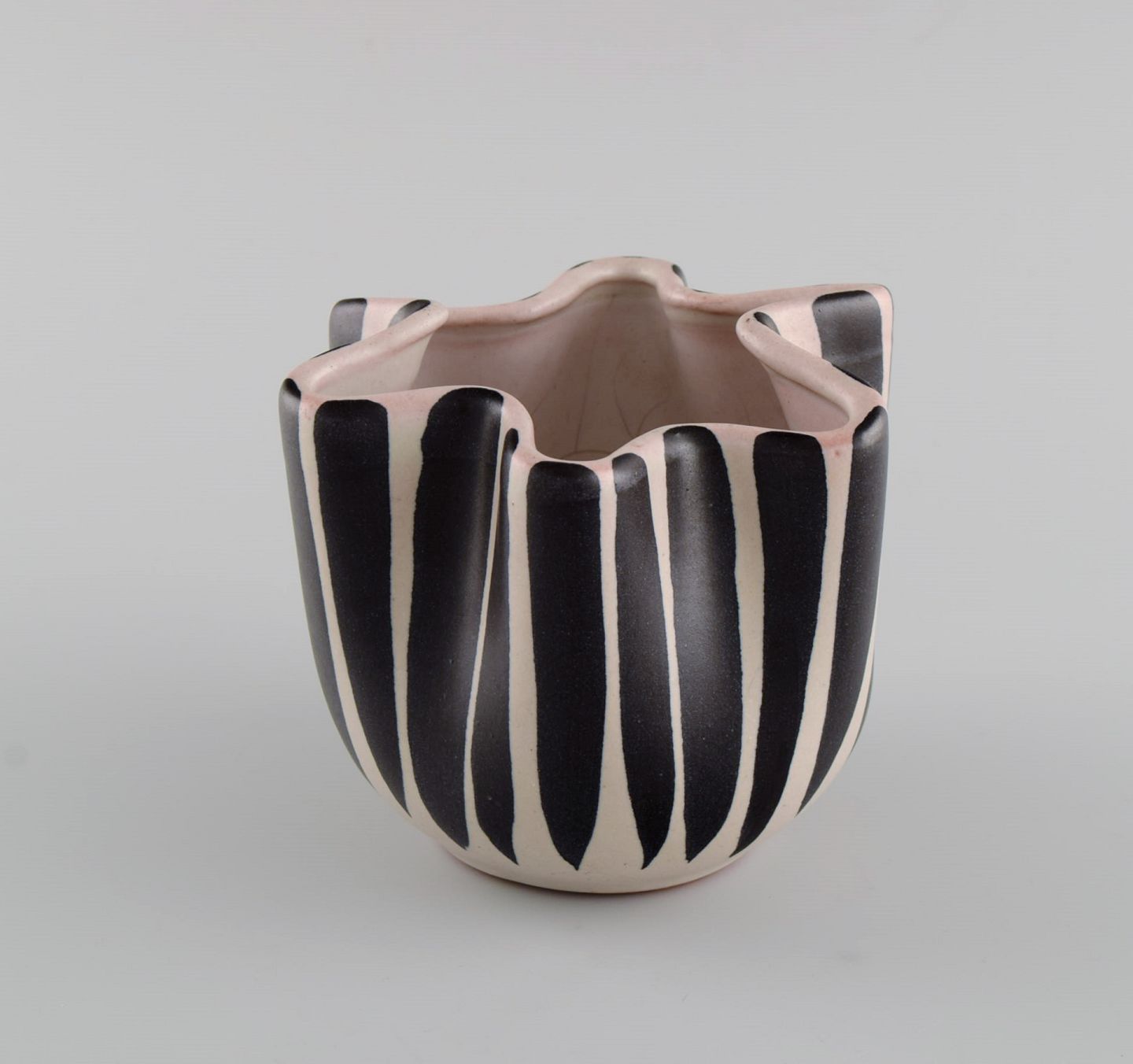 European studio ceramicist. Unique vase with wavy edge in glazed ceramics. Striped design, 1960s / 70s. Measures: 12 x 11 cm. In excellent condition.