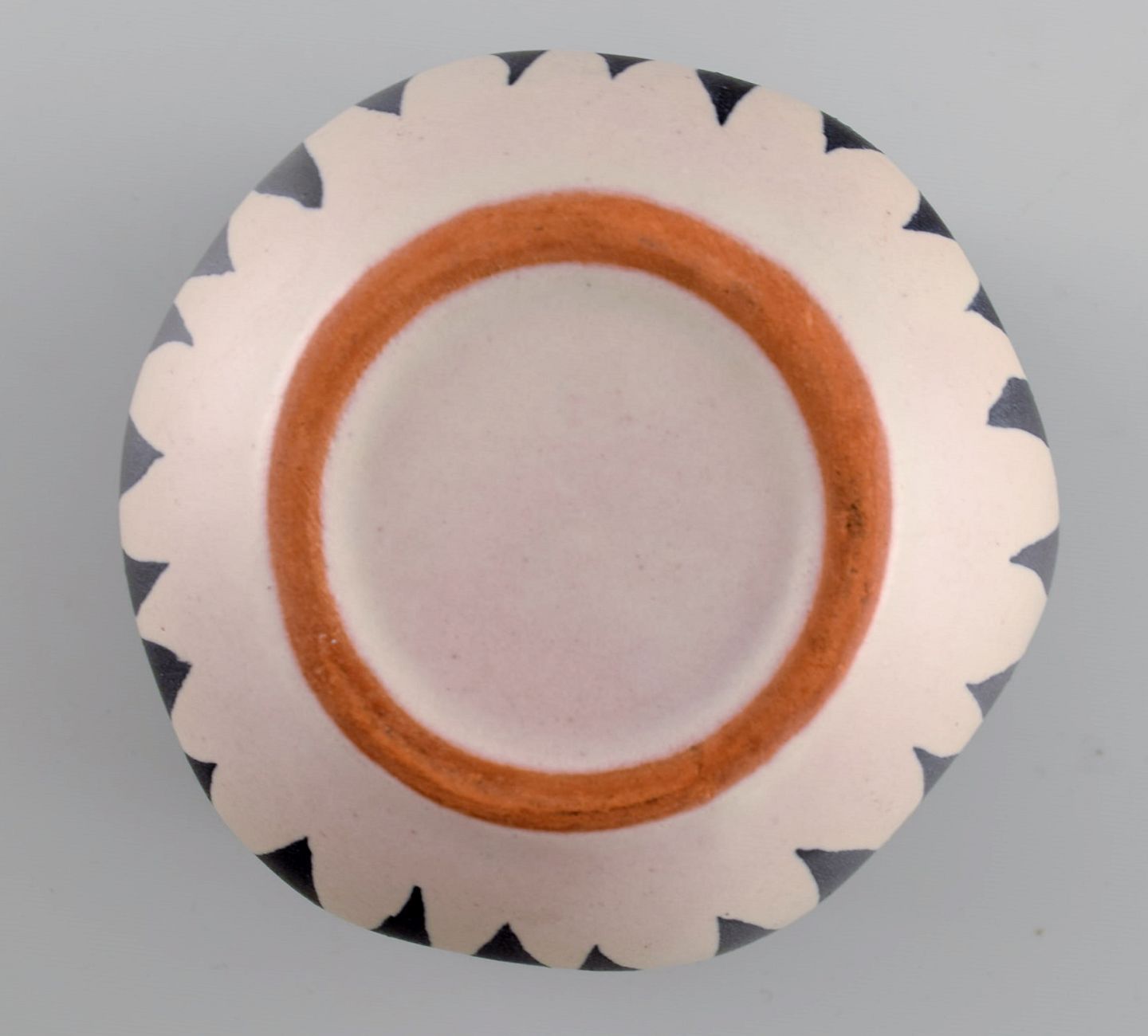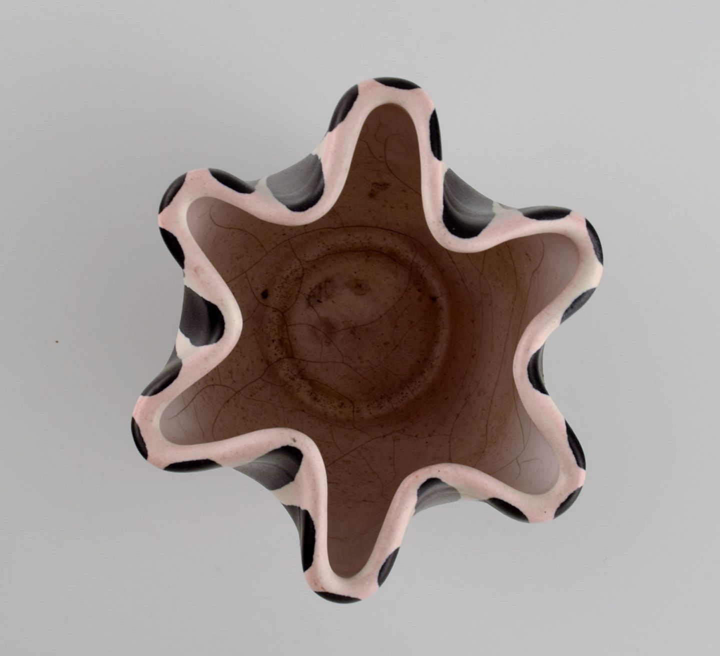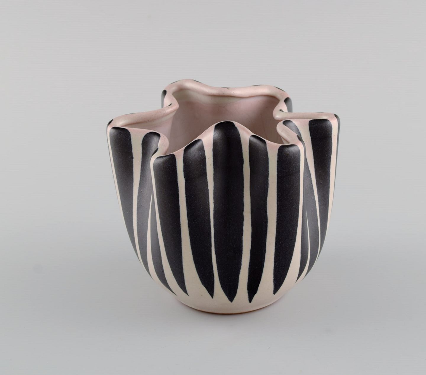 European studio ceramicist. Unique vase with wavy edge in glazed ceramics. Striped design, 1960s / 70s. Measures: 12 x 11 cm. In excellent condition.