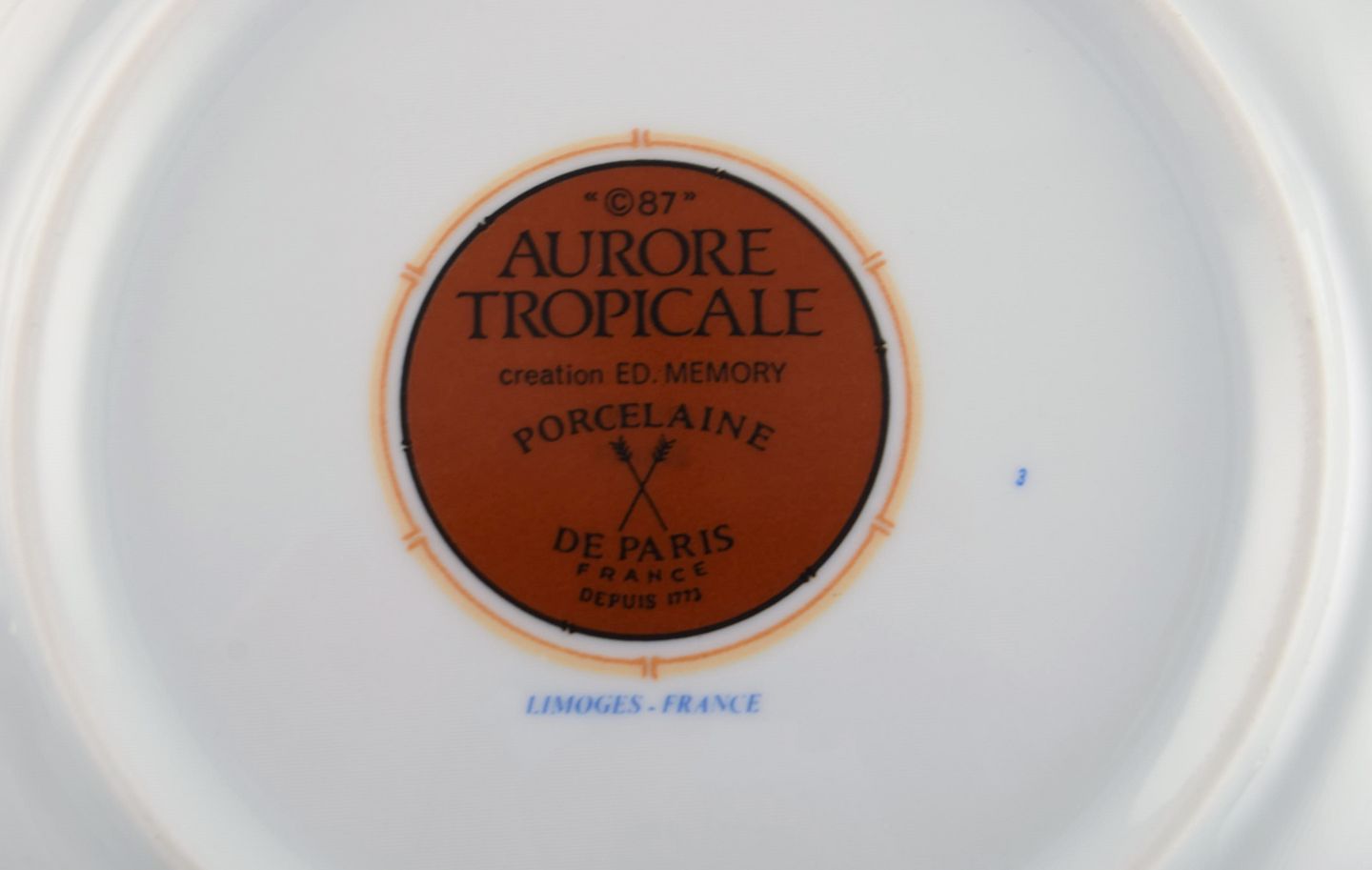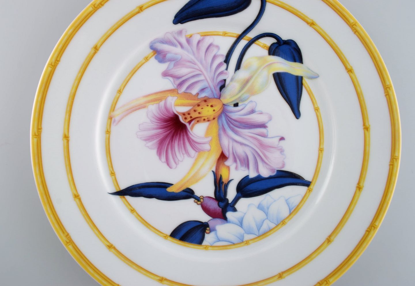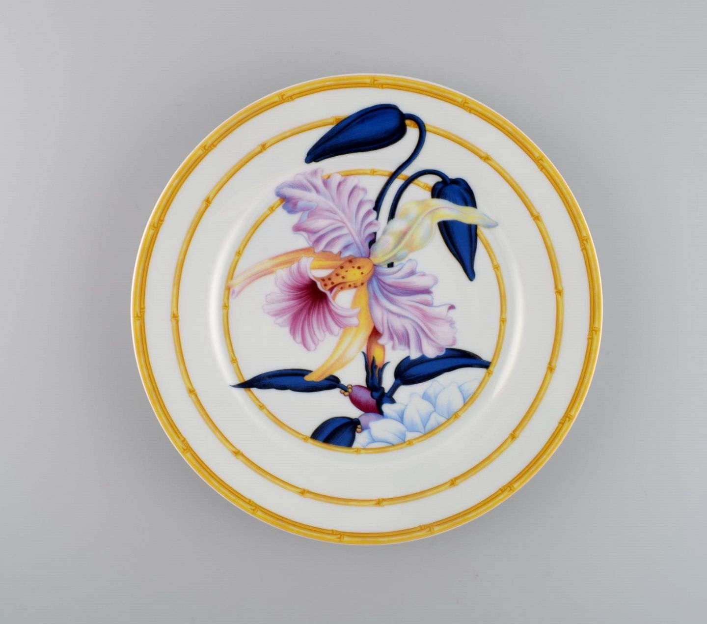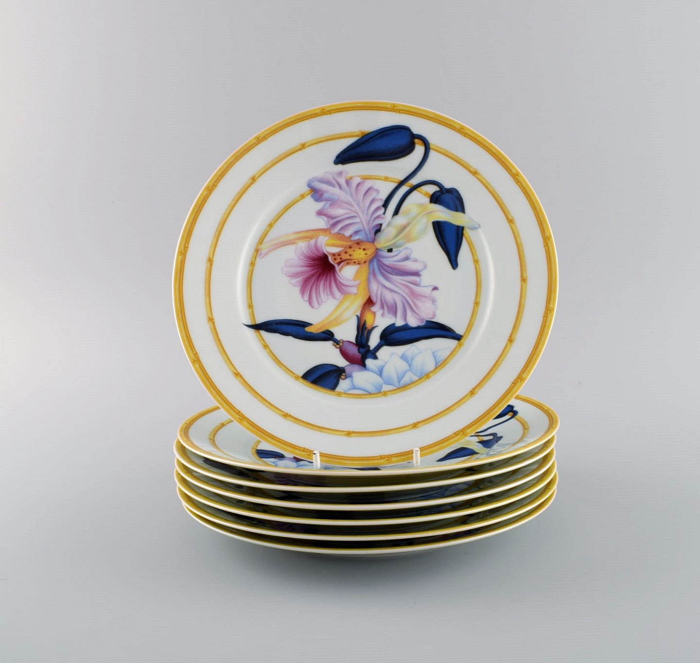 Porcelaine de Paris. "Aurore Tropicale". Seks frokosttallerkener i porcelæn dekoreret med blomster og bambus. 1980'erne. Diameter: 22 cm. I flot stand. Stemplet.