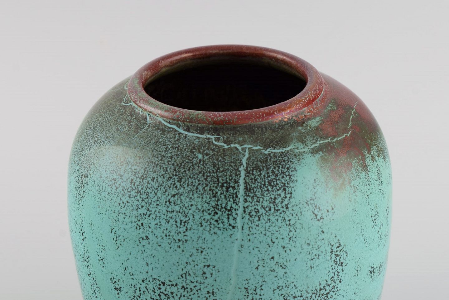 Richard Uhlemeyer (1900-1954), Tyskland. Vase i glaseret keramik. Smuk krakeleret glasur i mørke og turkis nuancer. 1940'erne. Måler: 16 x 13 cm. I flot stand. Stemplet.