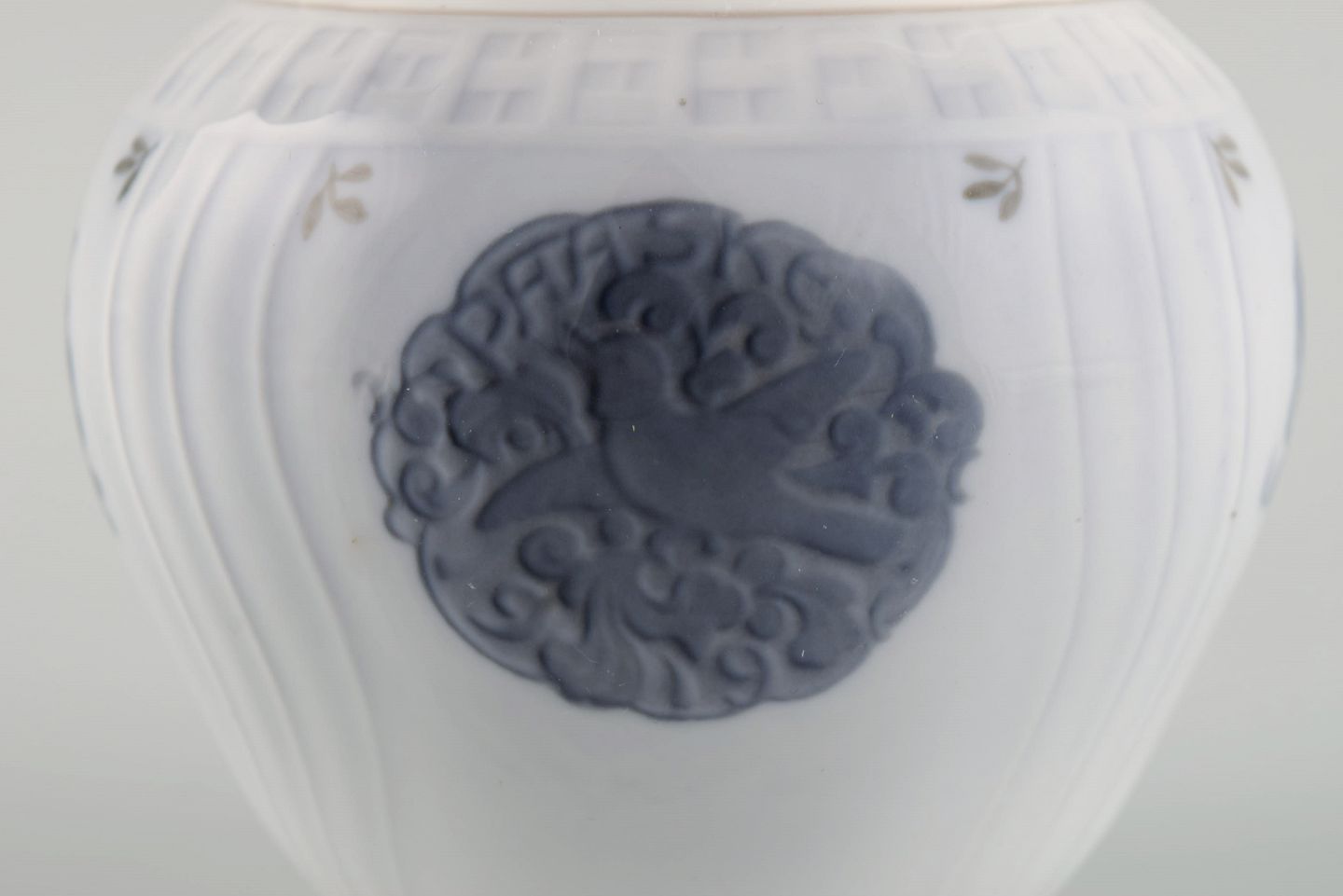 Royal Copenhagen påske lågkrukke i håndmalet porcelæn. Lågknop modelleret som fugl. Dateret 1919. Måler: 15 x 11,5 cm. I flot stand. Mikro skår på fuglens næb. Stemplet.