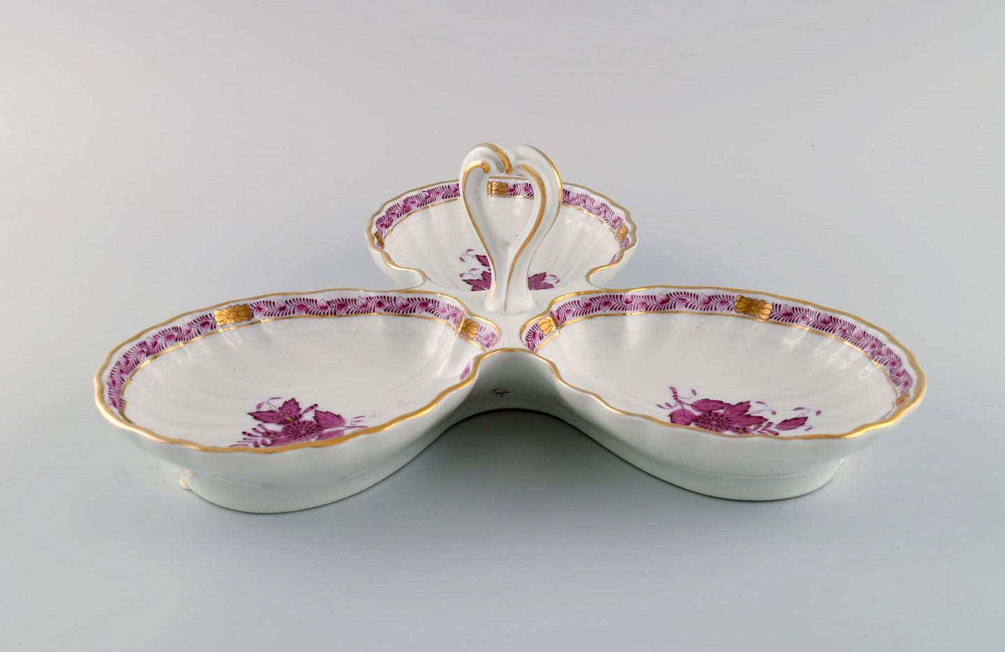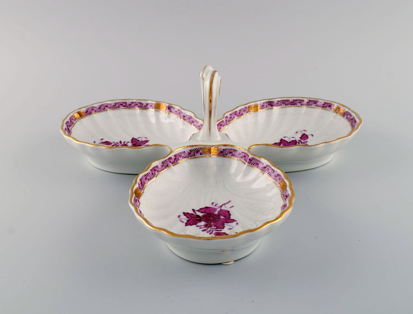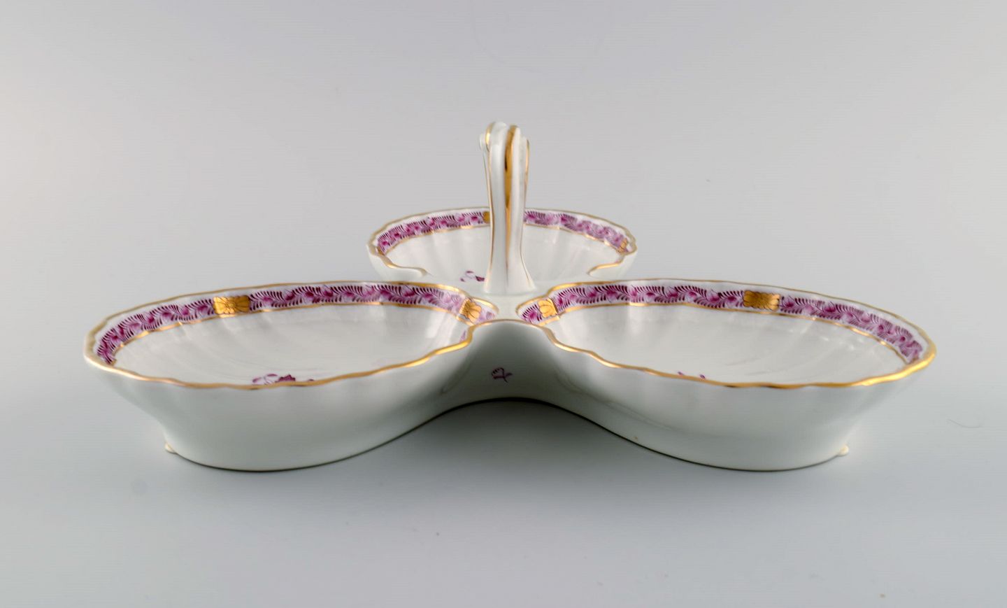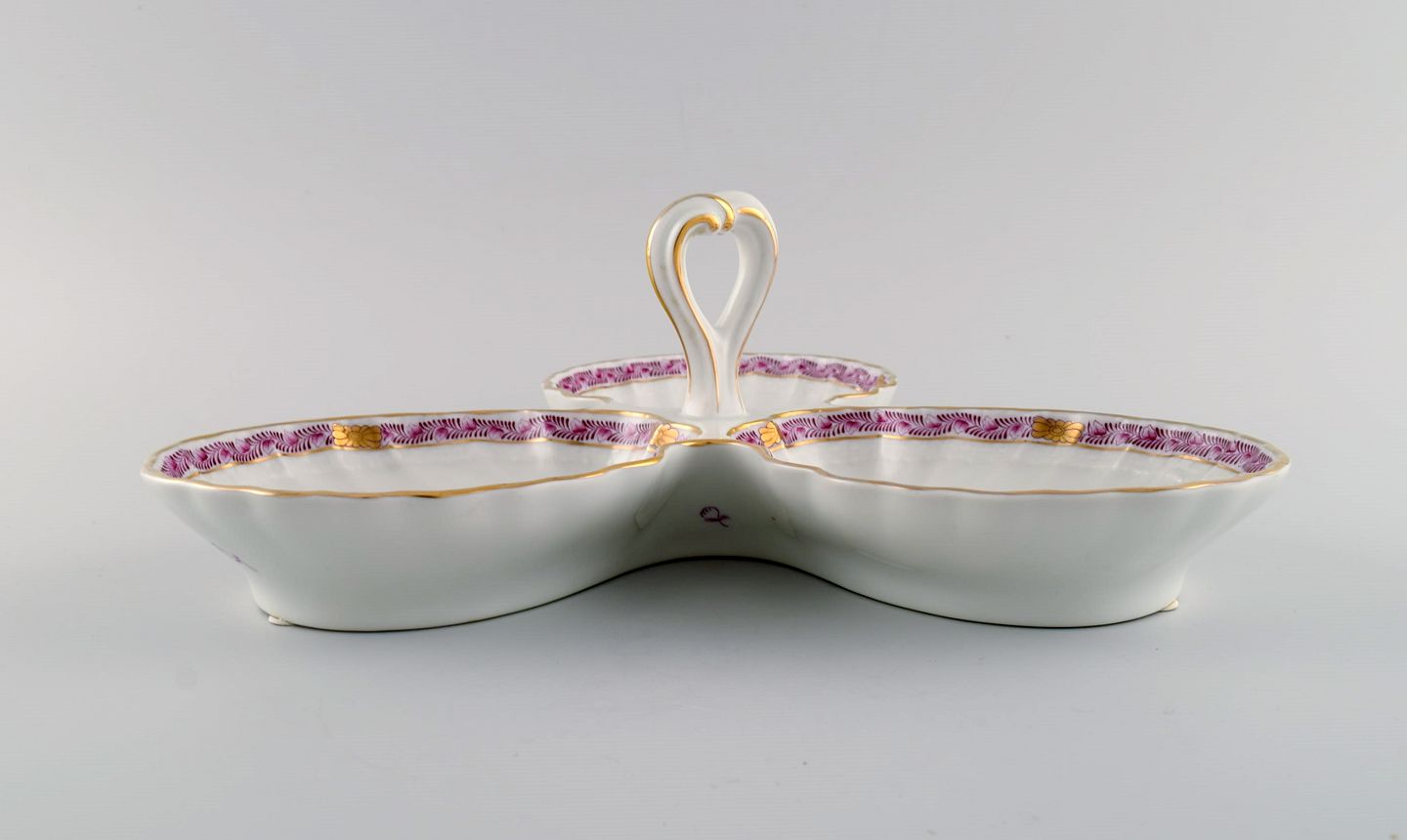 Herend Chinese Bouquet Raspberry. Tredelt serveringsfad med hank i håndmalet porcelæn. Lyserøde blomster og gulddekoration. Midt 1900-tallet.