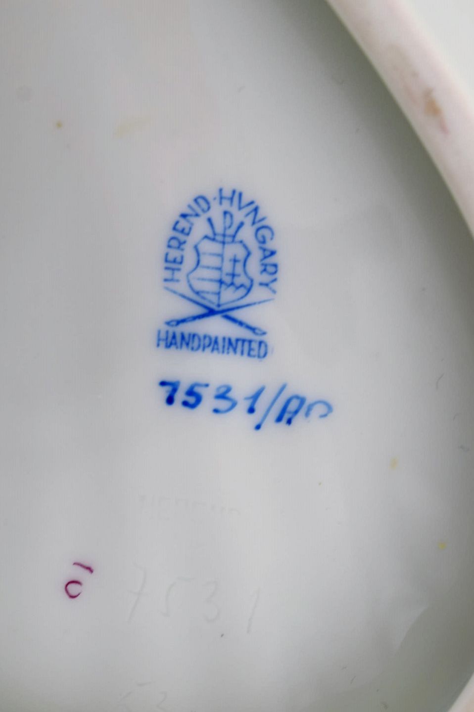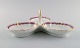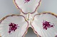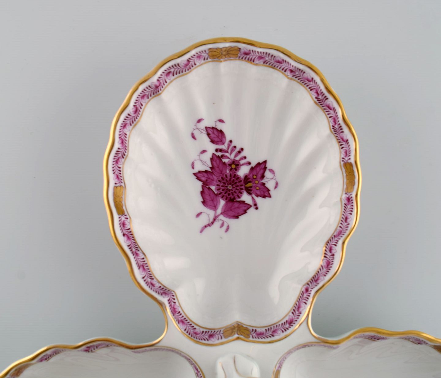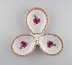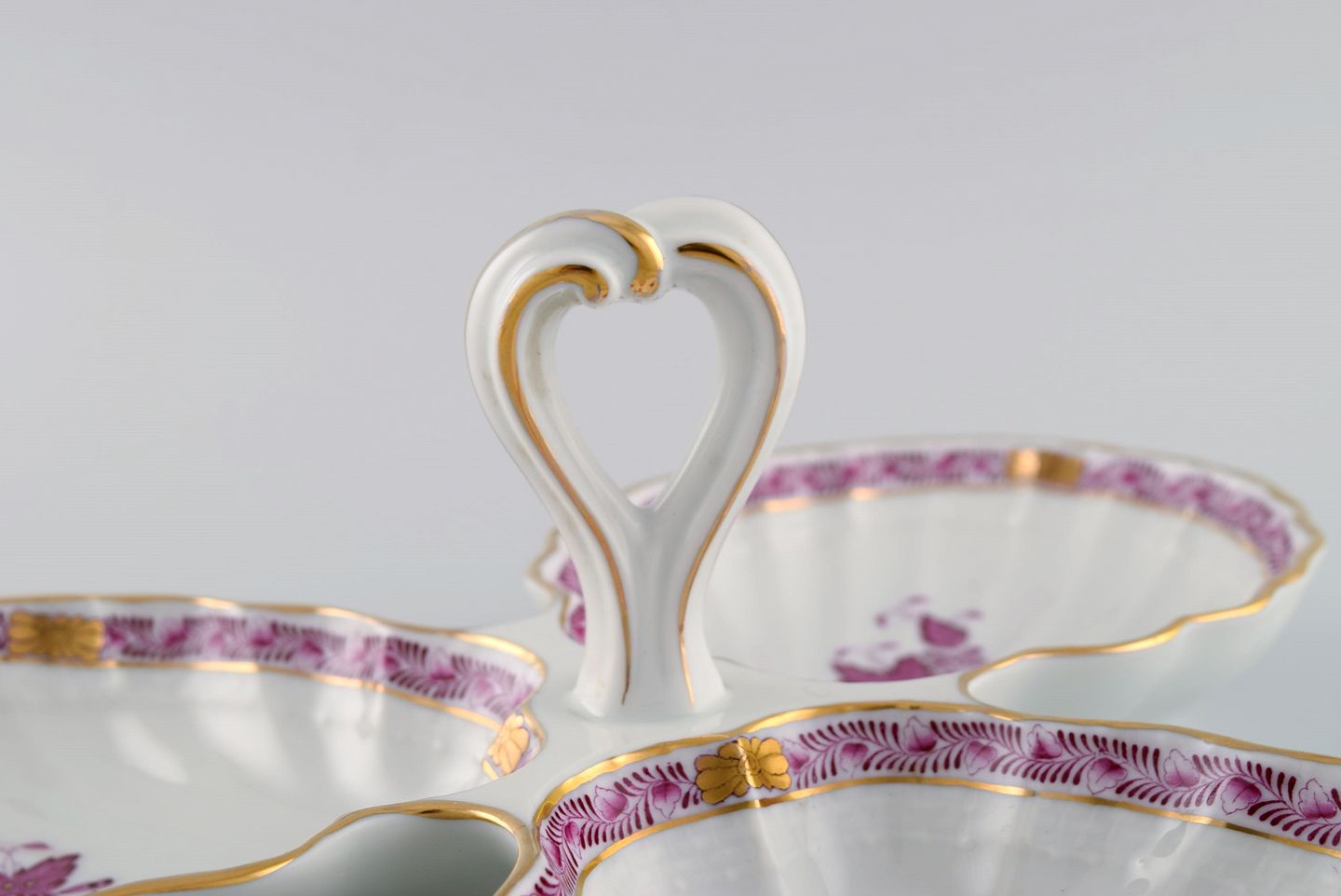 Herend Chinese Bouquet Raspberry. Tredelt serveringsfad med hank i håndmalet porcelæn. Lyserøde blomster og gulddekoration. Midt 1900-tallet.