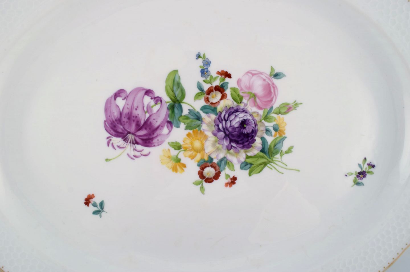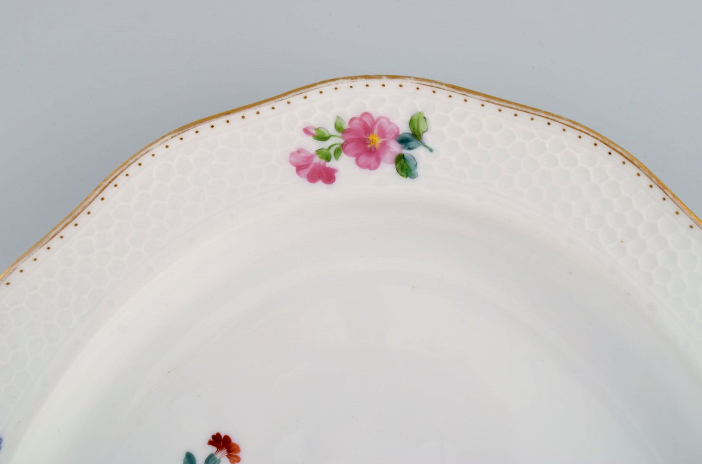 Royal Copenhagen Saxon Flower special version. Large and rare serving dish with hand-painted flowers and gold decoration. Approx. 1900.