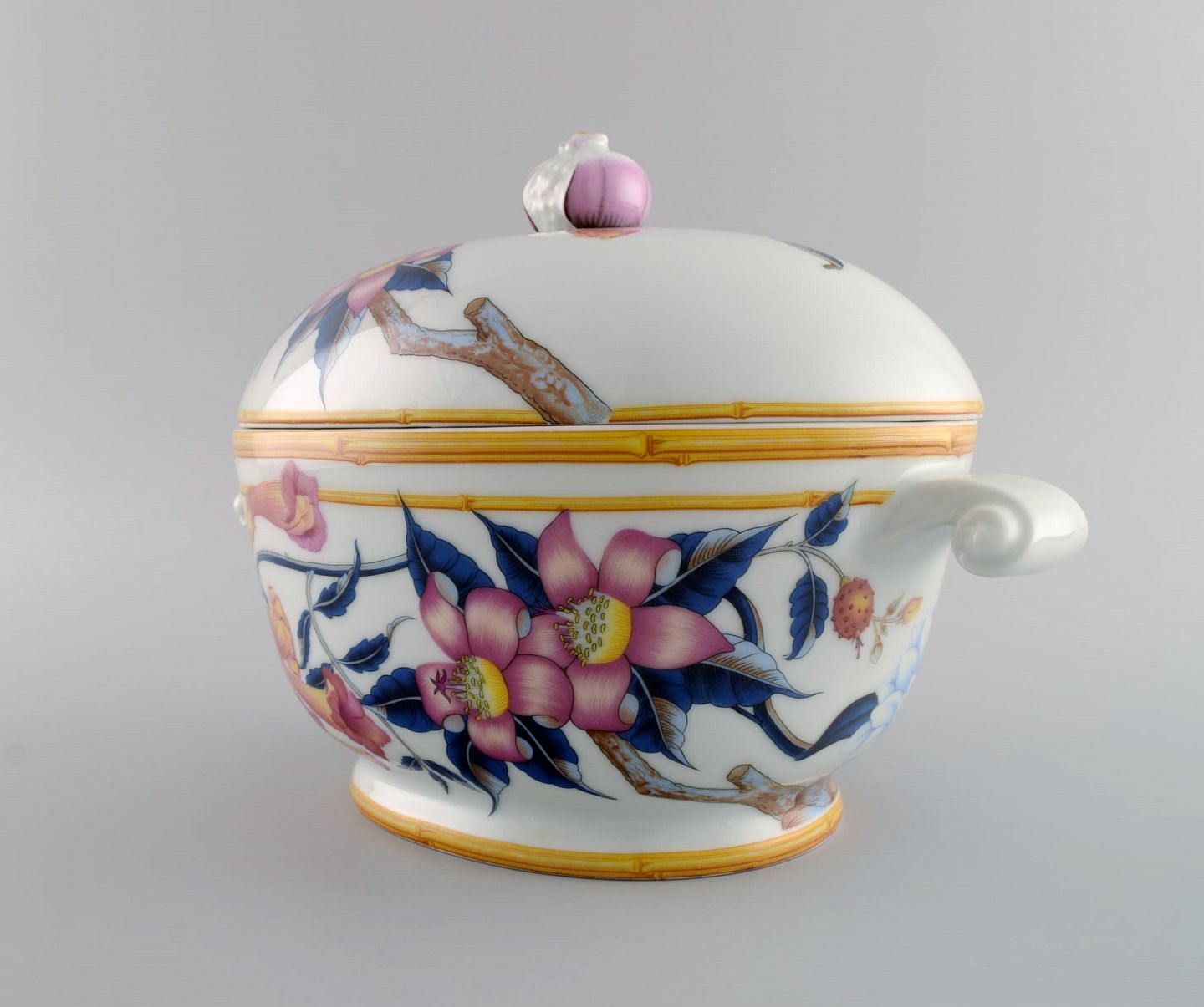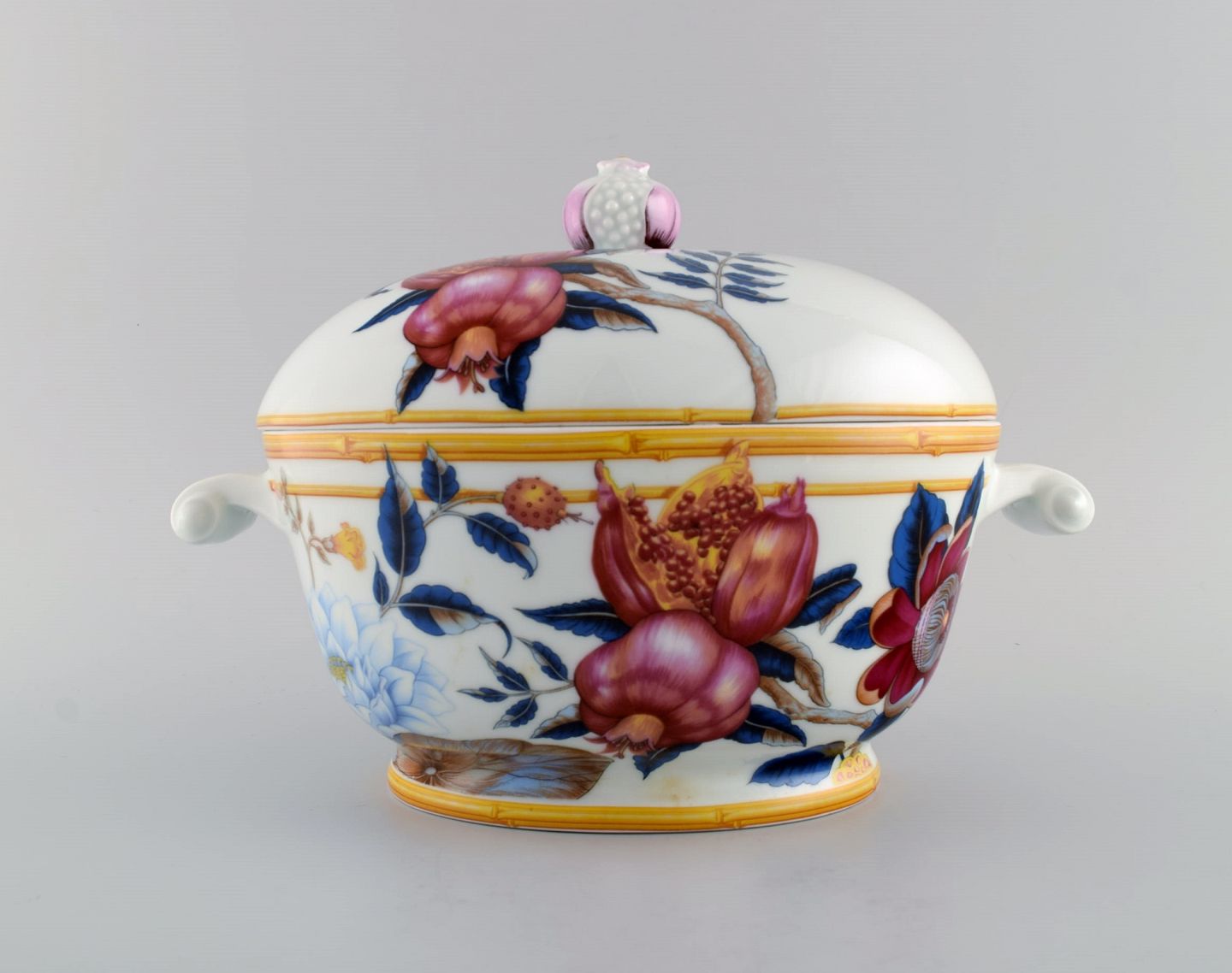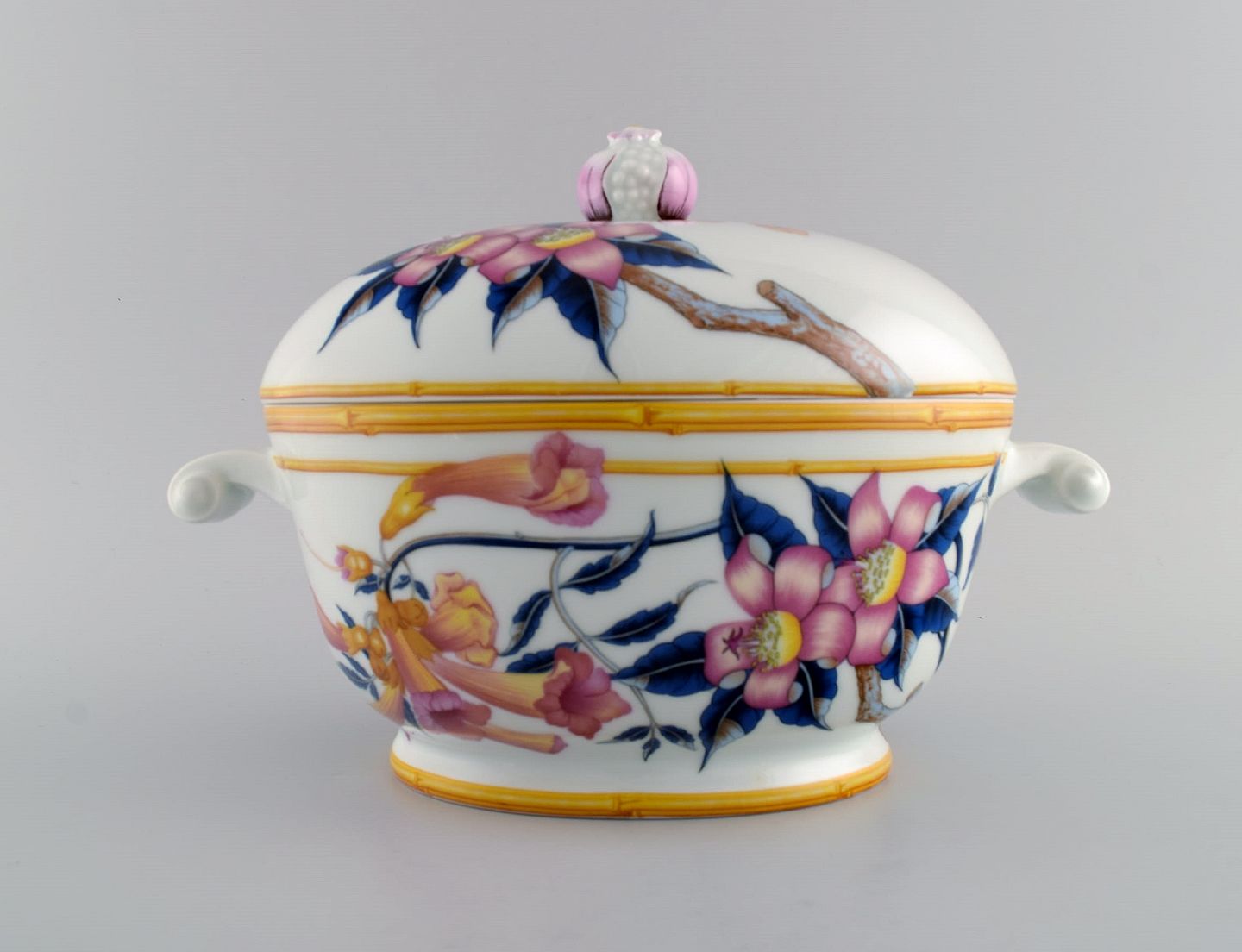 Porcelain of Paris. "Tropical Aurore". Porcelain lidded tureen decorated with flowers, pomegranates and bamboo. 1980s. Measures: 28.5 x 19 cm. In excellent condition. Stamped.