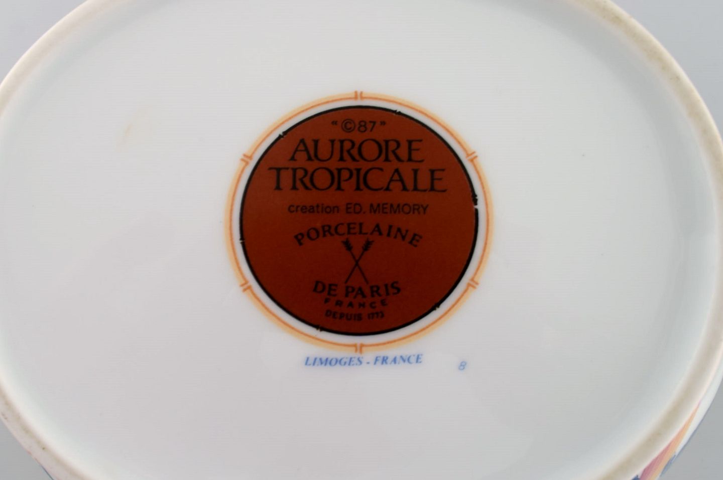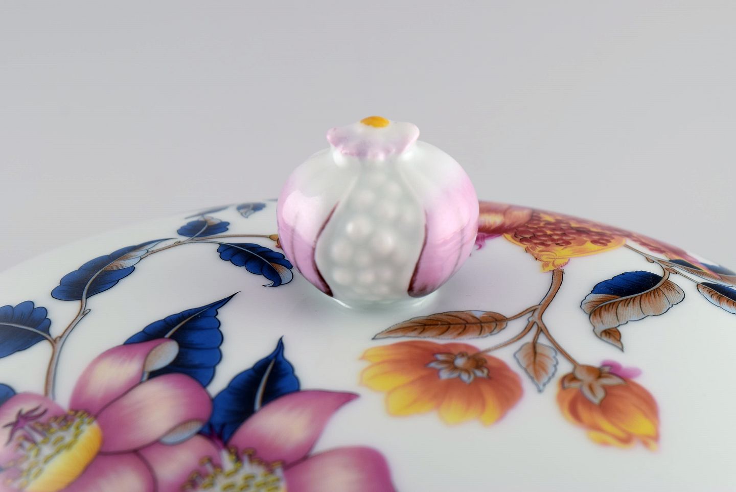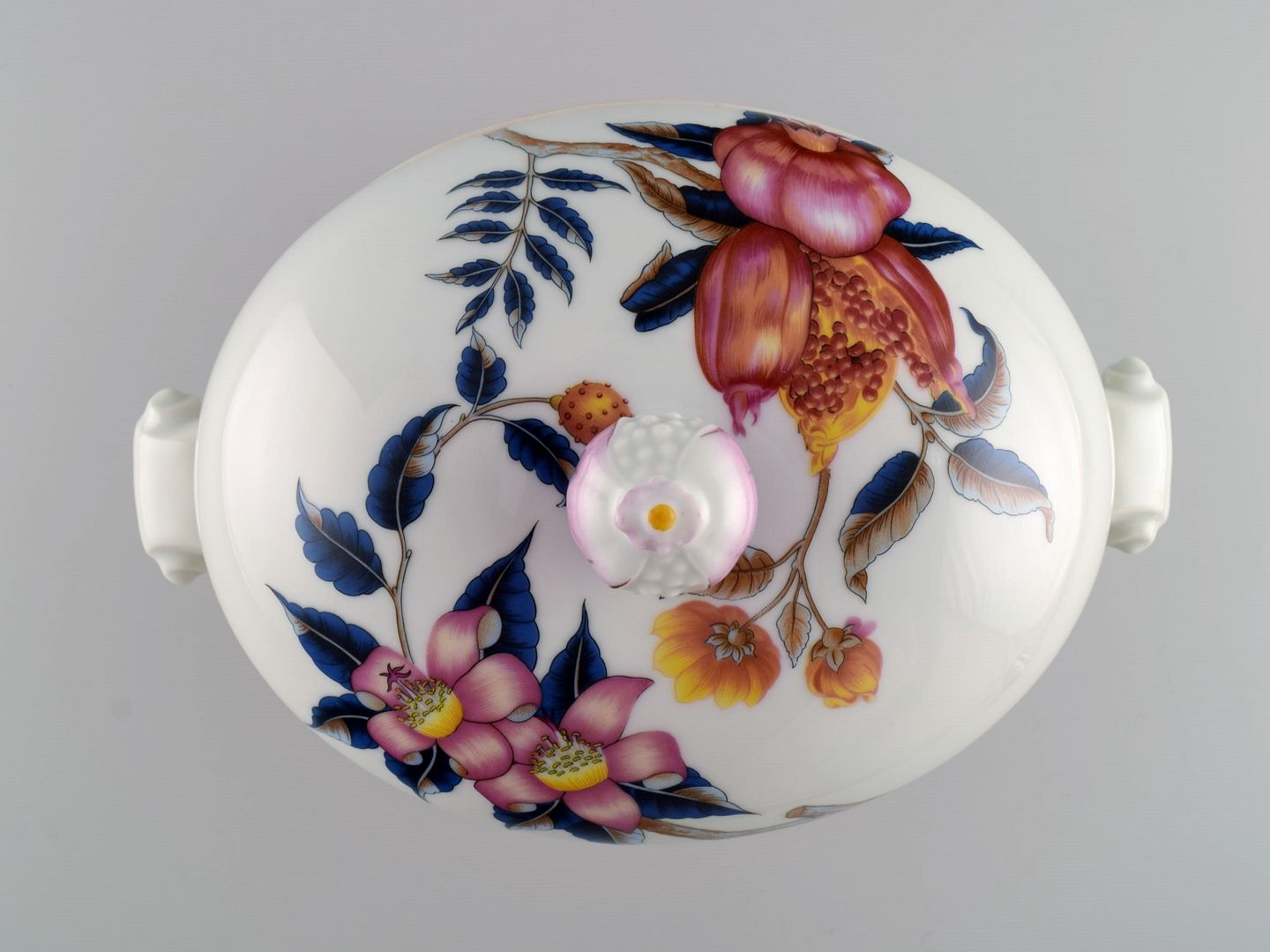Porcelain of Paris. "Tropical Aurore". Porcelain lidded tureen decorated with flowers, pomegranates and bamboo. 1980s. Measures: 28.5 x 19 cm. In excellent condition. Stamped.