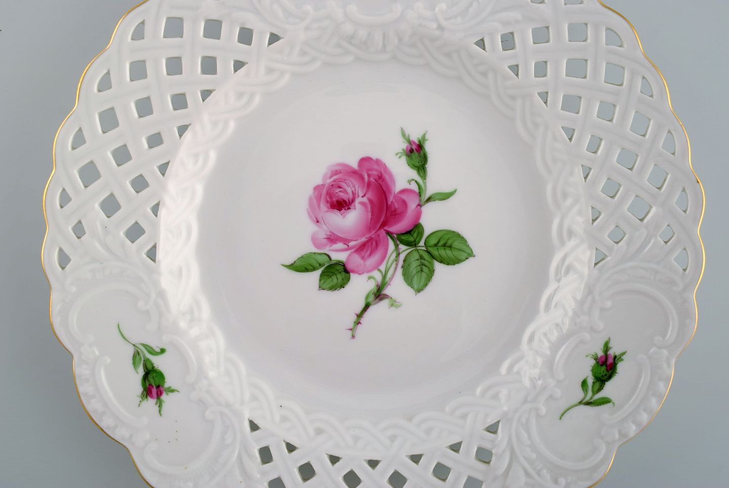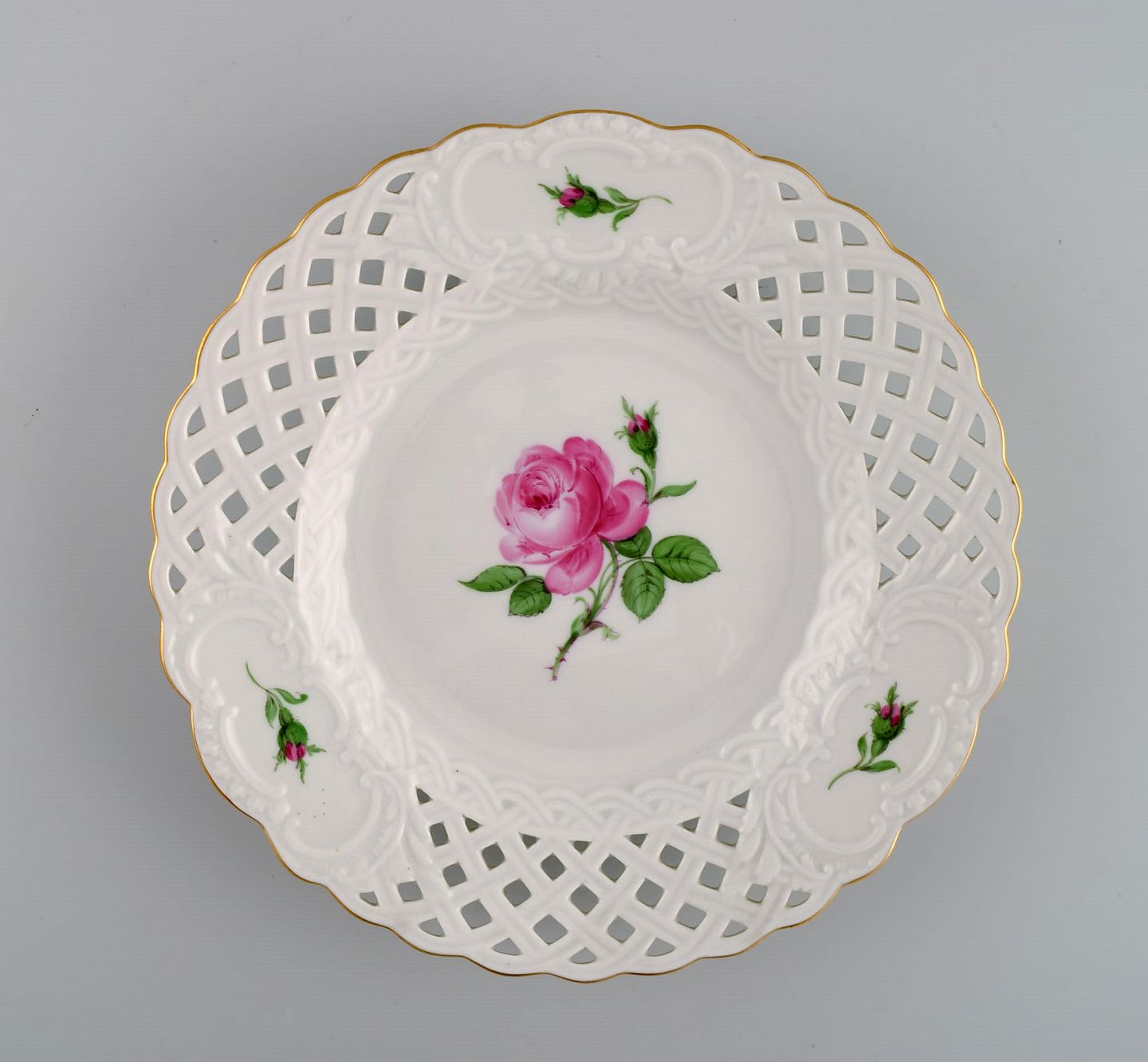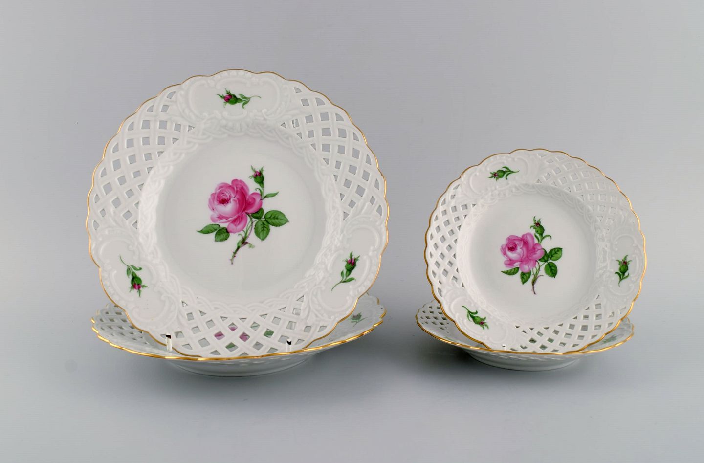 Fire Meissen Pink Rose tallerkener i gennembrudt porcelæn med håndmalede roser og guldkant. Tidligt 1900-tallet. Største diameter: 21 cm. I flot stand. Stemplet. 3. Sortering.