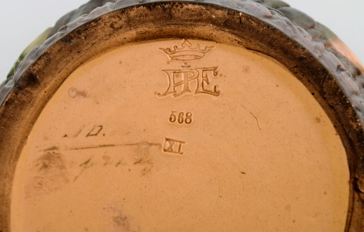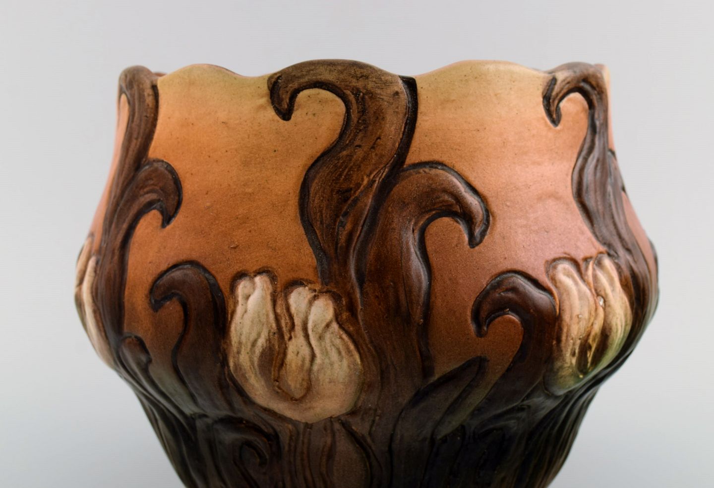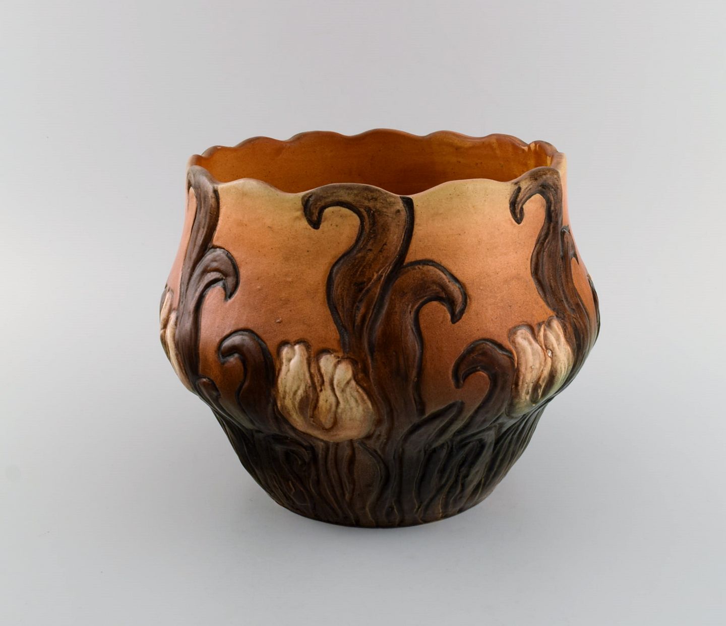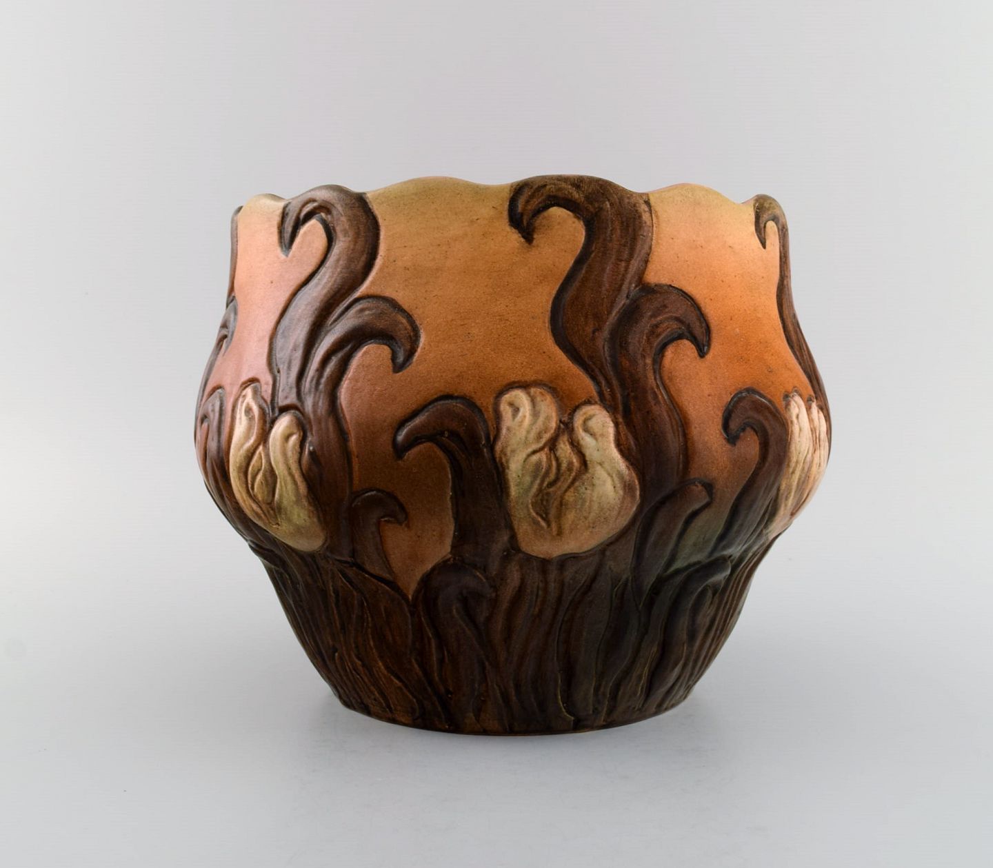Ipsen's, Denmark. Large and rare art nouveau flowerpot in hand-painted and glazed ceramics. 1920s / 30s. Model number 568. Measures: 24 x 18.5 cm. In excellent condition. Stamped.