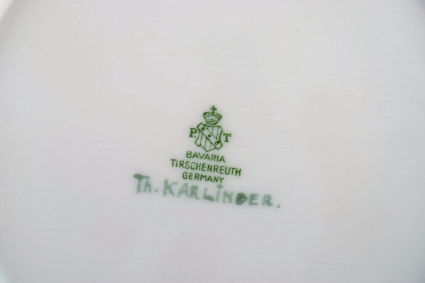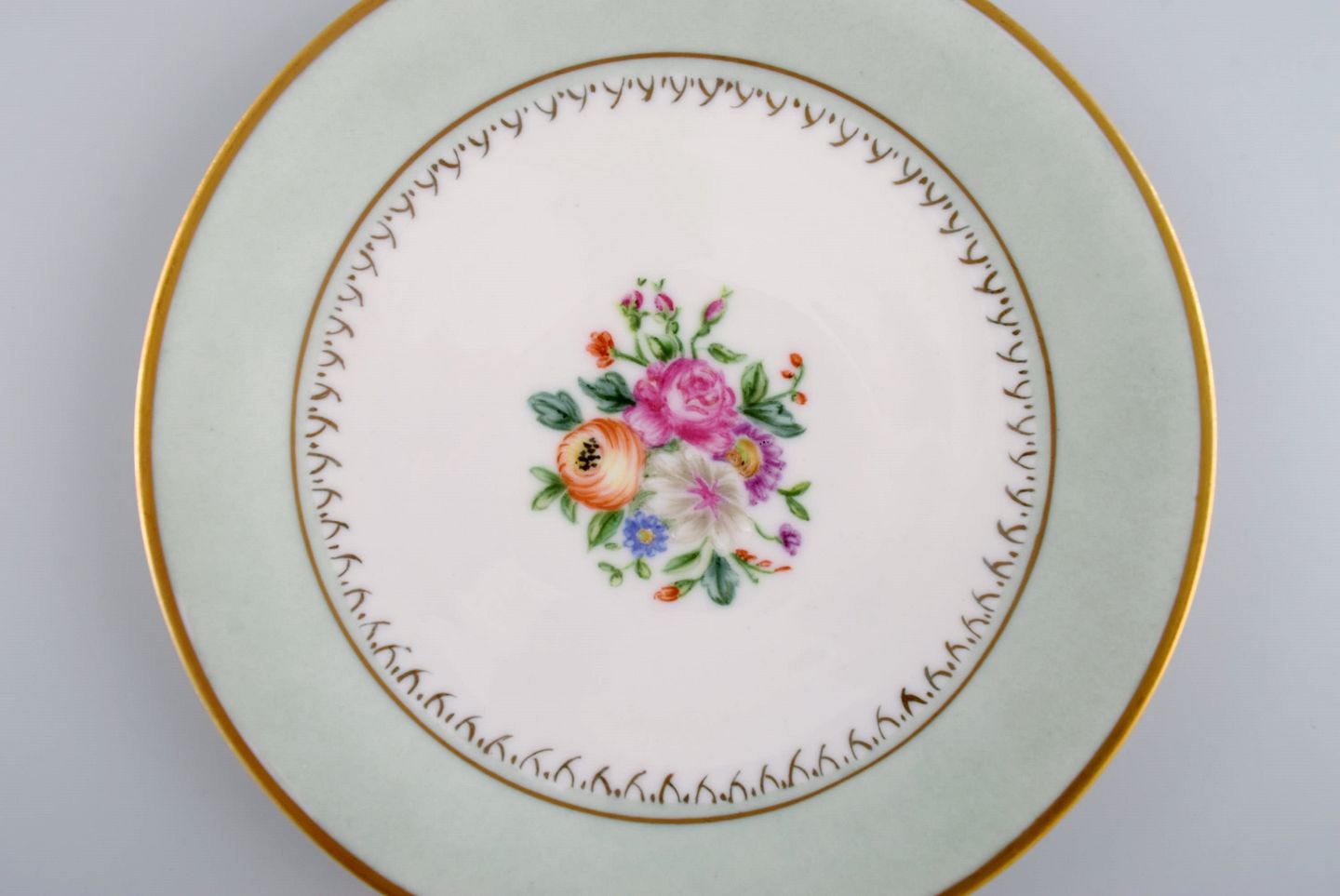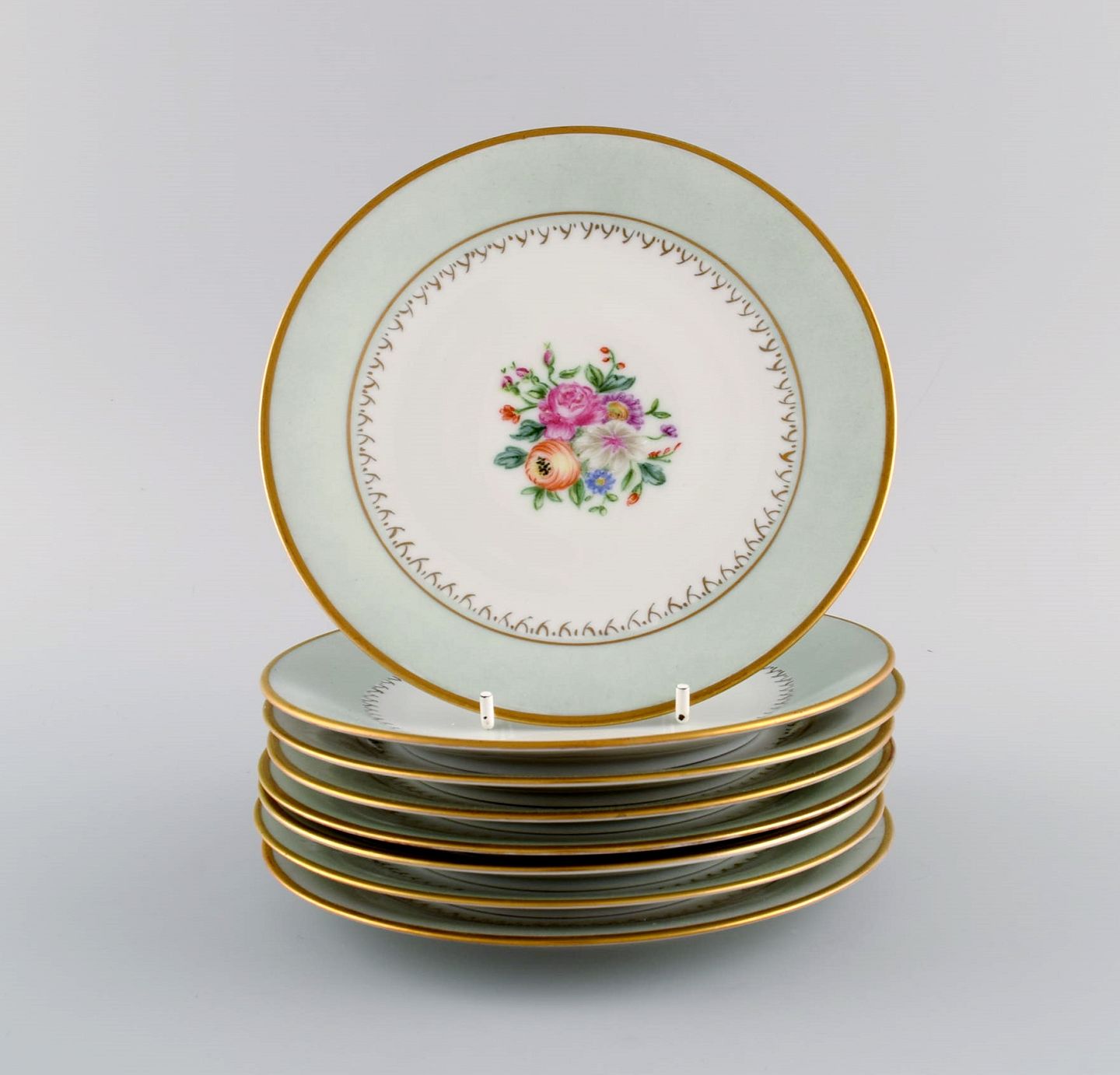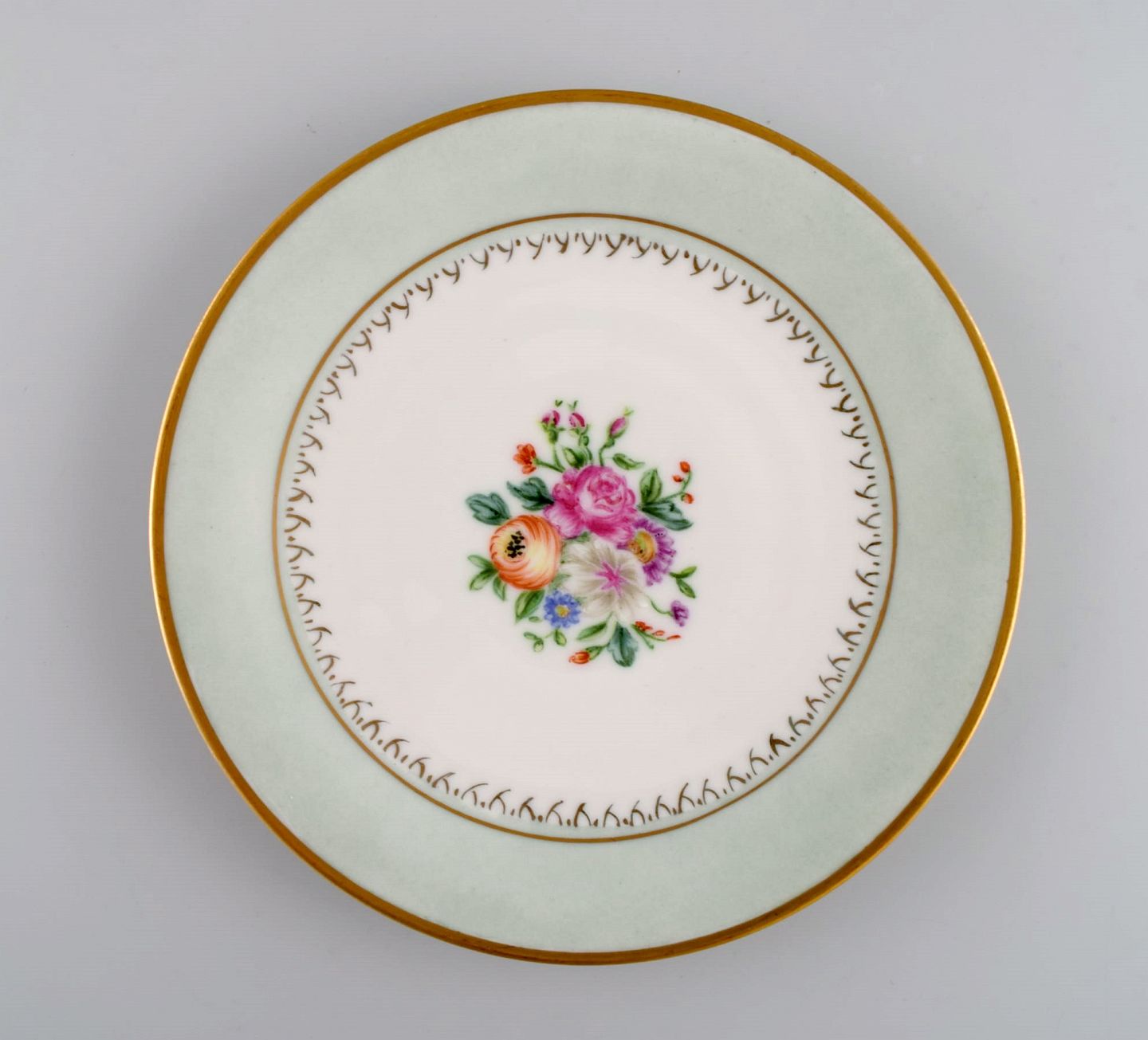 Tirschenreuth, Tyskland. Otte kagetallerkener i håndmalet porcelæn med blomster og gulddekoration. Midt 1900-tallet.