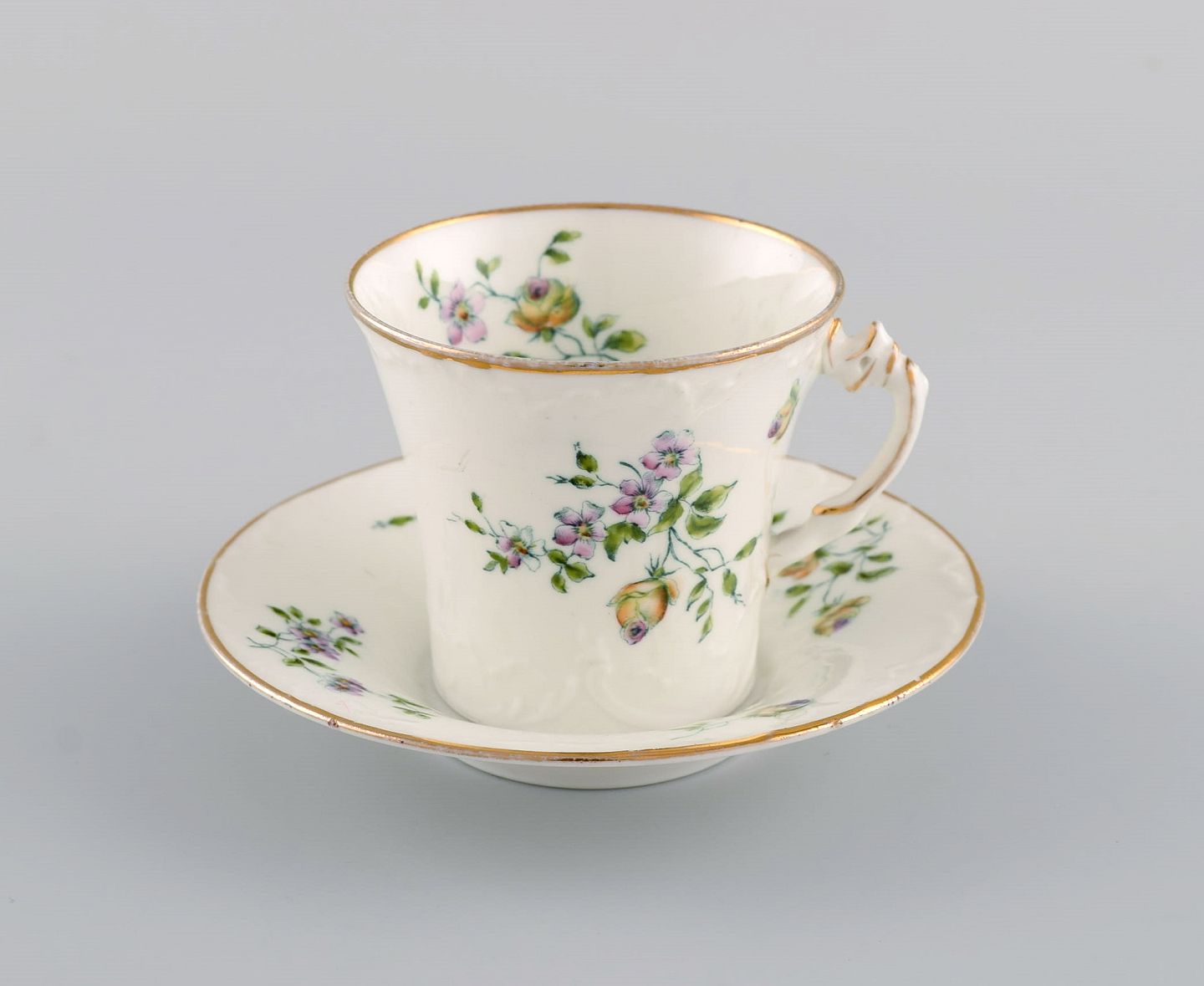 10 Rörstrand kaffekopper med underkopper i håndmalet porcelæn. Blomster, guldkant og bladværk i relief. Ca. 1900. Koppen måler: 7,2 x 6,3 cm. Underkop diameter: 11,8 cm. I flot stand. Signeret.