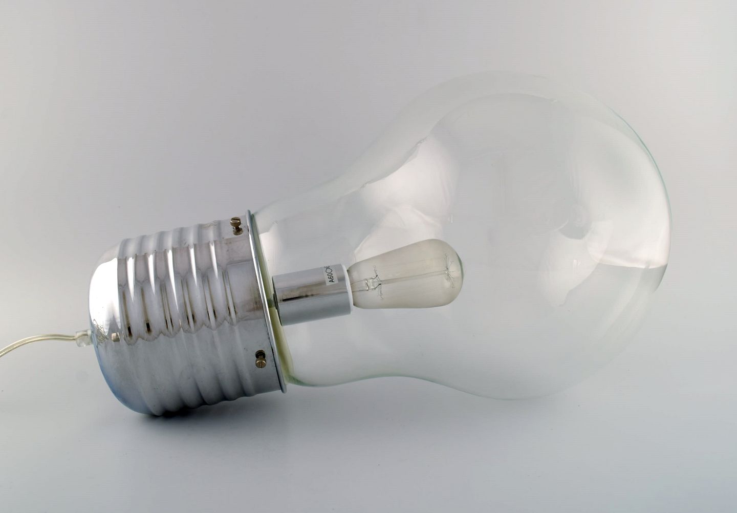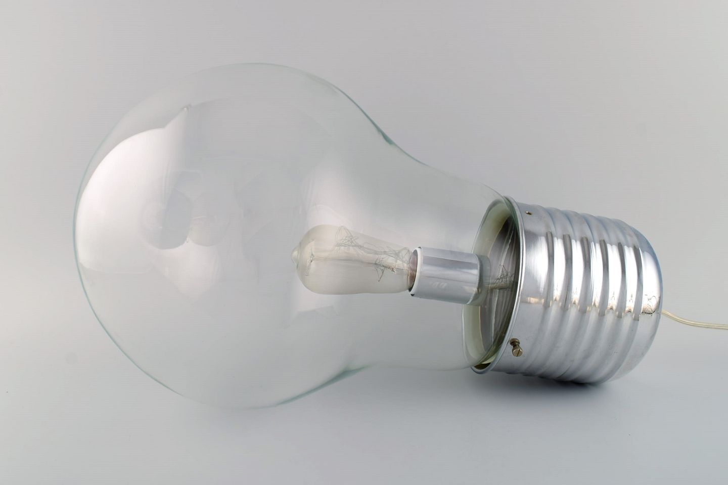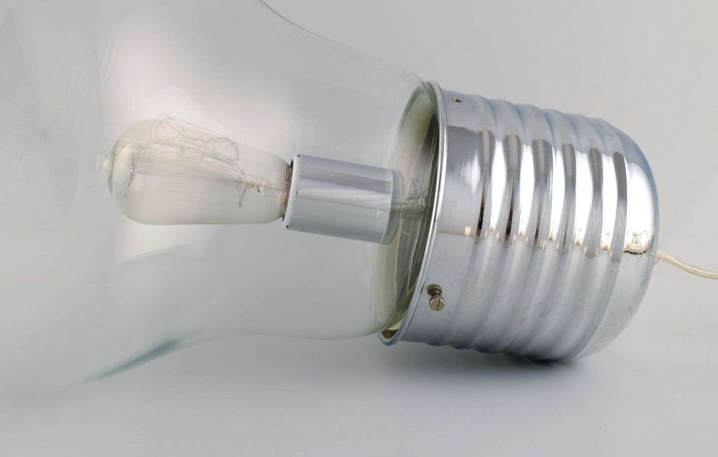 Elpære formet gulvlampe i glas og forkromet metal. Ingo Maurer stil. Sent 1900-tallet. Måler: 49 x 25 cm. I flot stand.