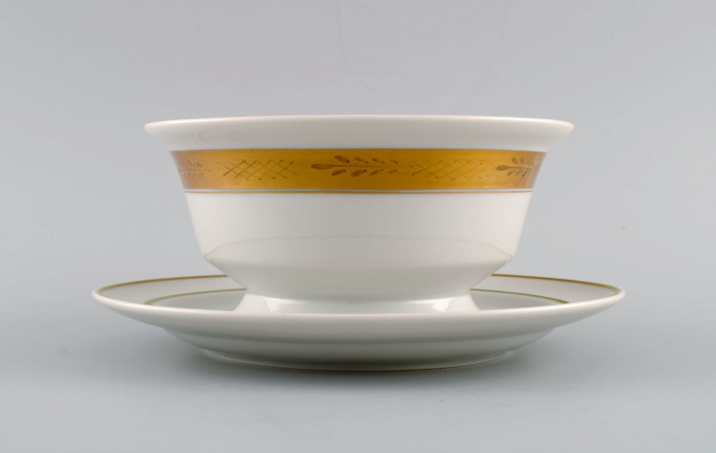 Royal Copenhagen stel nr. 607. Sovseskål i porcelæn. Guldkant med bladværk. Modelnummer 607/9580. Dateret 1944. Måler: 20 x 9 cm. I flot stand. Stemplet. 1. Sortering.
