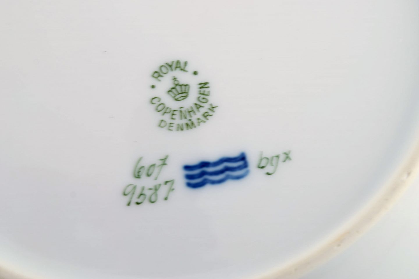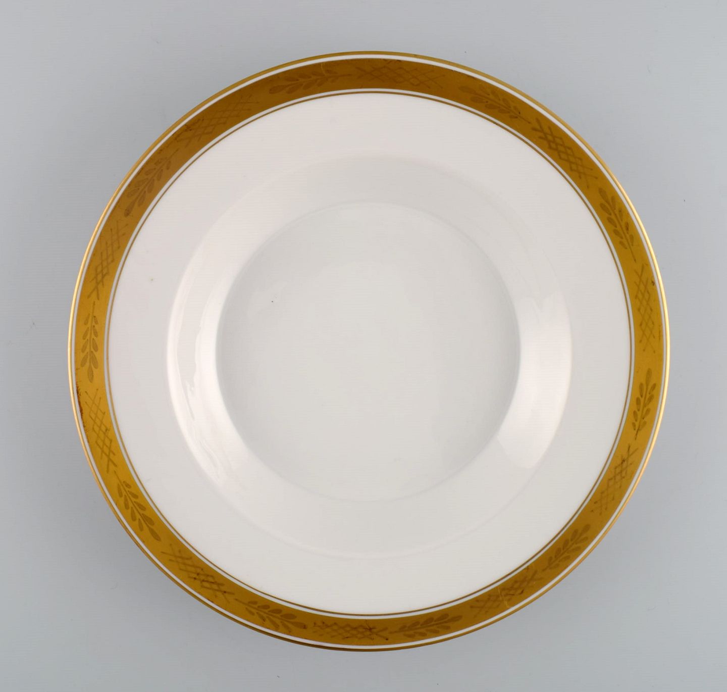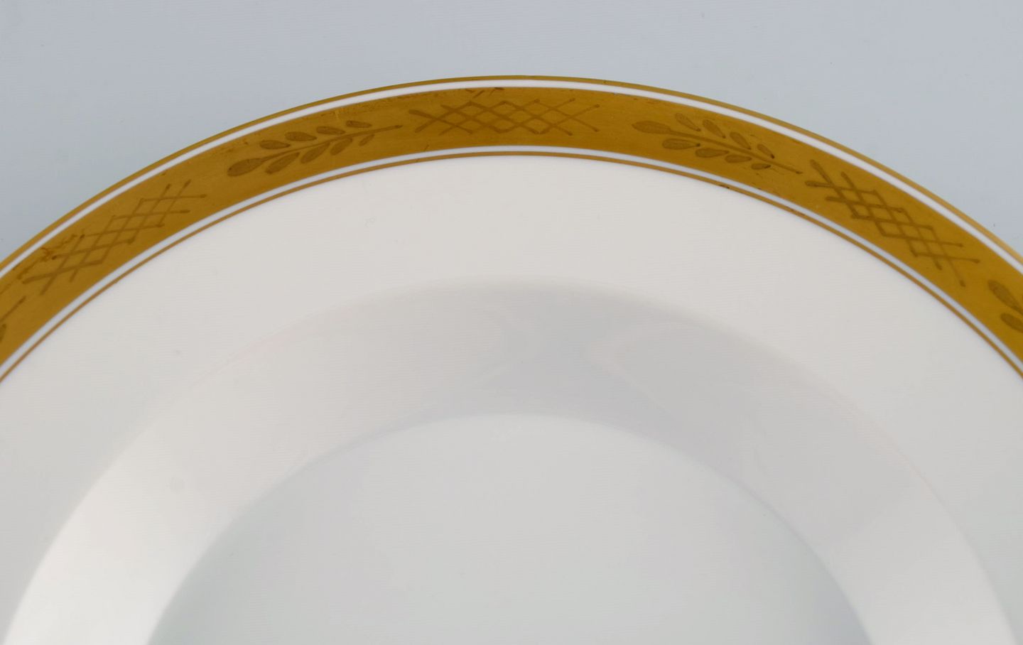 Royal Copenhagen service no. 607. Twelve deep porcelain plates. Gold border with foliage. Model number 607/9587. Dated 1944.