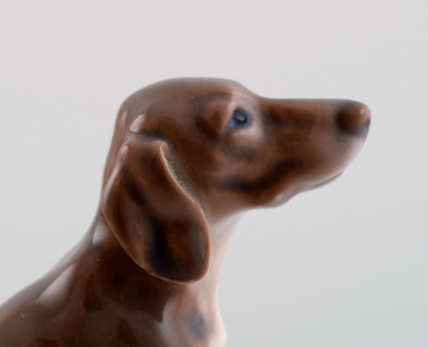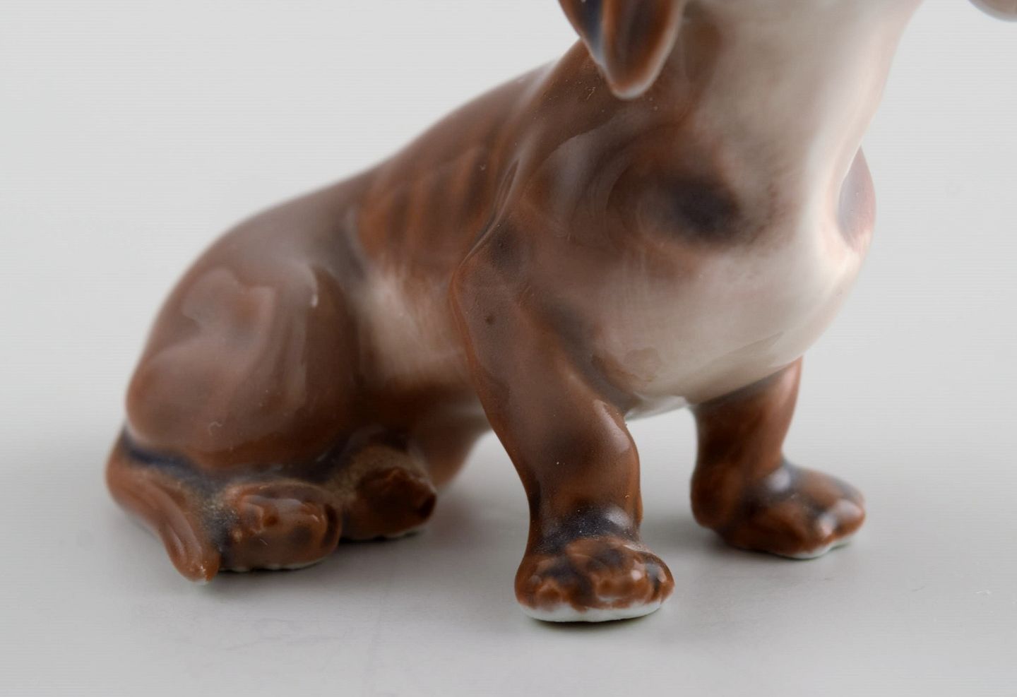 Dahl Jensen porcelain figure. Dachshund. 1920s/30s. Measures: 6 x 5 cm. In excellent condition. Signed: Royal crown, DJ Copenhagen.