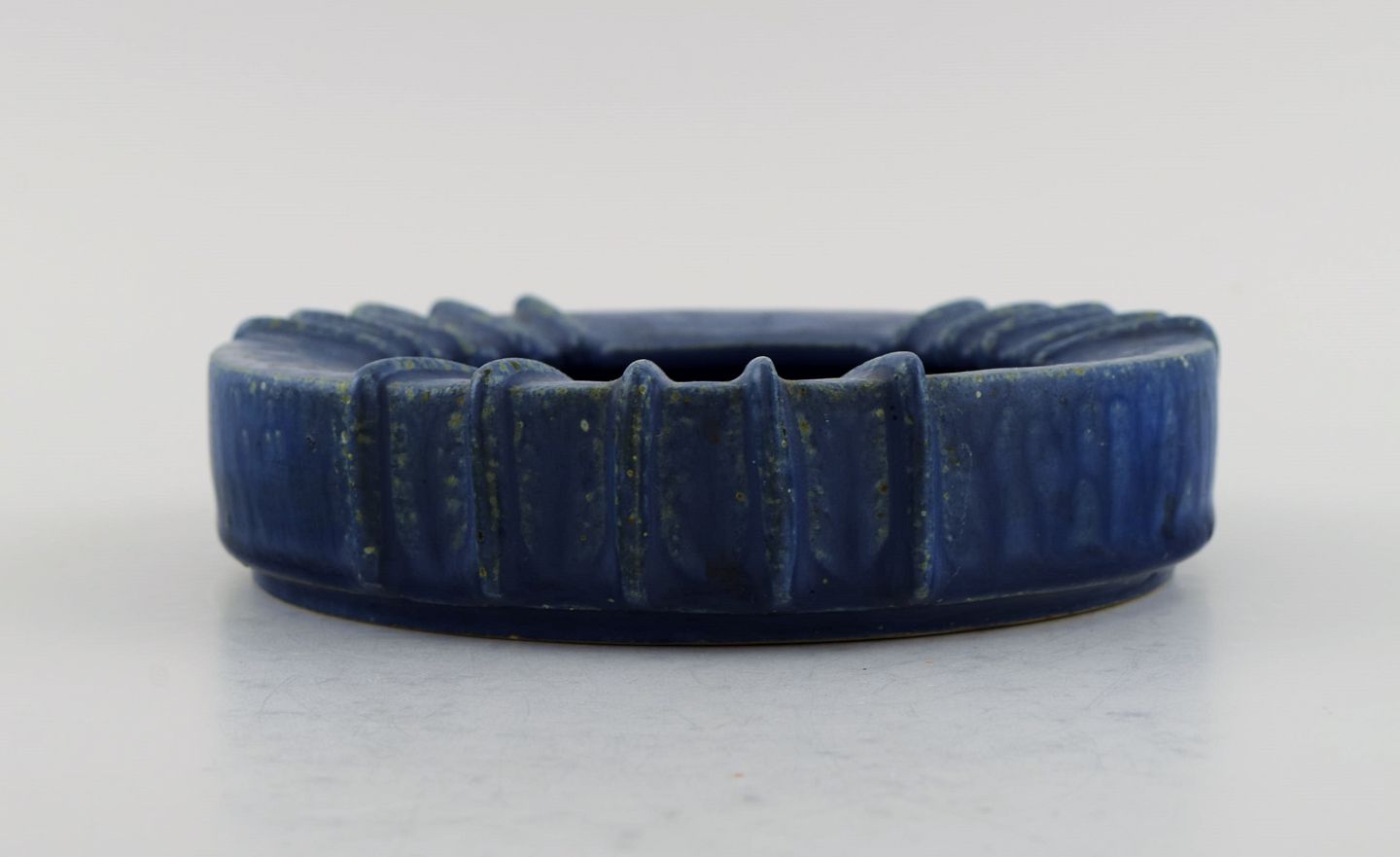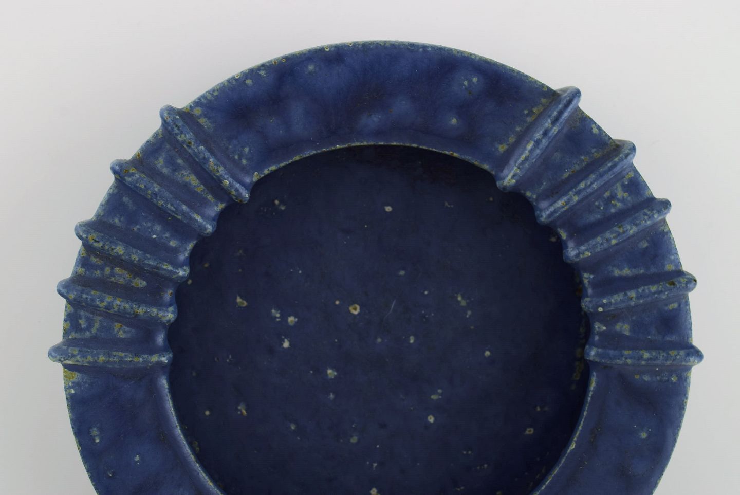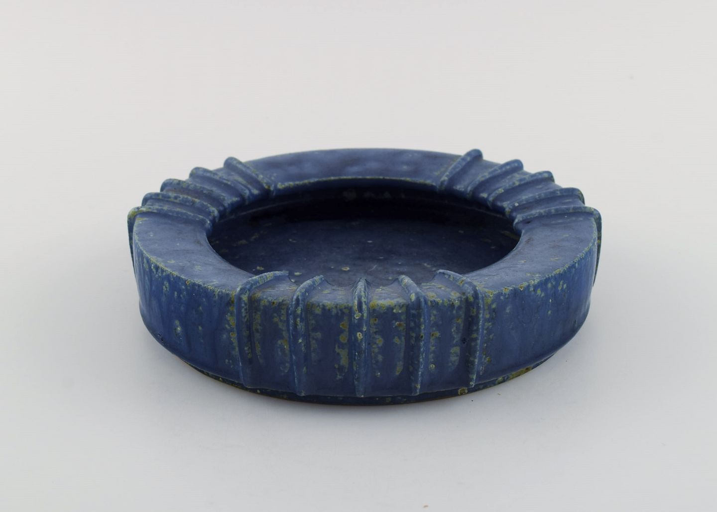 Arne Bang (1901-1983), Danmark. Rund skål i glaseret keramik med riflet kant. Smuk glasur i blå nuancer. 1940'erne. Måler: 16,5 x 4 cm. I flot stand. Signeret i monogram.
