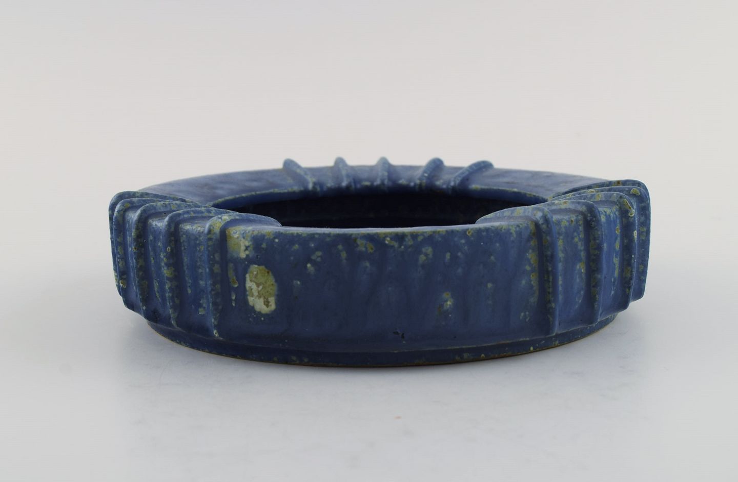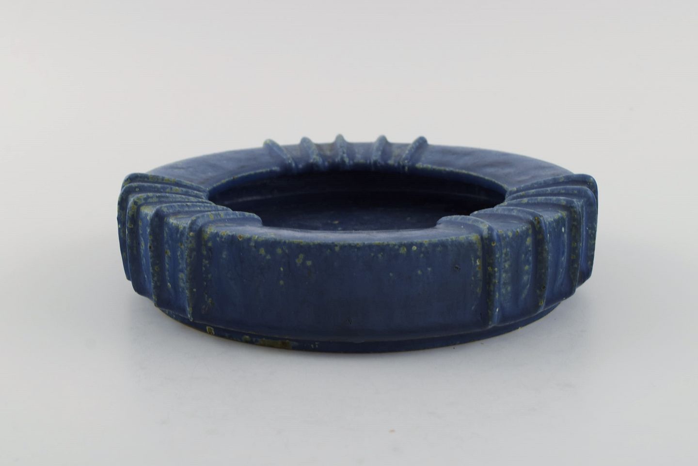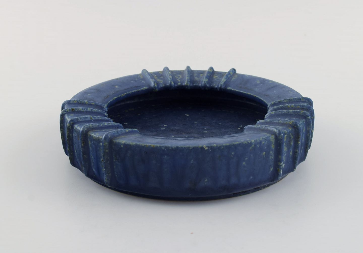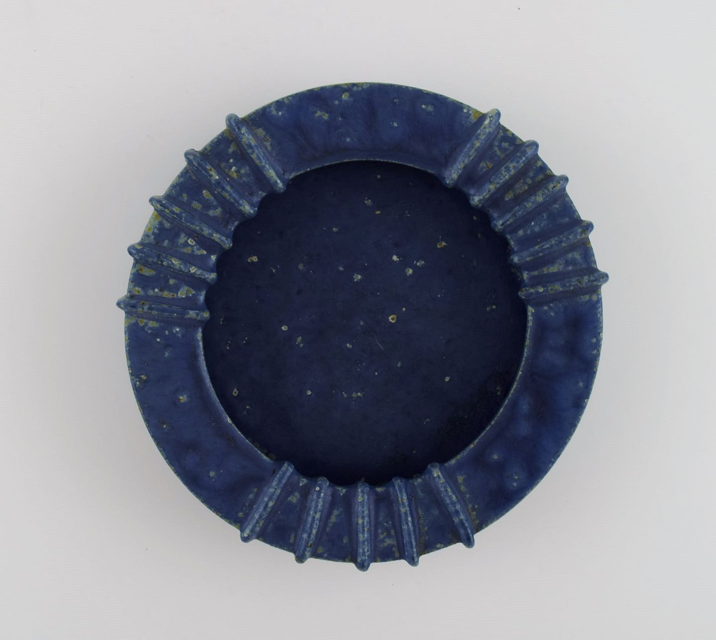 Arne Bang (1901-1983), Danmark. Rund skål i glaseret keramik med riflet kant. Smuk glasur i blå nuancer. 1940'erne. Måler: 16,5 x 4 cm. I flot stand. Signeret i monogram.