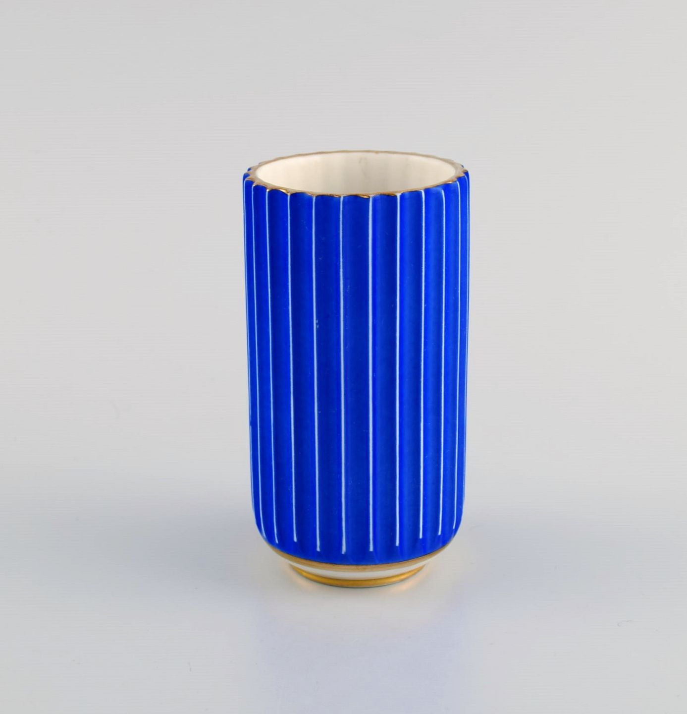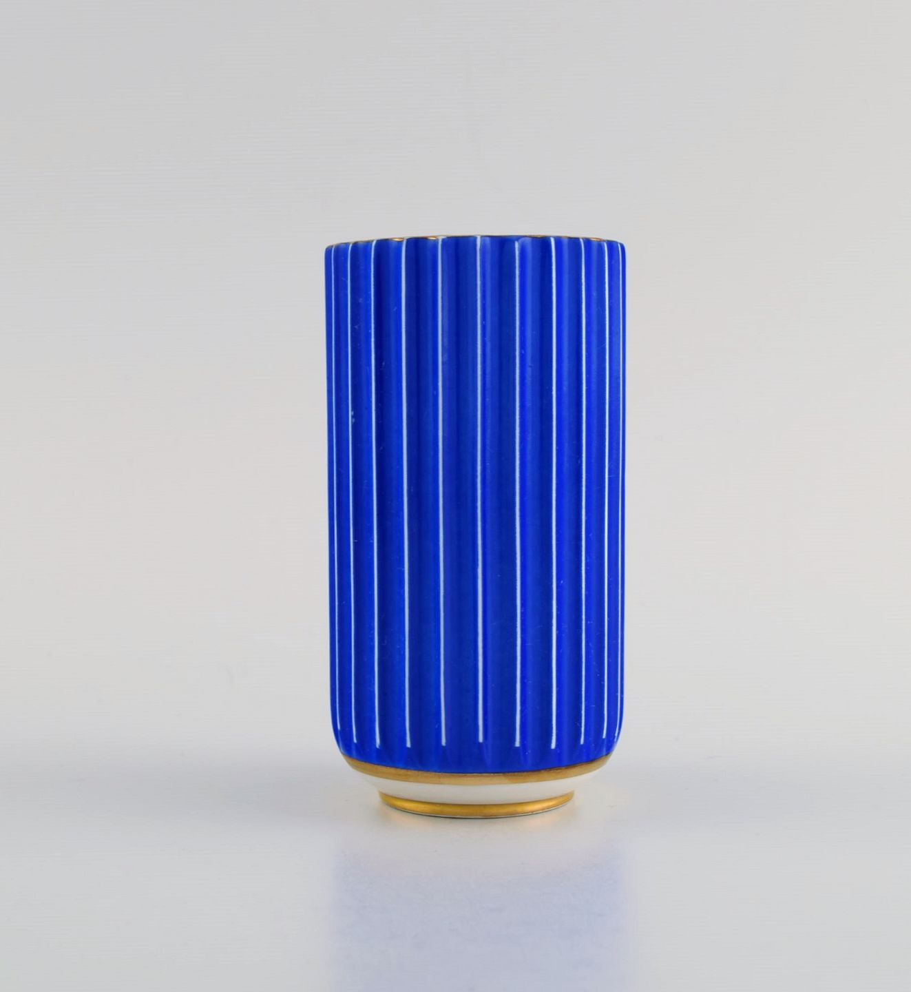 Tidlig blå Lyngby porcelænsvase i med gulddekoration. Midt 1900-tallet. Måler: 10,3 x 5,5 cm. I flot stand. Stemplet.