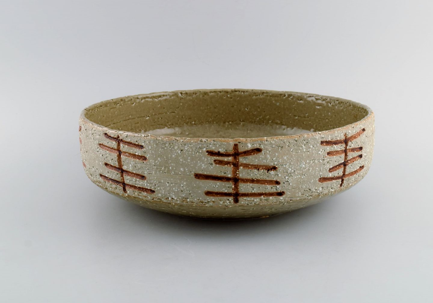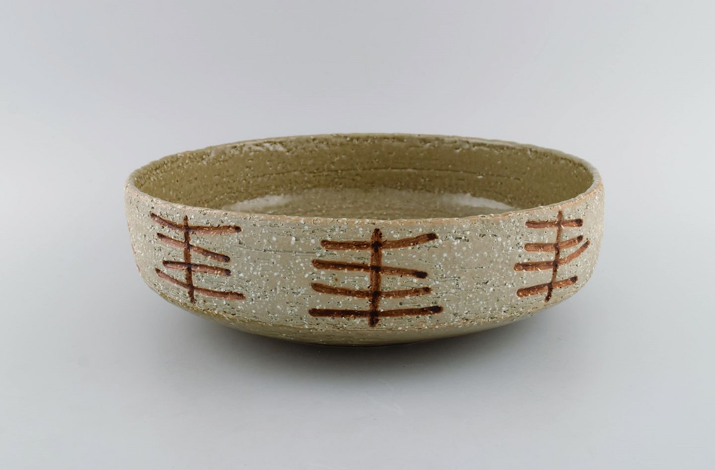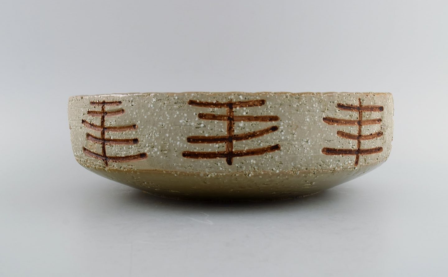 Hertha Bengtson (1917-1993) for Rörstrand. Stor unika skål i glaseret stentøj. Midt 1900-tallet. Måler: 30 x 9 cm. I flot stand. Signeret.
