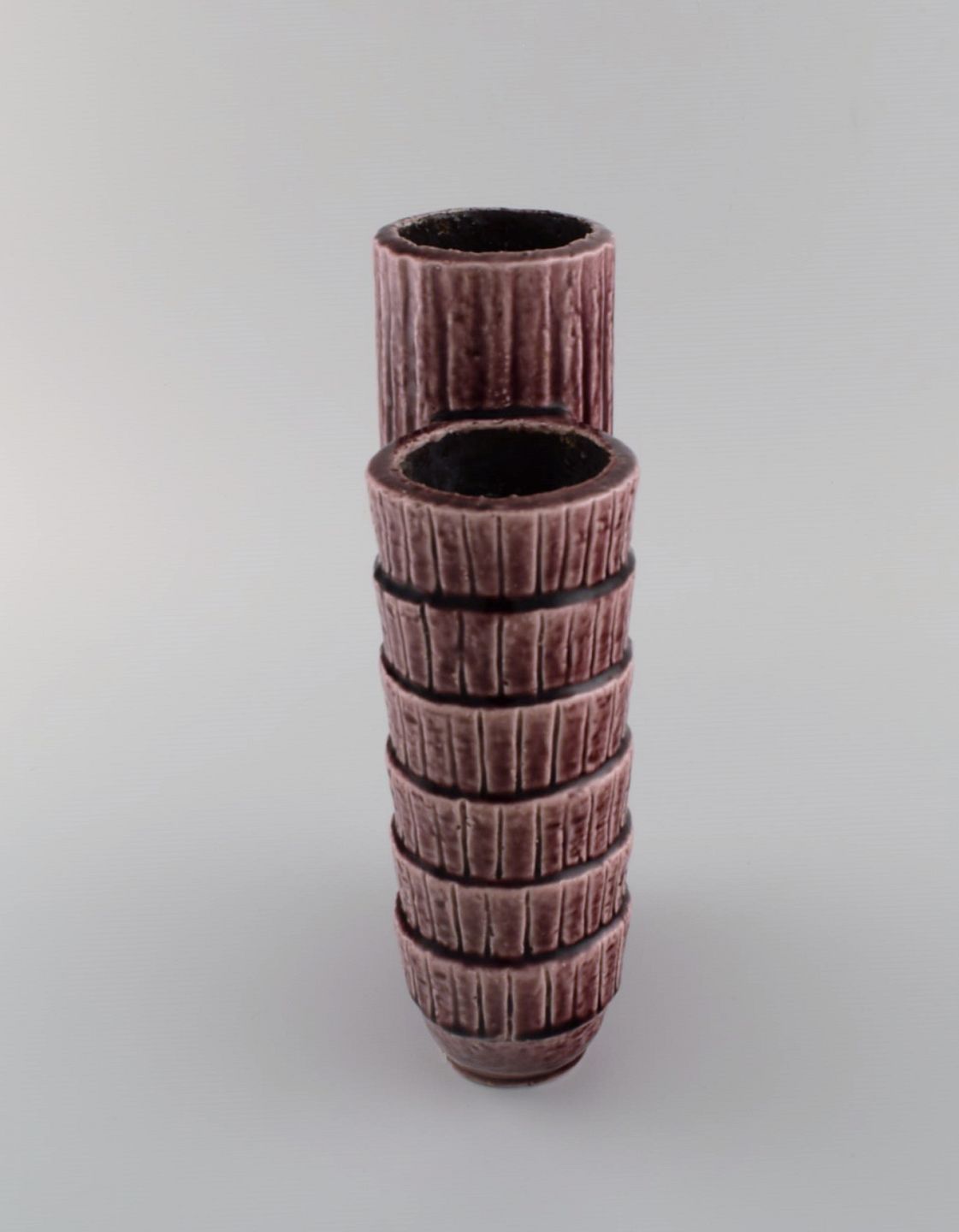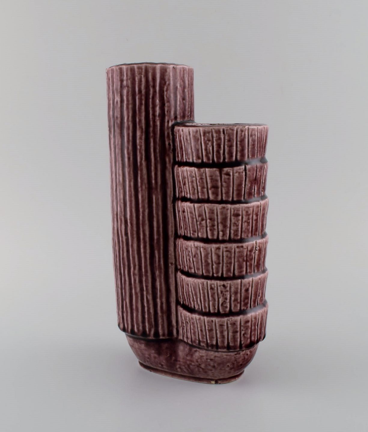 Gunnar Nylund (1904-1997) for Rörstrand. Chamotte vase i glaseret keramik. Smuk glasur i lysviolette nuancer. Midt 1900-tallet. Måler: 25 x 14 cm. I flot stand. Stemplet. 1. Sortering.